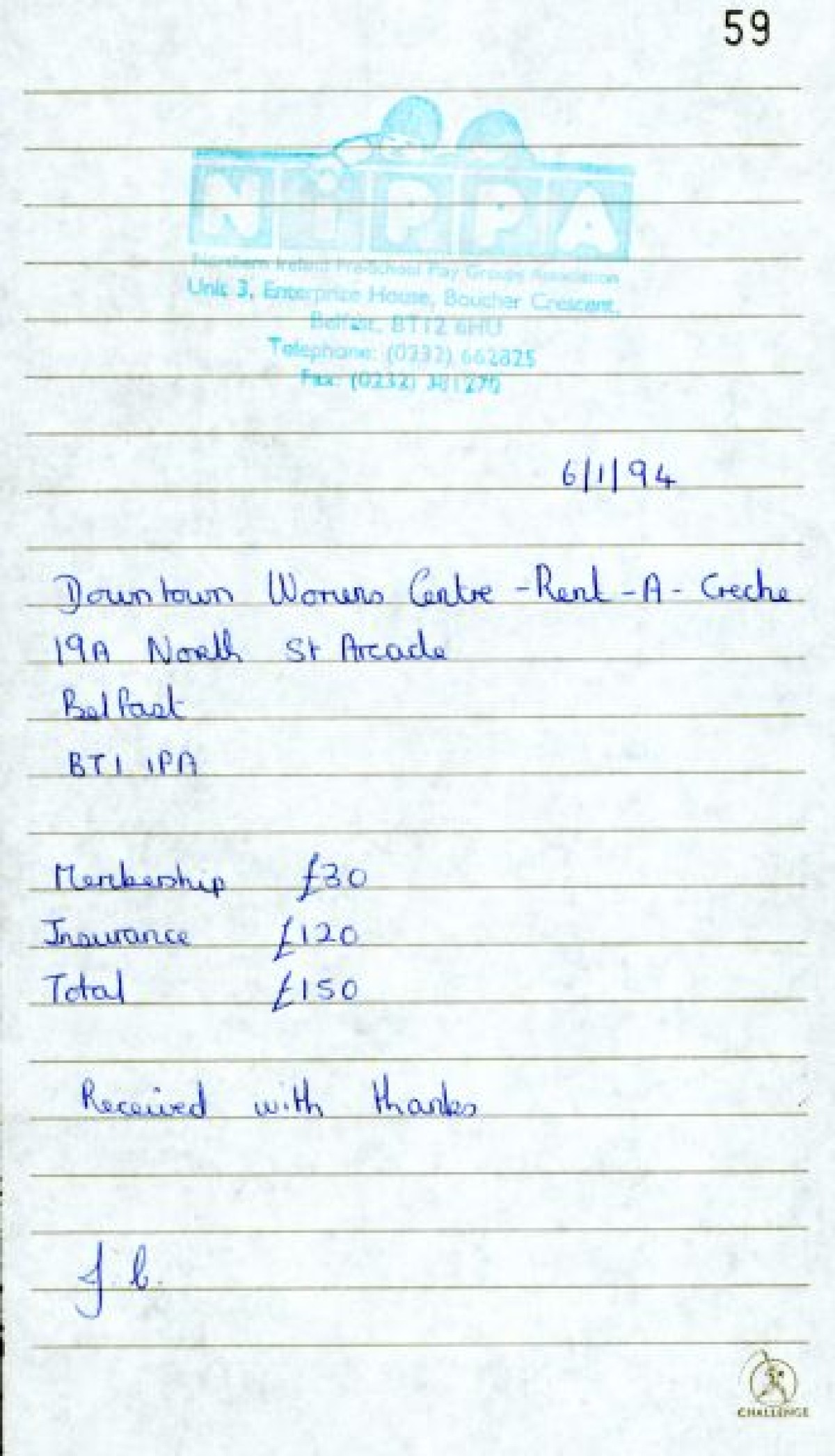 A 1994 membership pack for the Northern Ireland Pre-School Playgroup Association, containing handwritten membership details for 'Rent-A-Creche'.