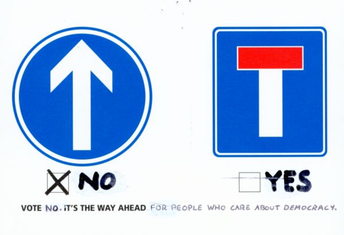 Northern Ireland Women's Coalition encouraging the electorate to vote 'yes' in the upcoming Good Friday Agreement/Belfast Agreement Referendum. The item has been marked over in pen, the 'yes' has been erased and replaced by 'no'. The reserve side of the card has a handwritten statement that reads 'women know your limits'.