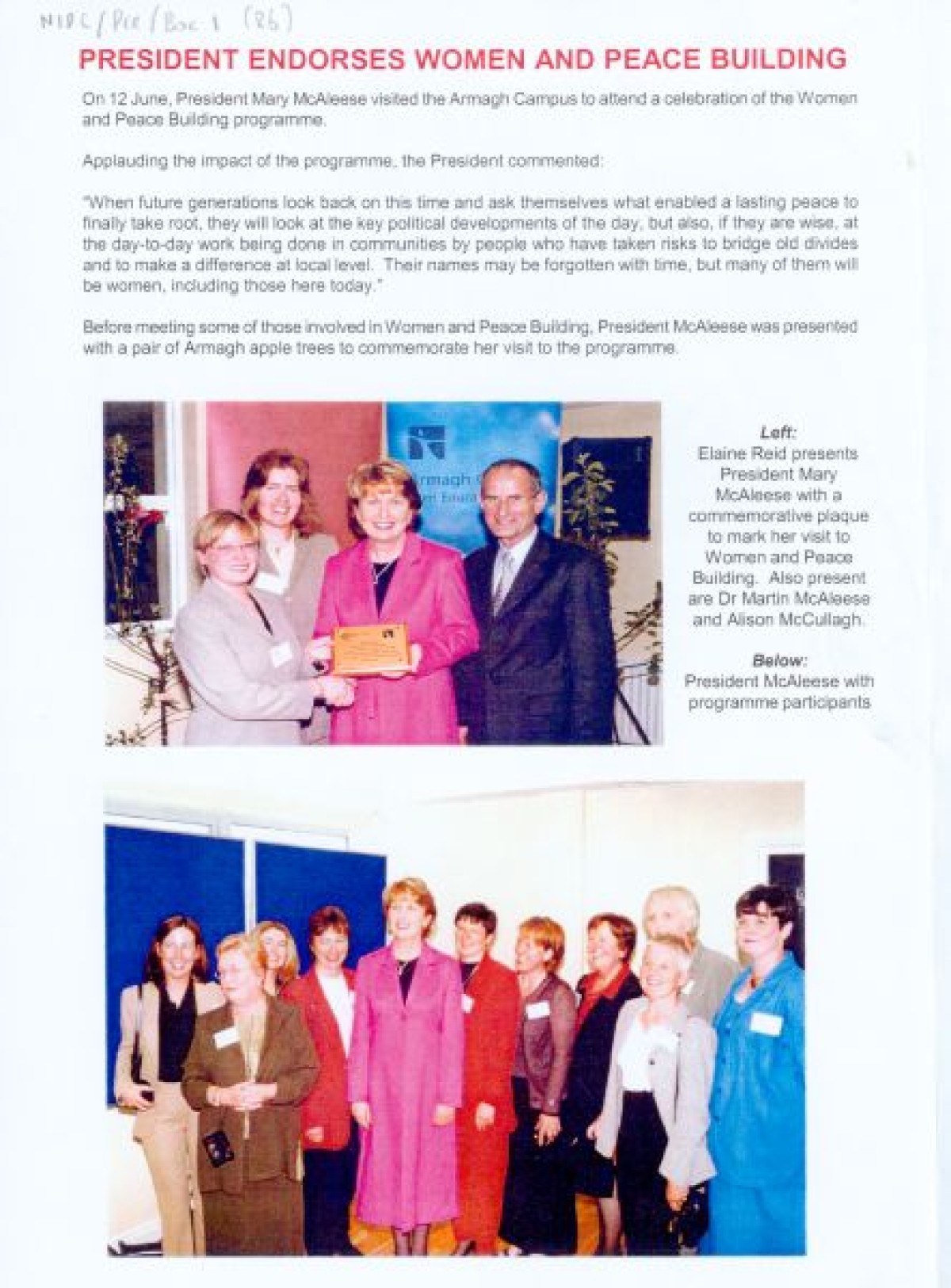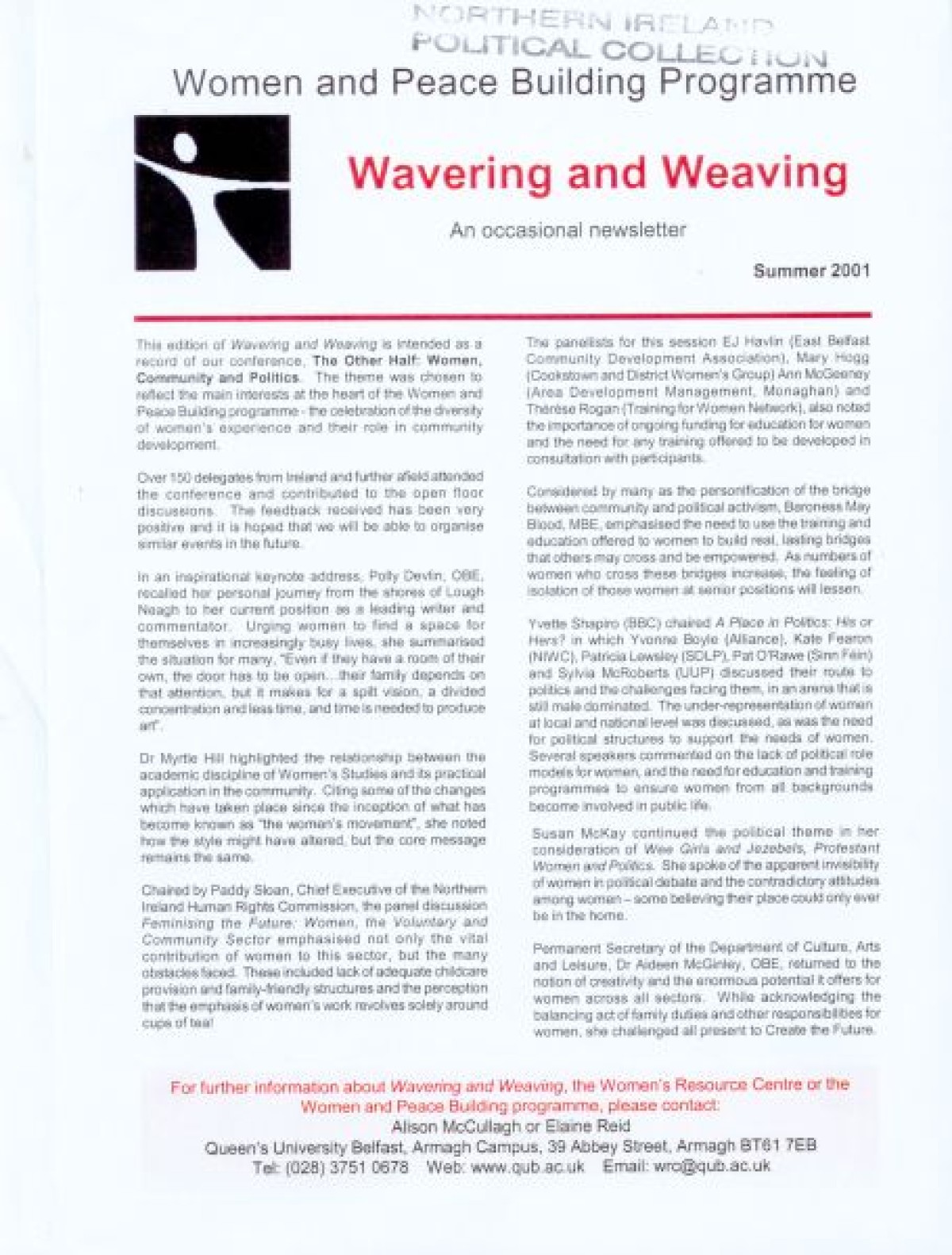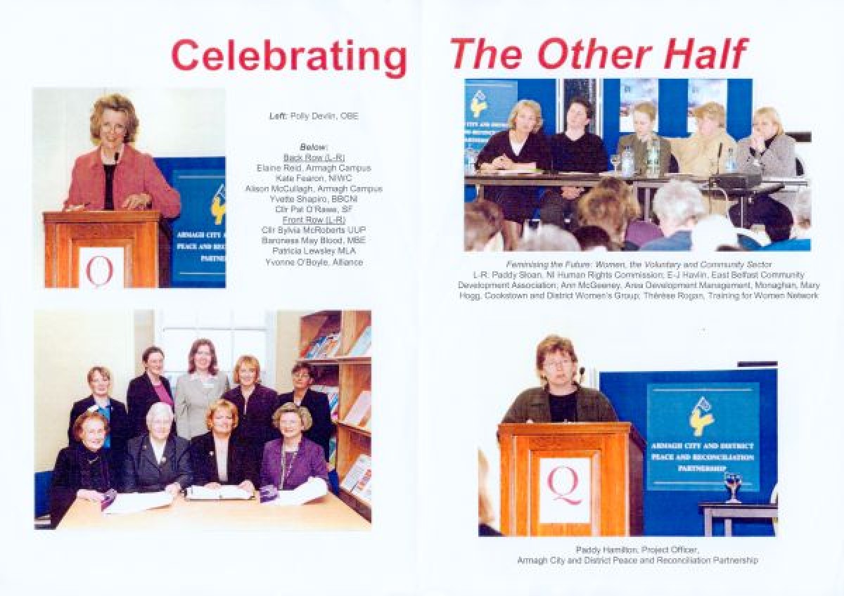 Women and Peace Building Programme to document a conference celebrating women's diverse experiences and roles in community life, titled "The Other Half: Women, Community and Politics". Contents include a summary overview of the conference, and colour photographs of participants and attendees, including Polly Devlin, OBE, Elaine Reid, Kate Fearon, Alison McCullagh, Yvette Shapiro, Cllr Pat O’Rawe, Cllr Sylvia McRoberts, Baroness May Blood, MBE, Patricia Lewsley, Yvonne O’Boyle, Paddy Sloan, E-J Havlin, Ann McGeeney, Mary Hogg, Thérèse Rogan, Paddy Hamilton, and President Mary McAleese.