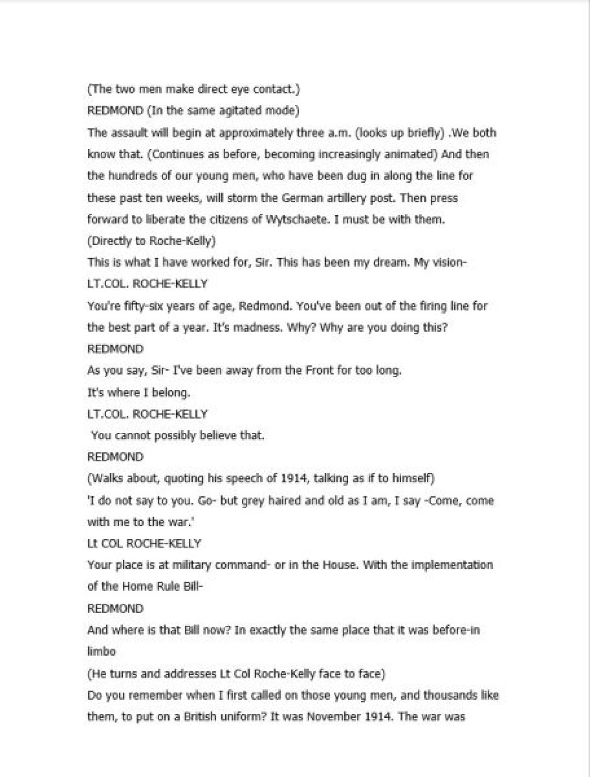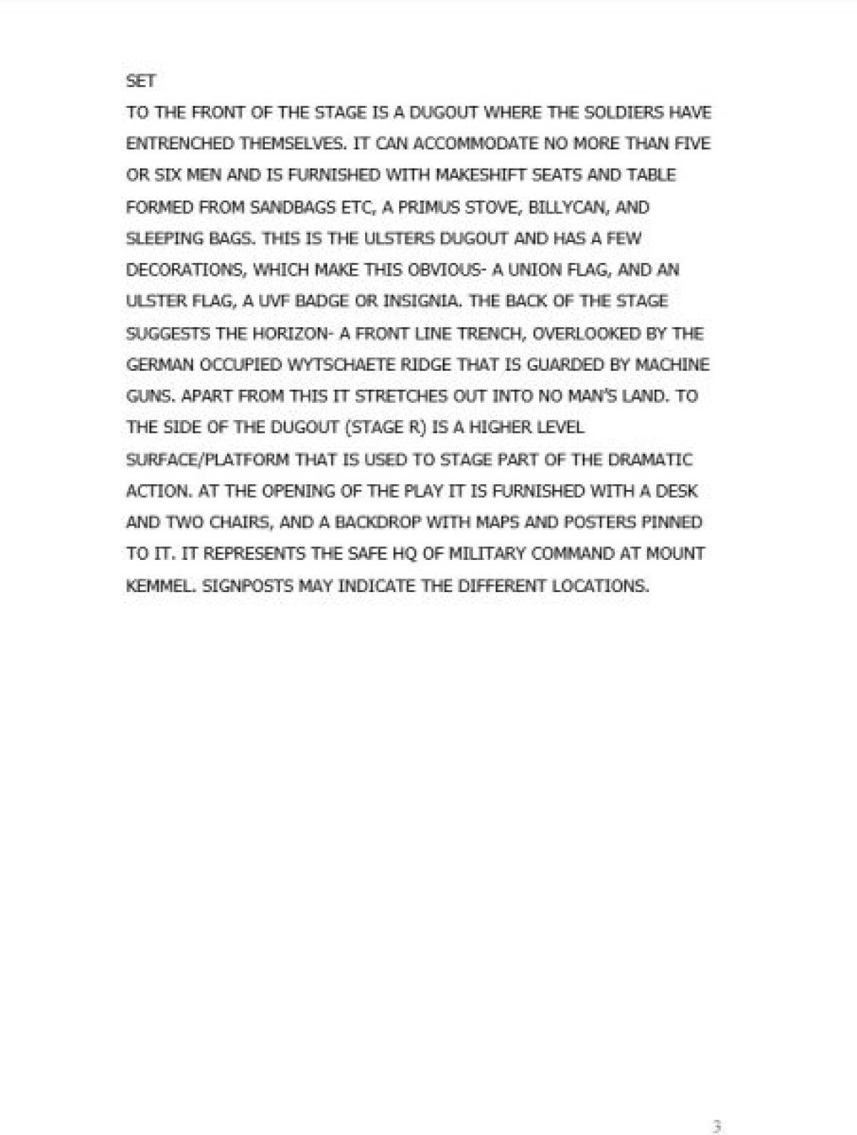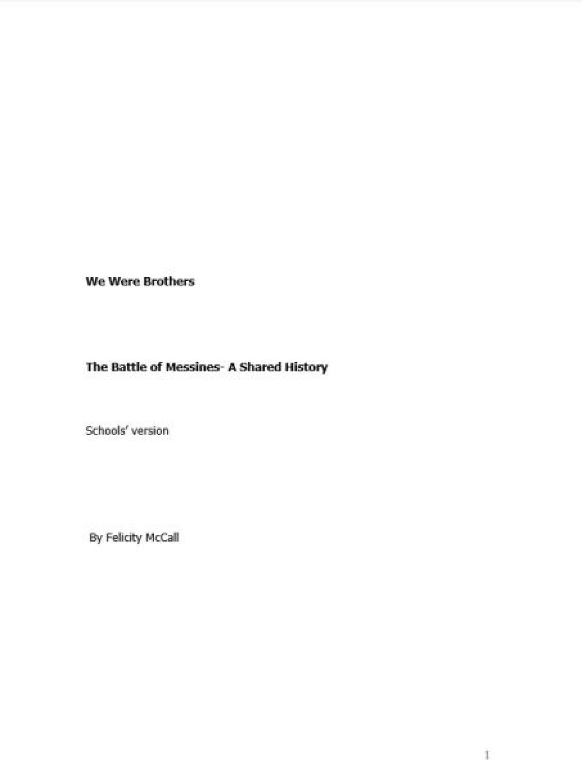 Extract from a script for 'We Were Brothers' (schools' version) by Irish playwright, Felicity McCall. The play was based on the Battle of Messines in 1917 when Ulster soldiers and Irish Battalions of the British fought together to liberate Belgium from German occupation. McCall's play promoted reconciliation through an understanding of a shared history. Full version available to view at the Linen Hall Library upon request.