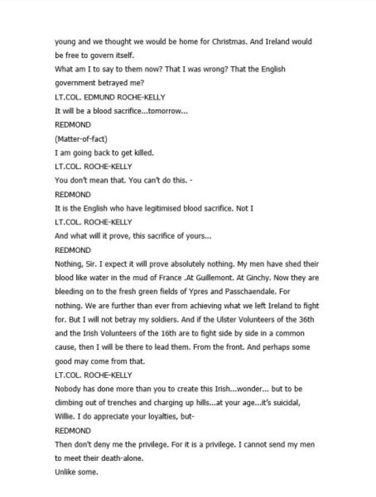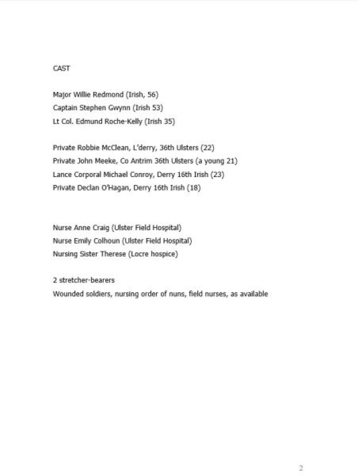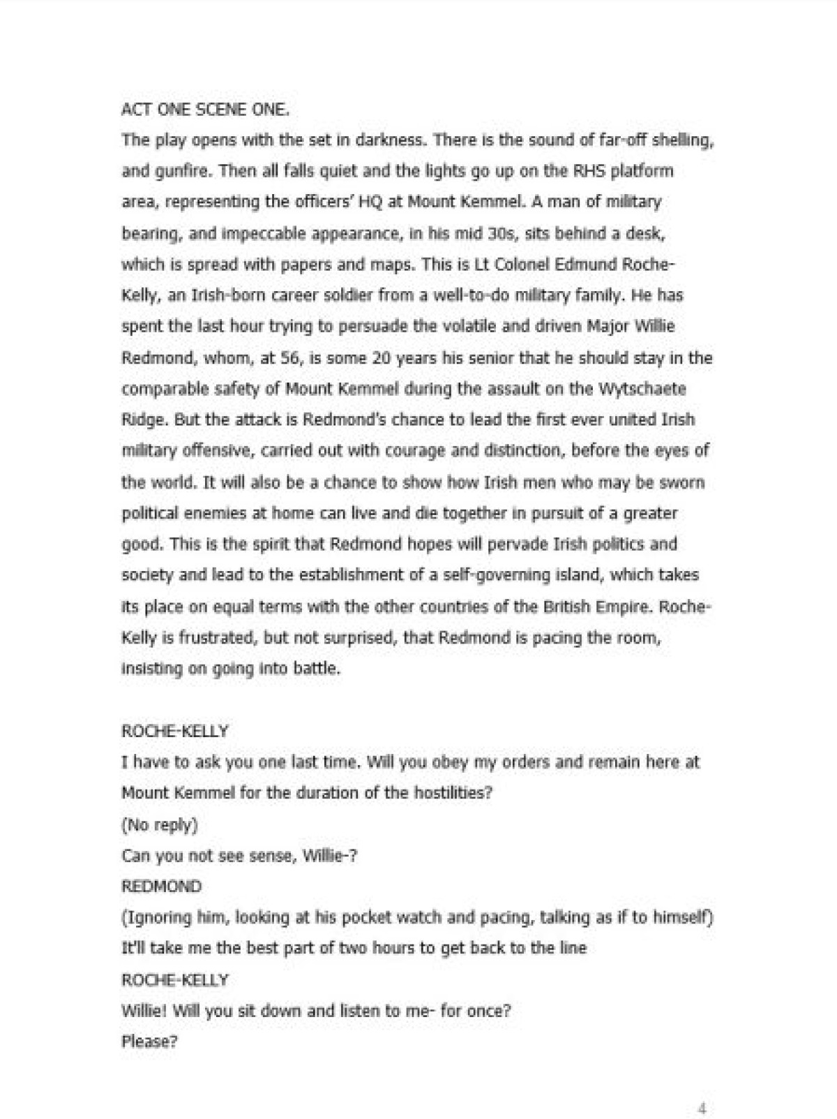 Extract from a script for 'We Were Brothers' (schools' version) by Irish playwright, Felicity McCall. The play was based on the Battle of Messines in 1917 when Ulster soldiers and Irish Battalions of the British fought together to liberate Belgium from German occupation. McCall's play promoted reconciliation through an understanding of a shared history. Full version available to view at the Linen Hall Library upon request.