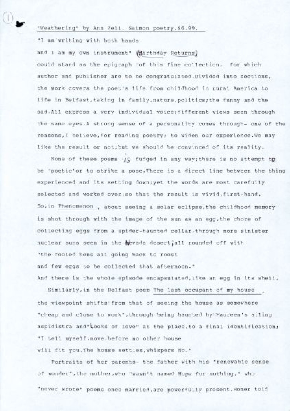 Weathering (Salmon Press, 1998), written by Sally Wheeler. Includes comments on poems "Birthday Returns," "Phenomenon," "The last occupant of my house," and "Villanelle of the garden birds."