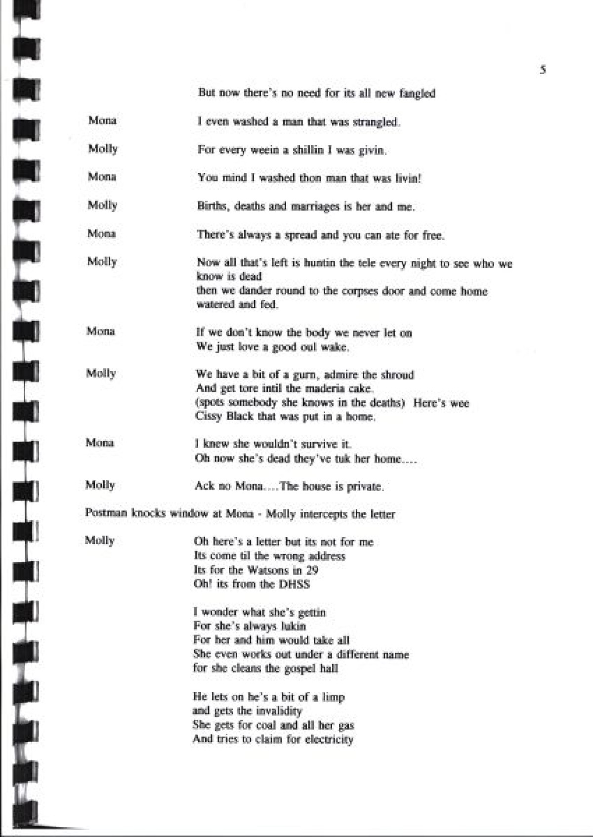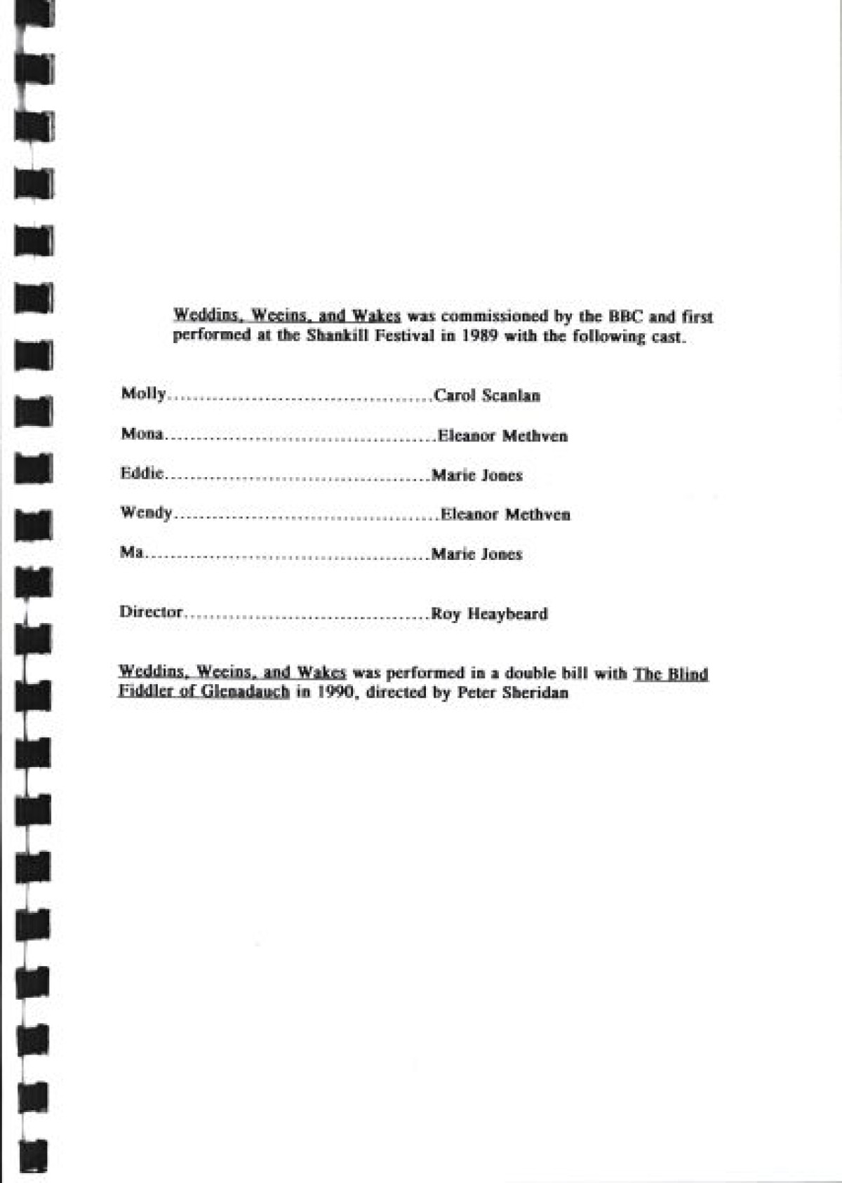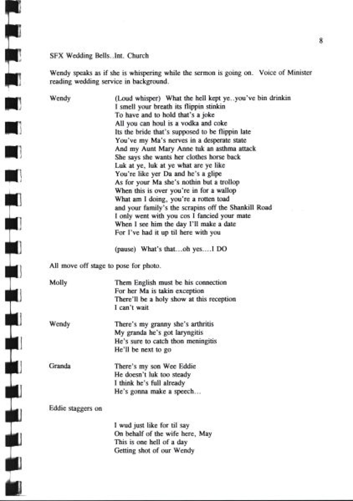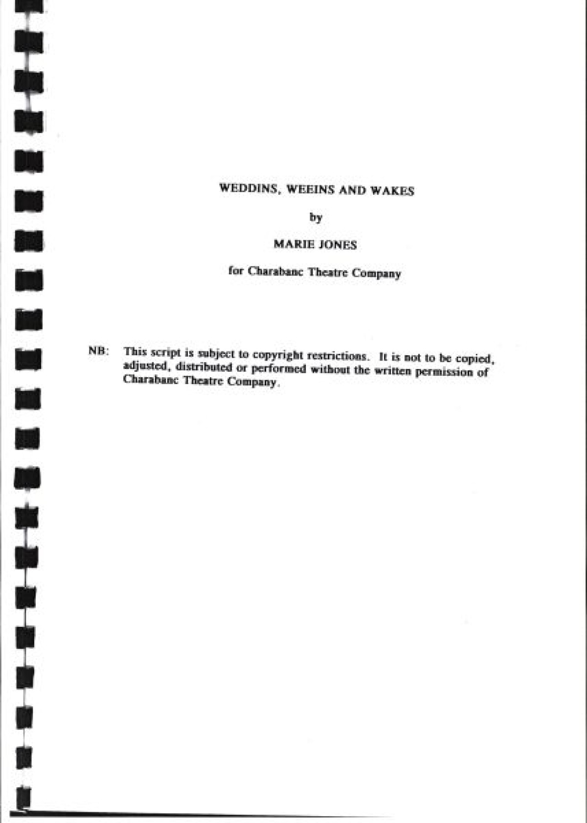 Extract from a photocopied script for 'Weddins, Weeins and Wakes,' by playwright Marie Jones, for