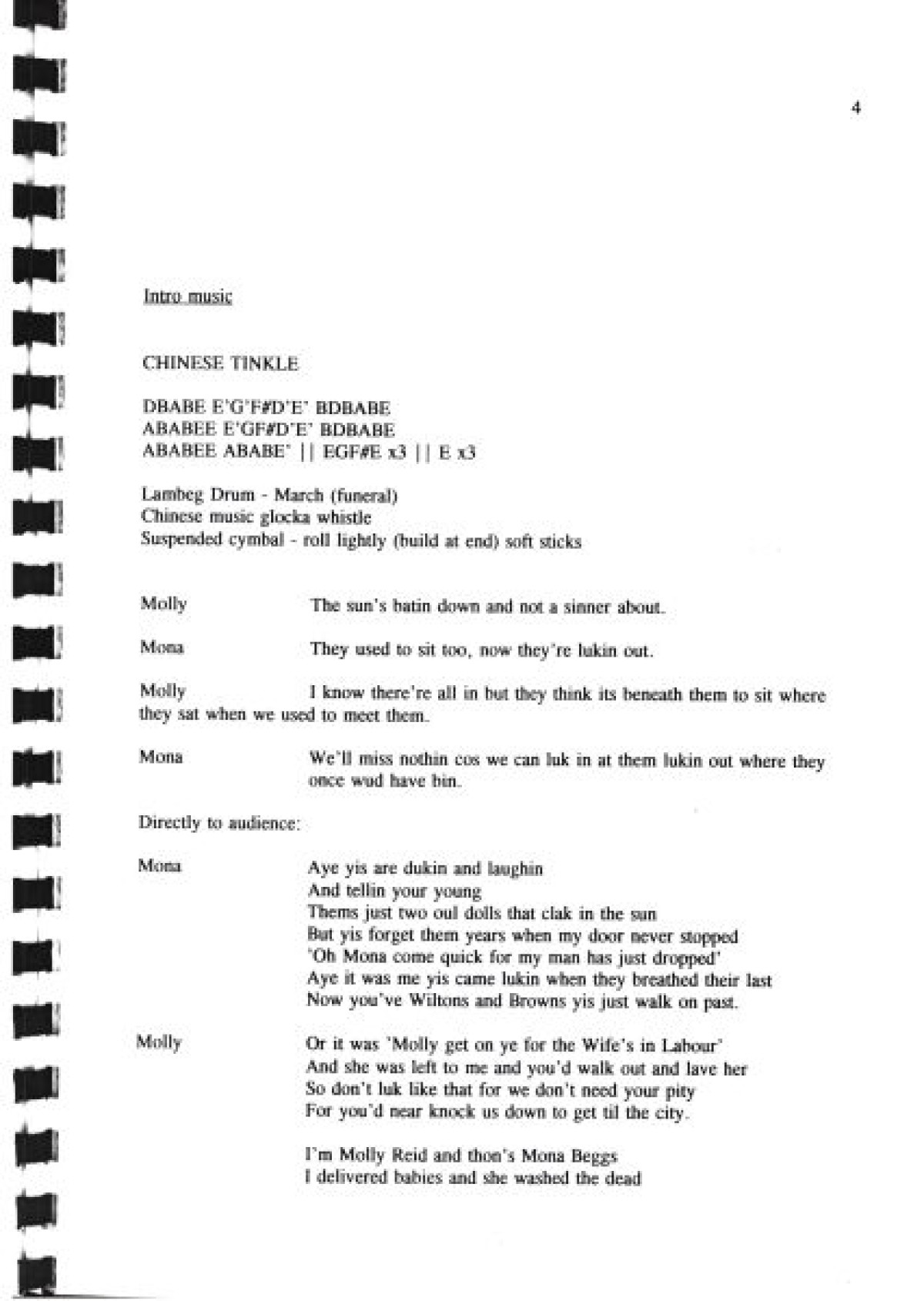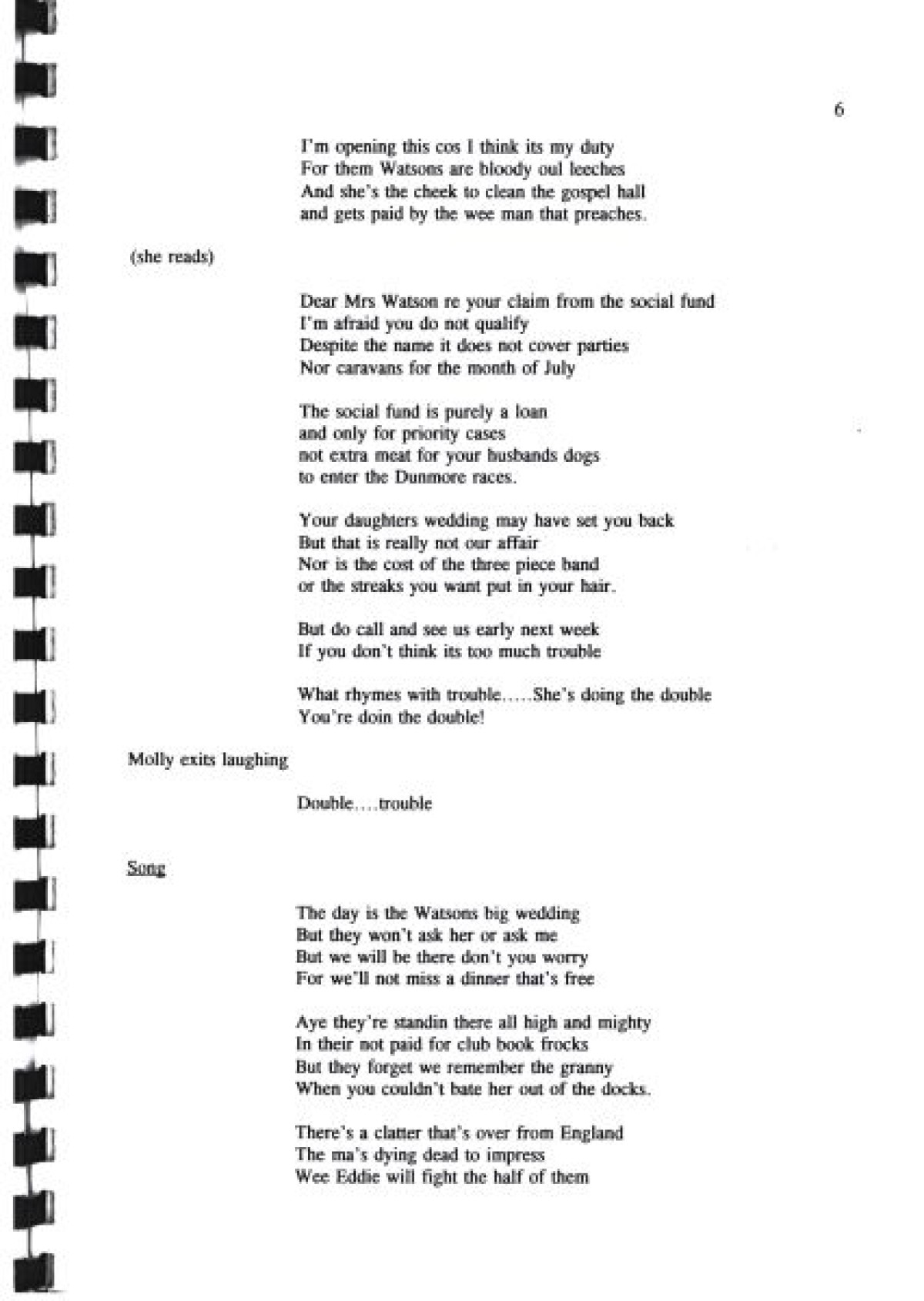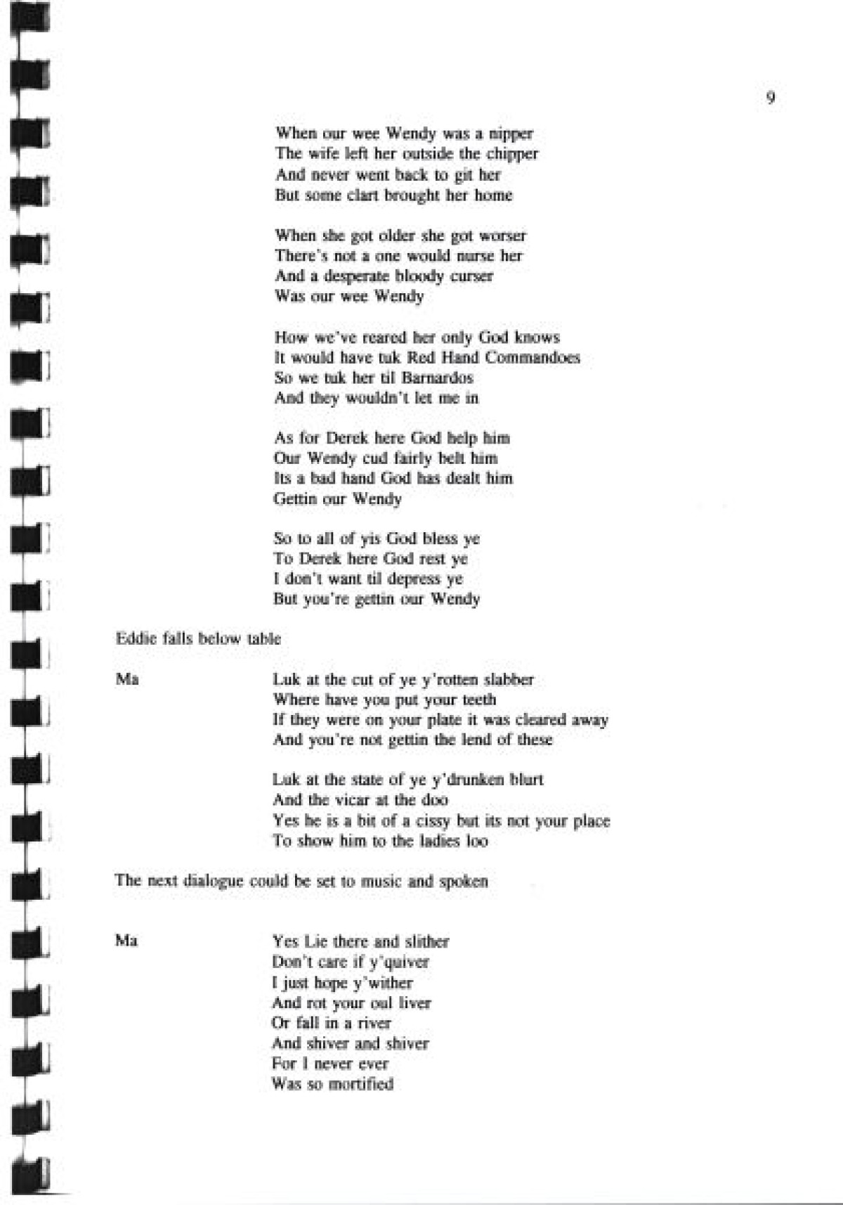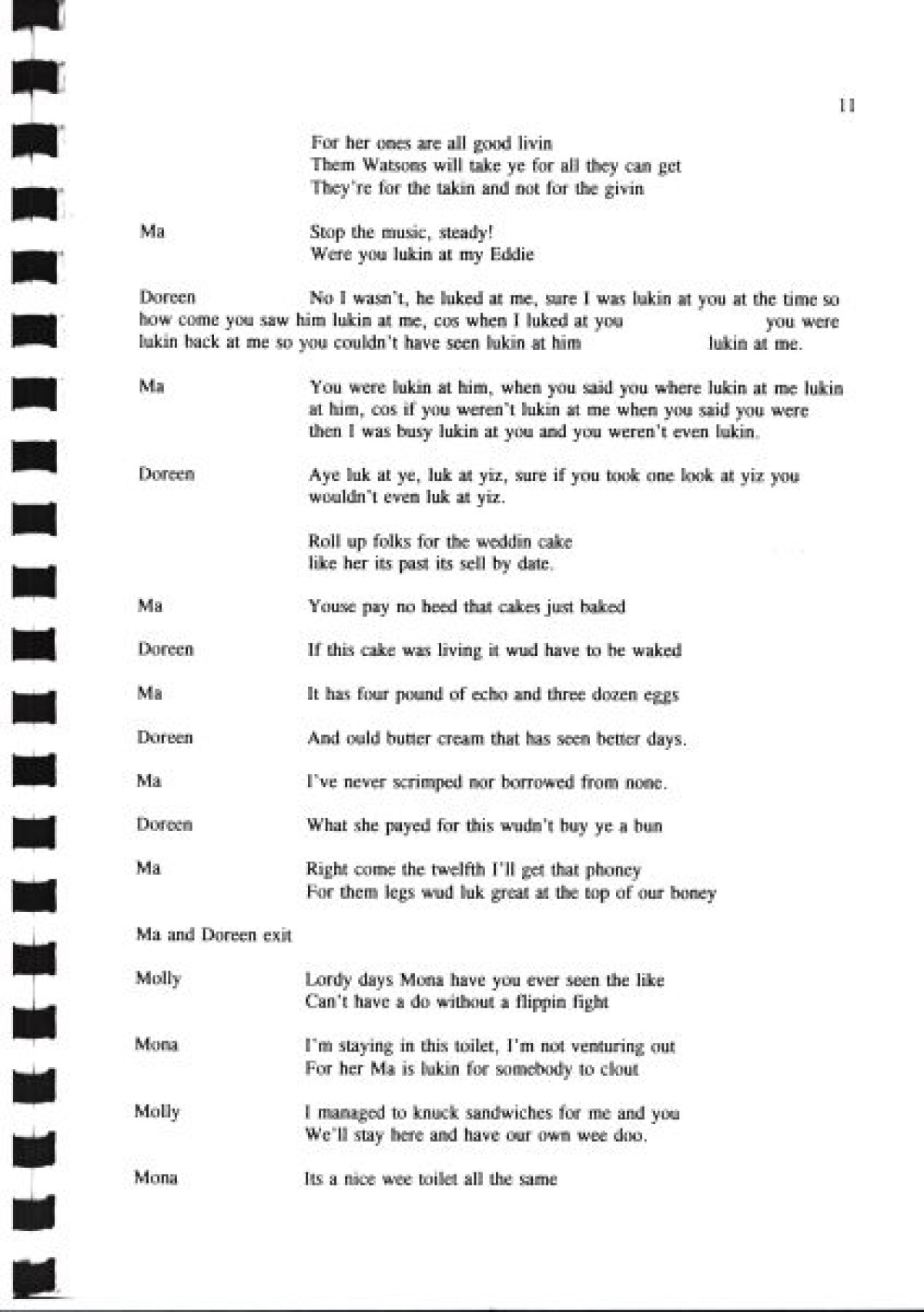Extract from a photocopied script for 'Weddins, Weeins and Wakes,' by playwright Marie Jones, for