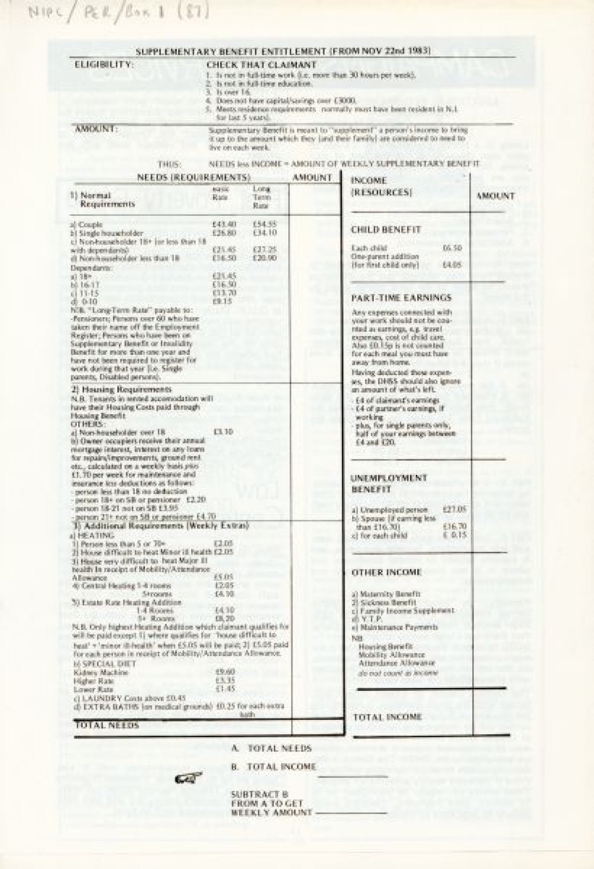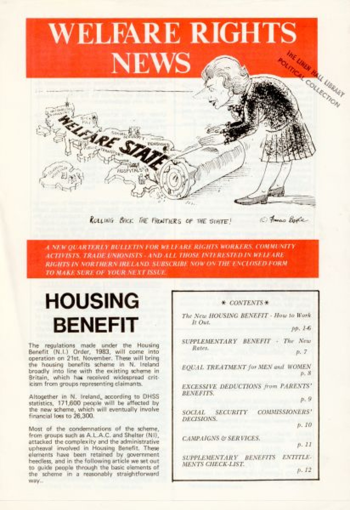 Welfare Rights News, issue 1, 1983, aimed at Welfare Rights workers, Community Activists, and Trade Unionists. Contents discuss the new Housing Benefit; Supplementary Benefit; Equality; Excessive Deductions from Parents' benefits; Social Security Commissioner's decisions; Campaigns and Services; and an entitlement checklist for Supplementary Benefits.