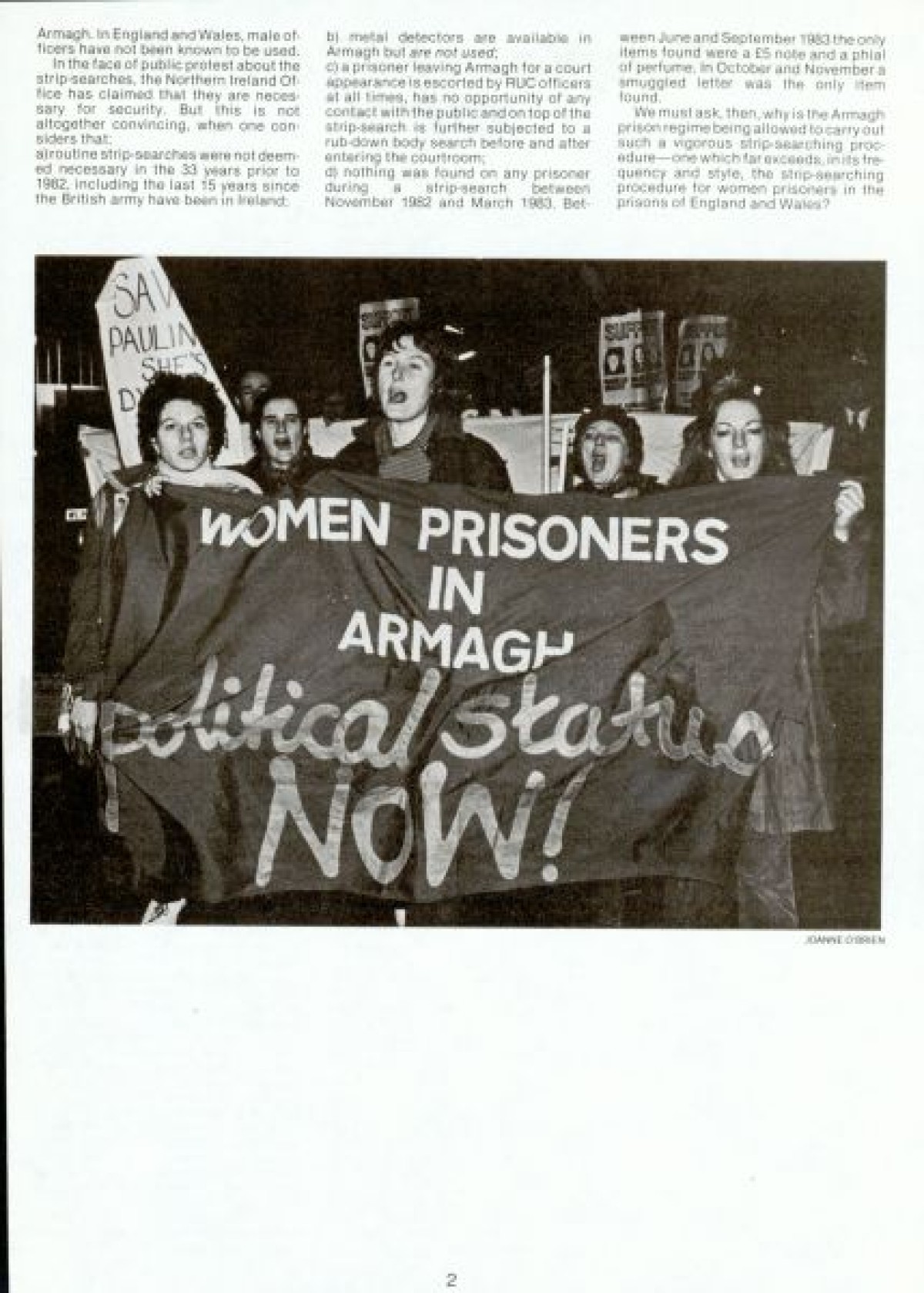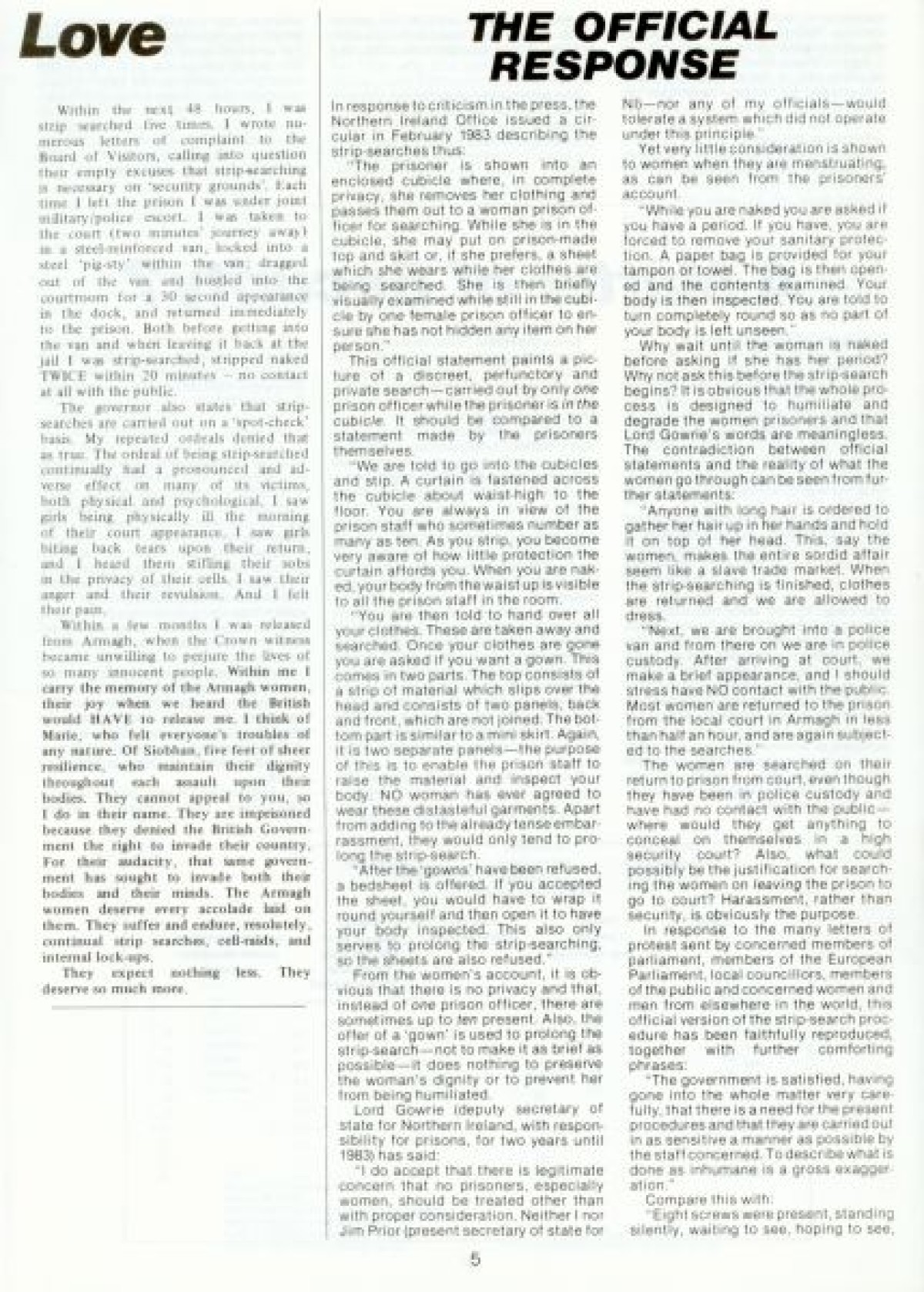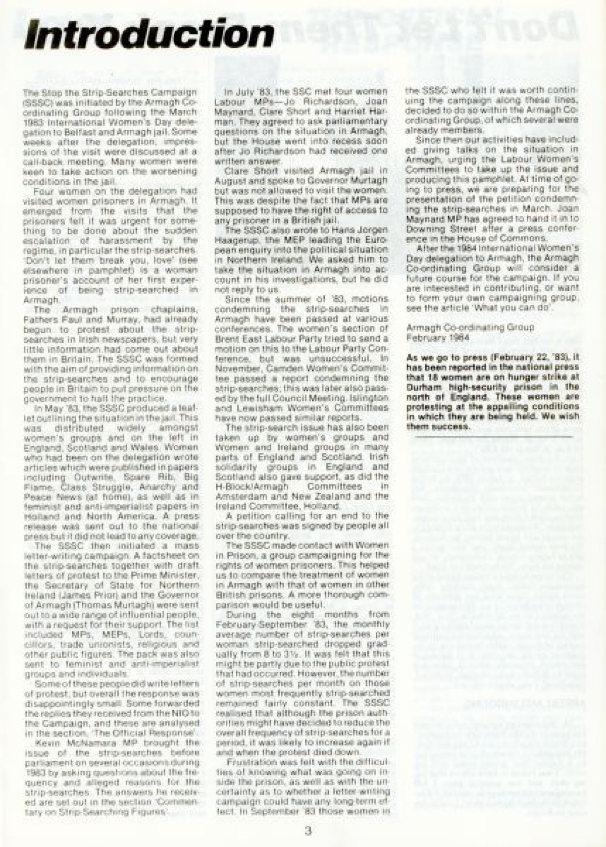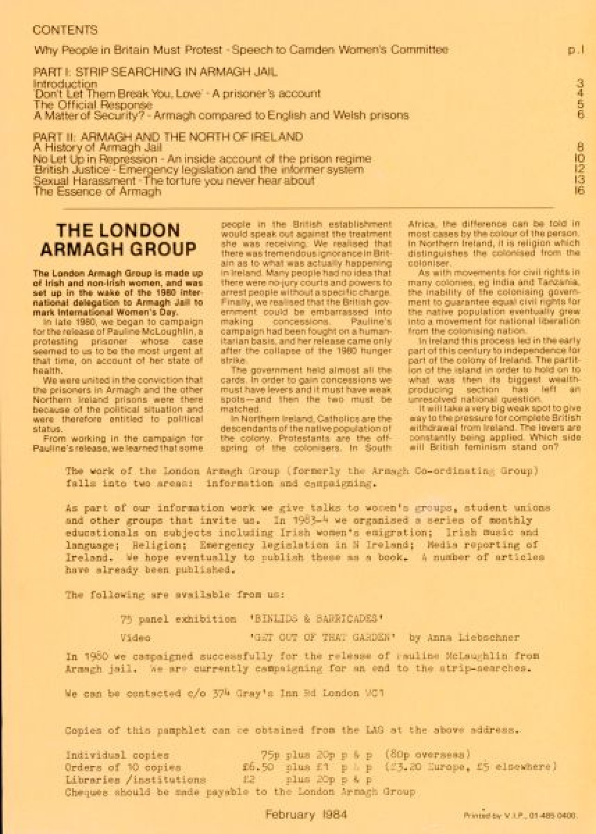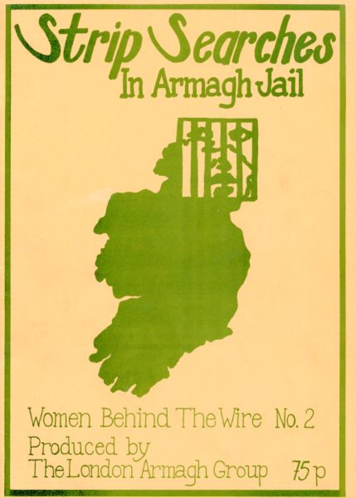 Strip Searches in Armagh Jail: Women Behind the Wire, issue 2. Produced by the London Armagh Group. Contents include a speech to the Camden Women's Committee titled, "Why People in Britain Must Protest"; an introduction to the London Armagh Group; "Don't let them break you love," - a prisoner's account; The Official Response from the Northern Ireland Office; "A Matter of Security? - Armagh compared to English and Welsh prisons"; A History of Armagh Jail; "No let up in repression"; "British Justice: the Emergency Legislation and the Informer System"; Sexual Harassment; and "The Essence of Armagh". Features a template for a letter of protest to the Prime Minister, and suggested reading list.