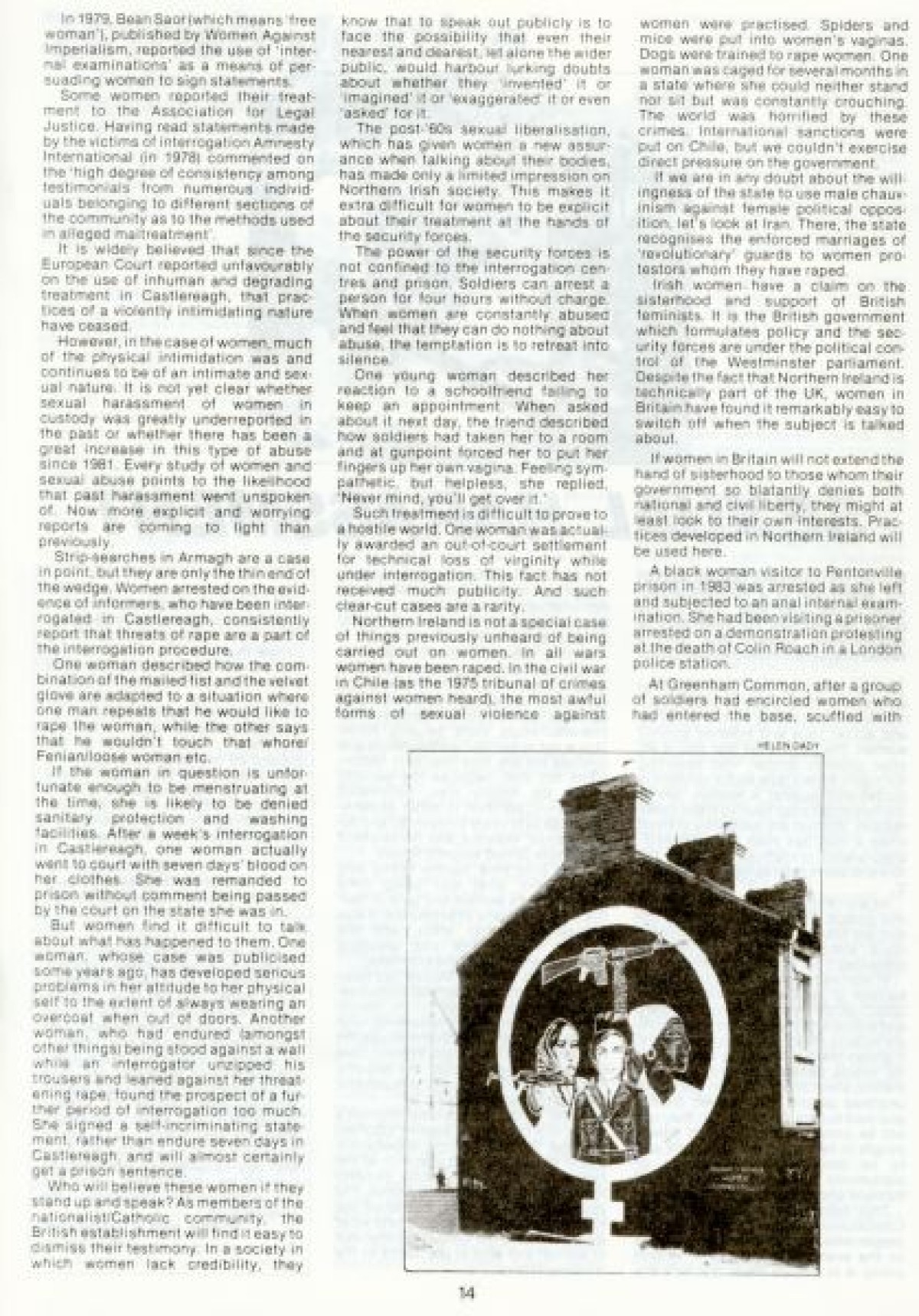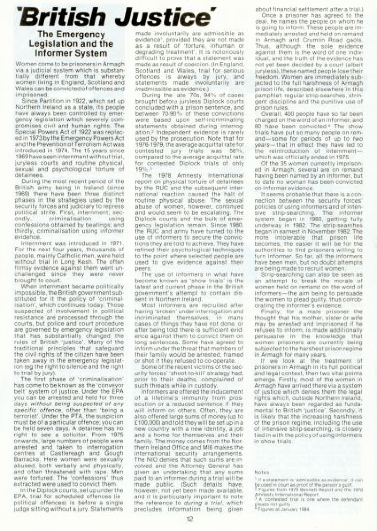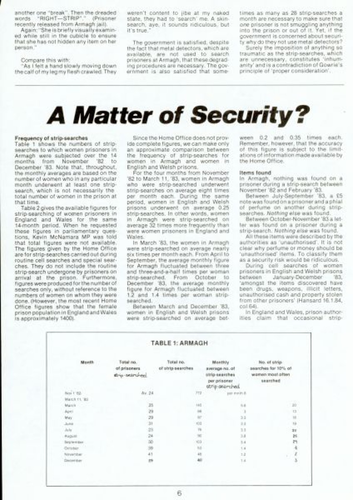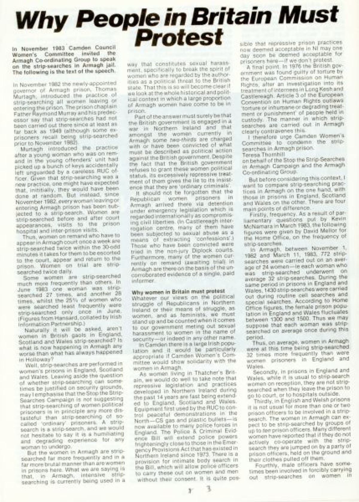 Strip Searches in Armagh Jail: Women Behind the Wire, issue 2. Produced by the London Armagh Group. Contents include a speech to the Camden Women's Committee titled, "Why People in Britain Must Protest"; an introduction to the London Armagh Group; "Don't let them break you love," - a prisoner's account; The Official Response from the Northern Ireland Office; "A Matter of Security? - Armagh compared to English and Welsh prisons"; A History of Armagh Jail; "No let up in repression"; "British Justice: the Emergency Legislation and the Informer System"; Sexual Harassment; and "The Essence of Armagh". Features a template for a letter of protest to the Prime Minister, and suggested reading list.
