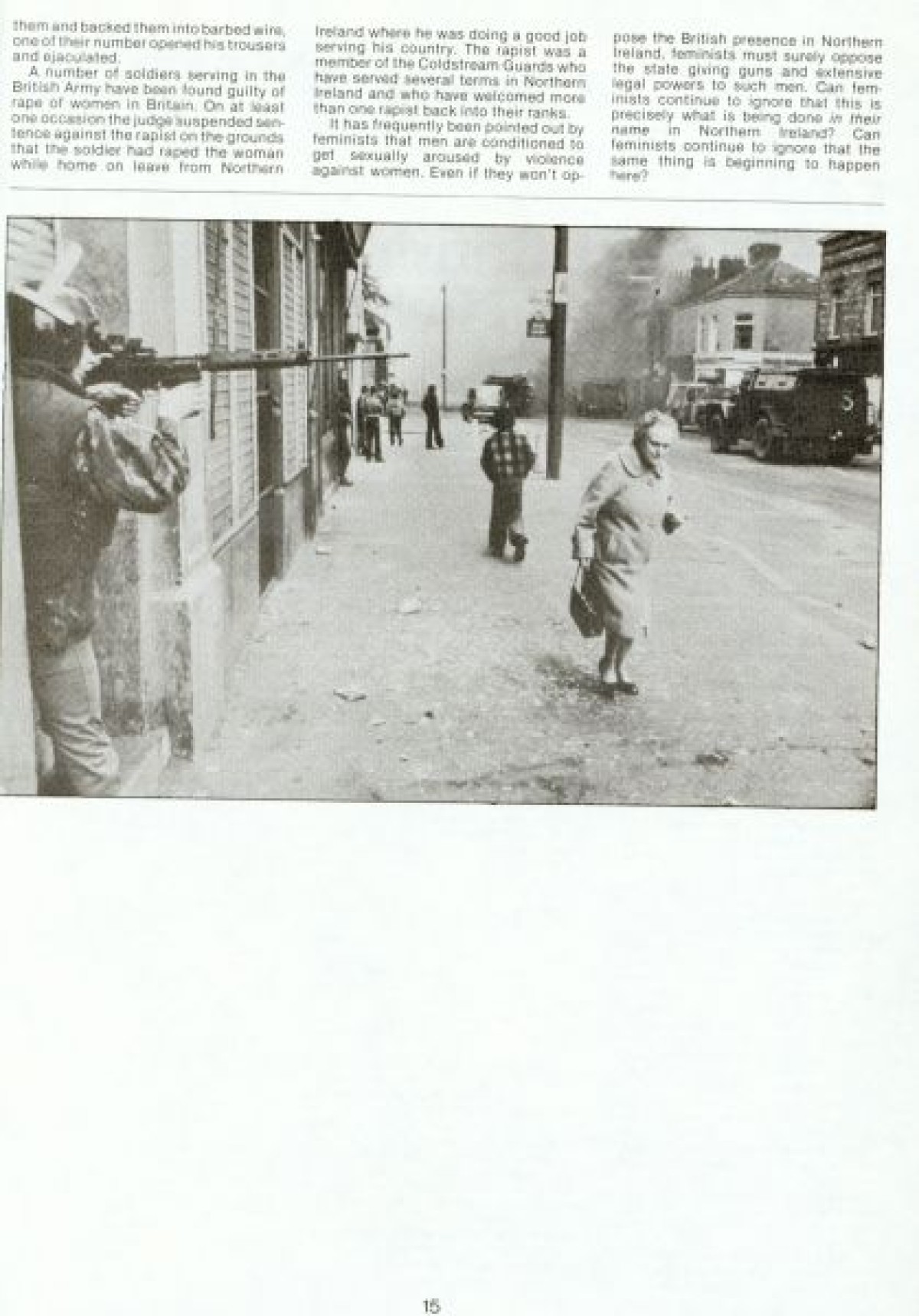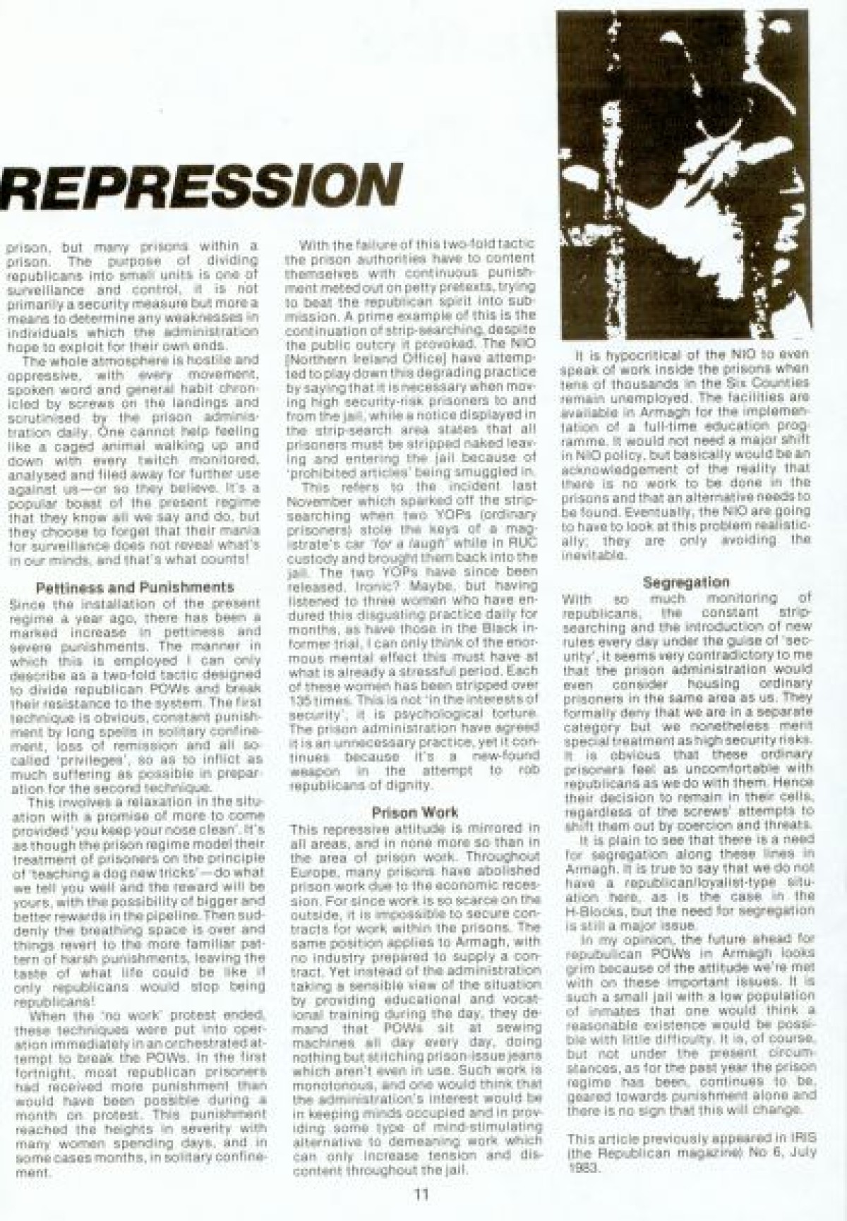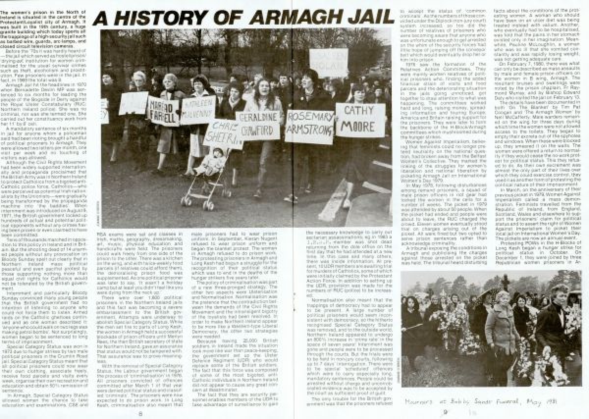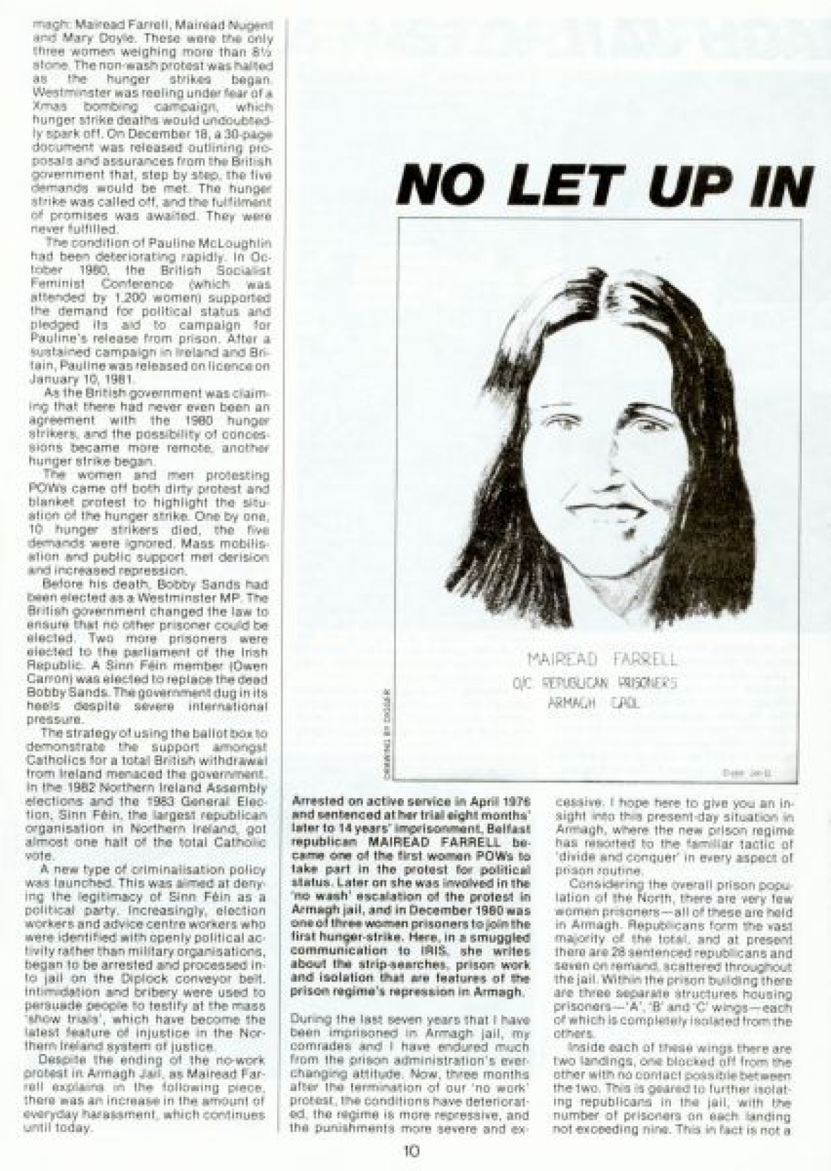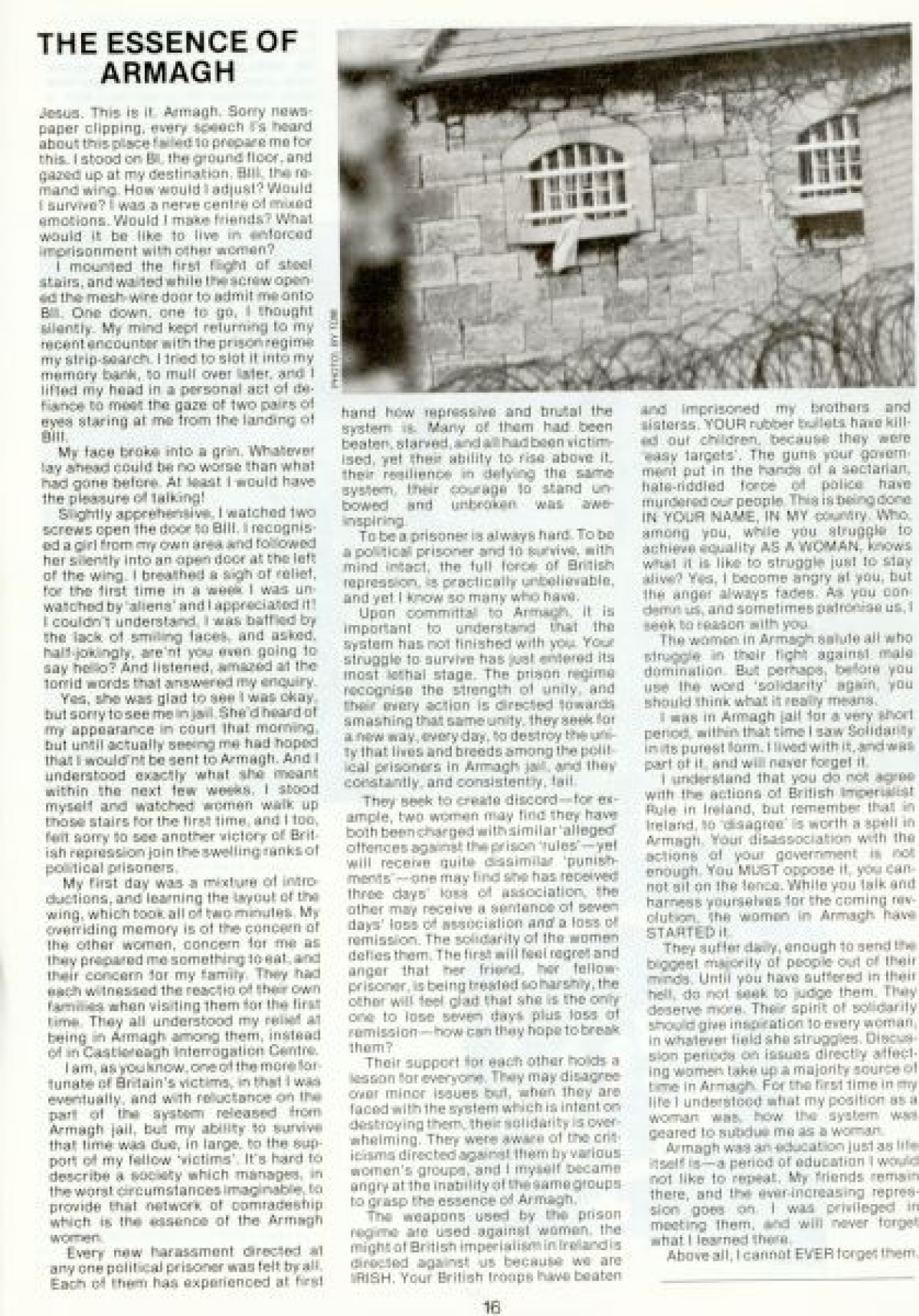 Strip Searches in Armagh Jail: Women Behind the Wire, issue 2. Produced by the London Armagh Group. Contents include a speech to the Camden Women's Committee titled, "Why People in Britain Must Protest"; an introduction to the London Armagh Group; "Don't let them break you love," - a prisoner's account; The Official Response from the Northern Ireland Office; "A Matter of Security? - Armagh compared to English and Welsh prisons"; A History of Armagh Jail; "No let up in repression"; "British Justice: the Emergency Legislation and the Informer System"; Sexual Harassment; and "The Essence of Armagh". Features a template for a letter of protest to the Prime Minister, and suggested reading list.