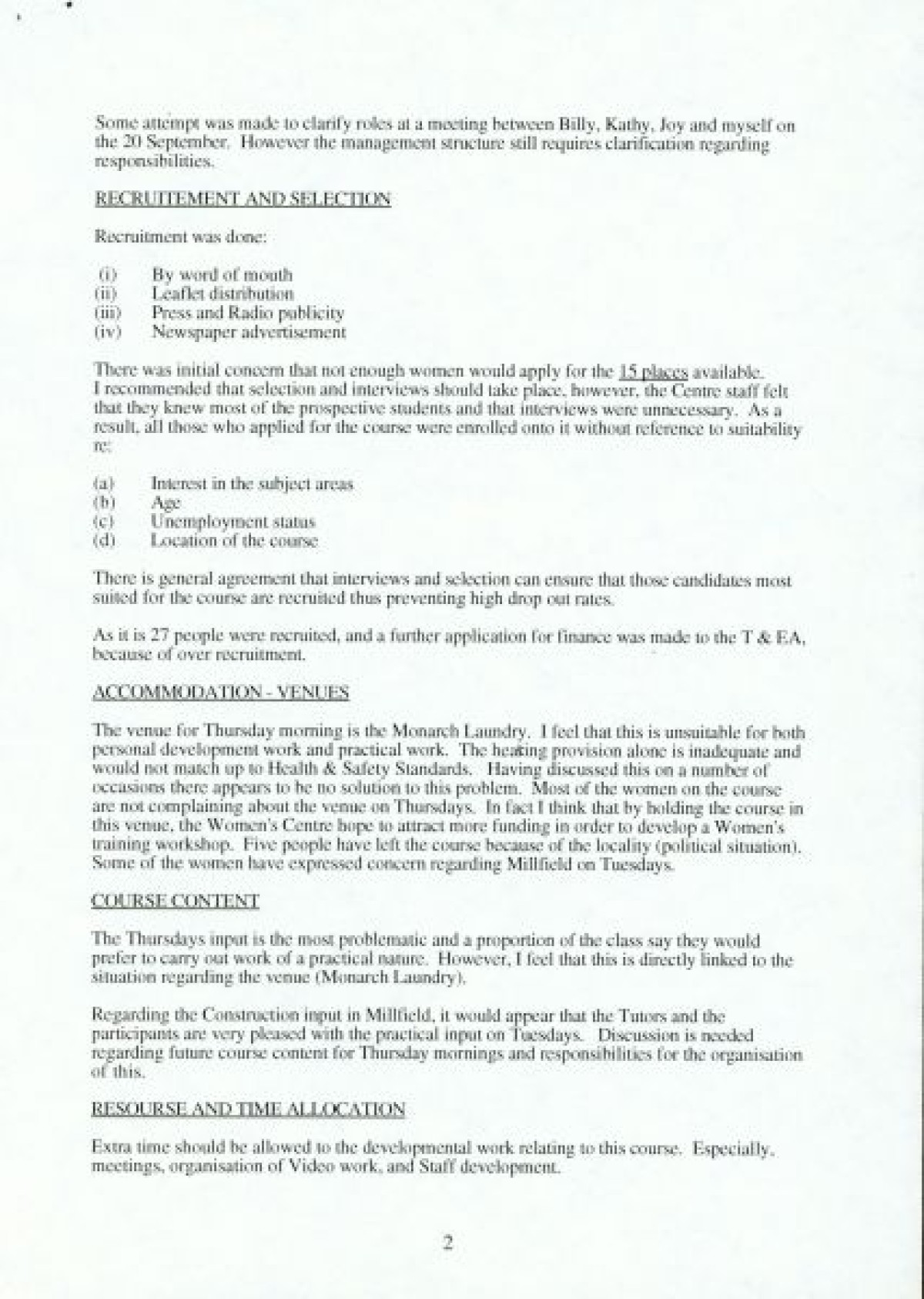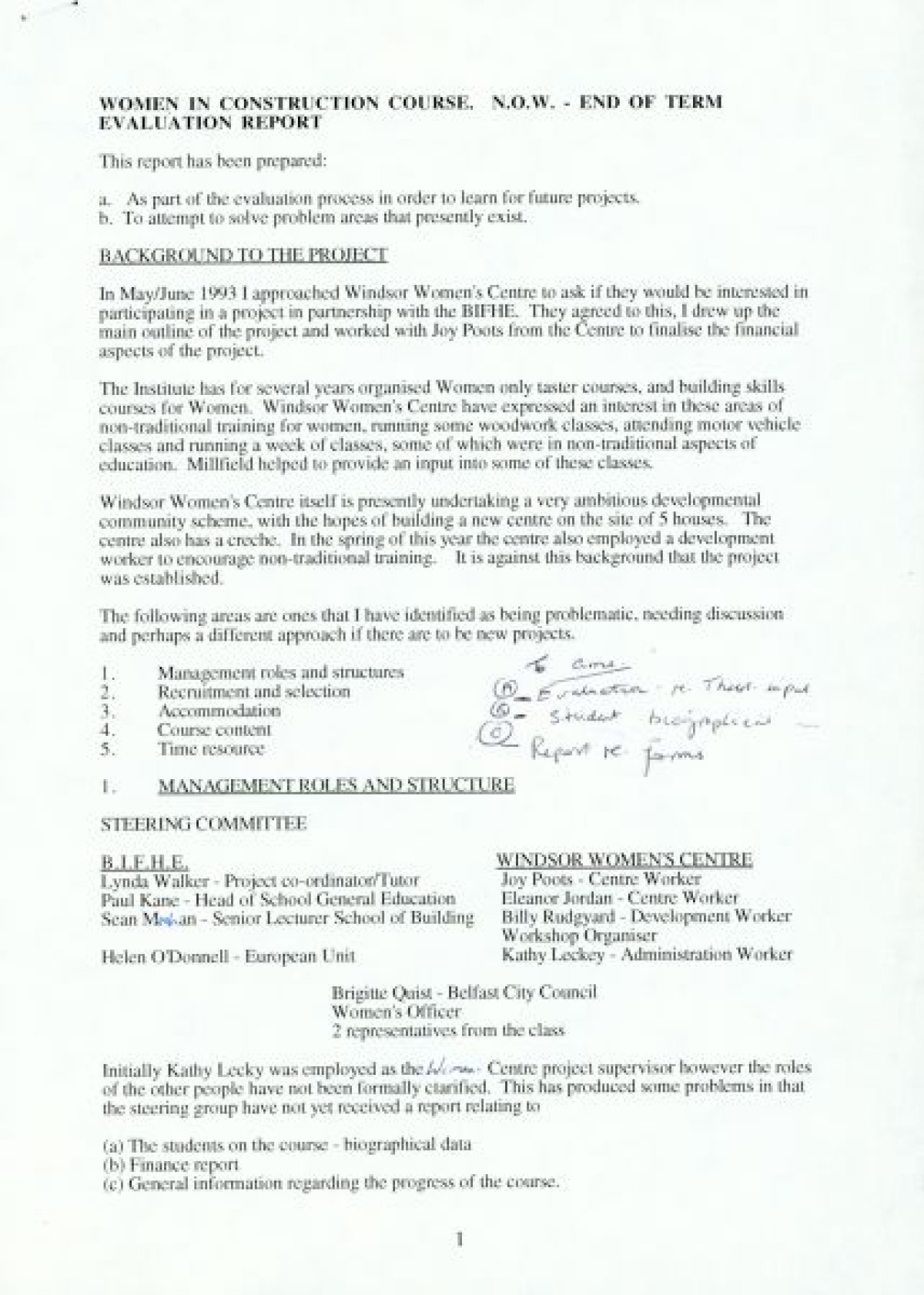 An end-of-term Evaluation Report for 'Women in Construction Course'. Organised by the Belfast Institute for Further and Higher Education in conjunction with Windsor Women's Centre. Includes a background to the project, management roles and structure, recruitment and selection and information on course content.