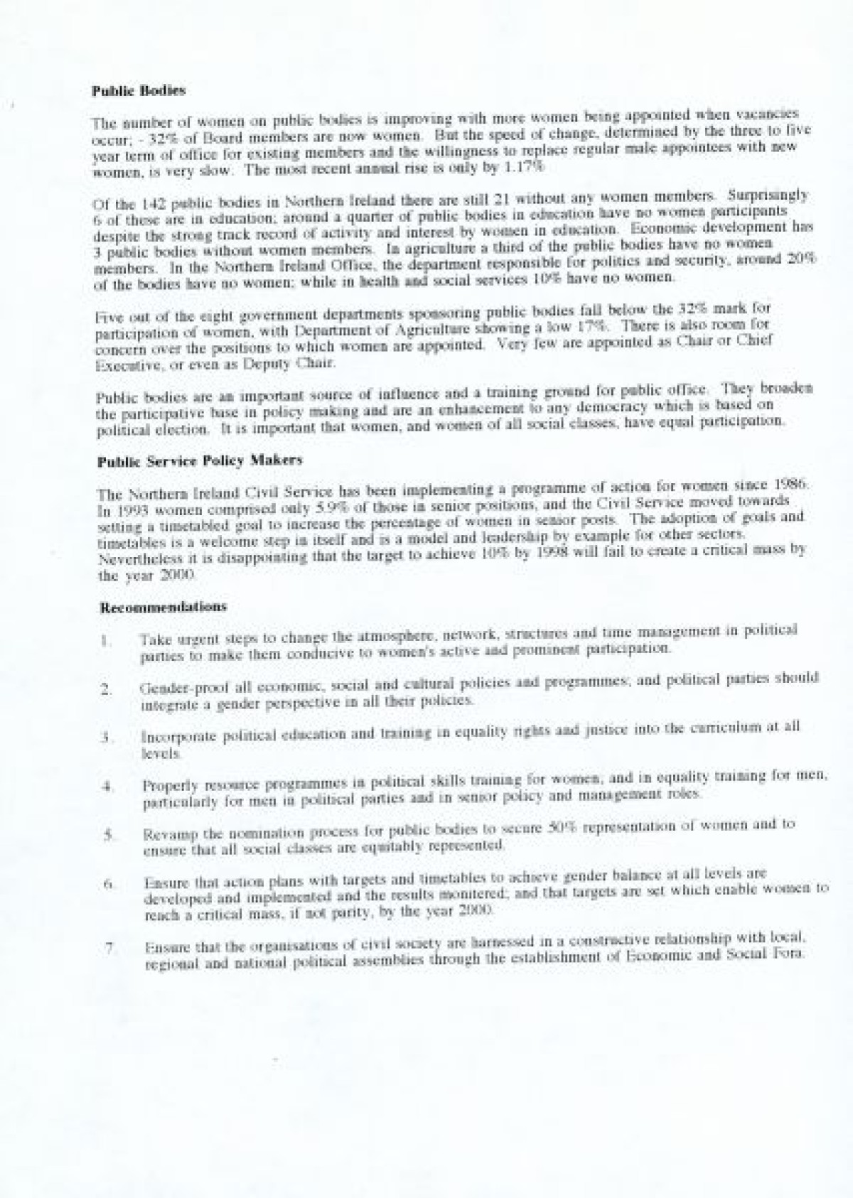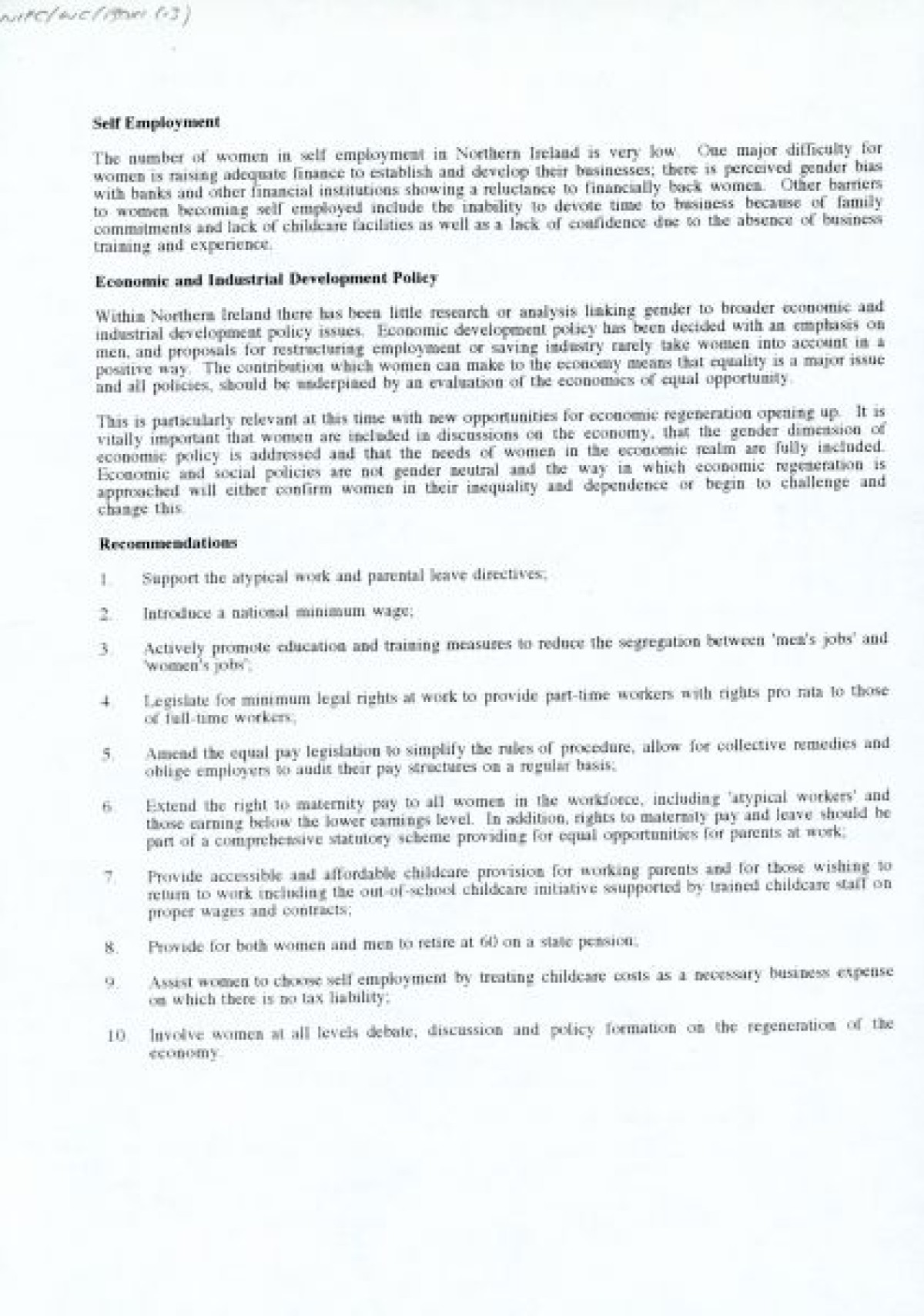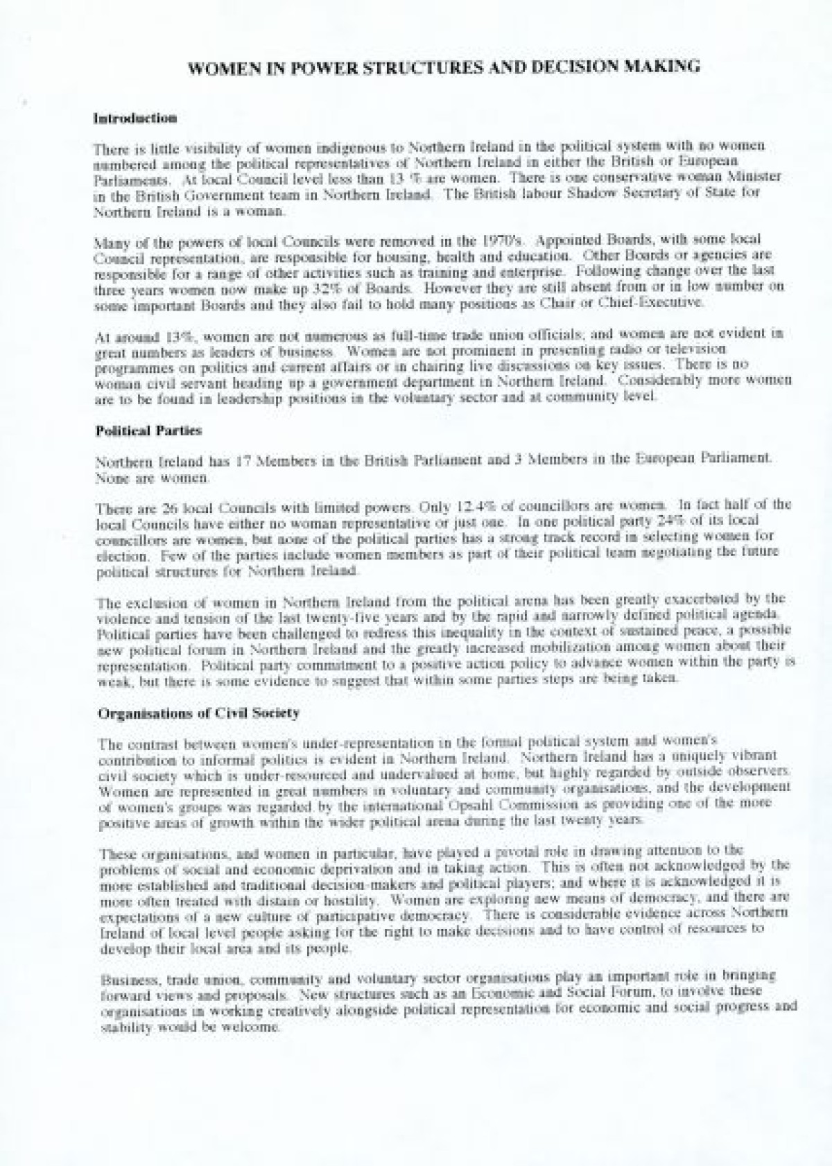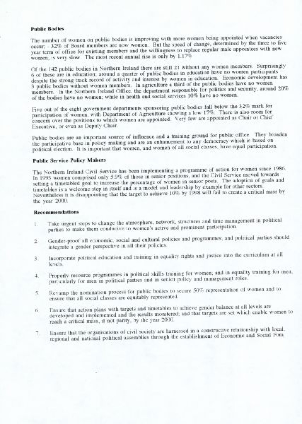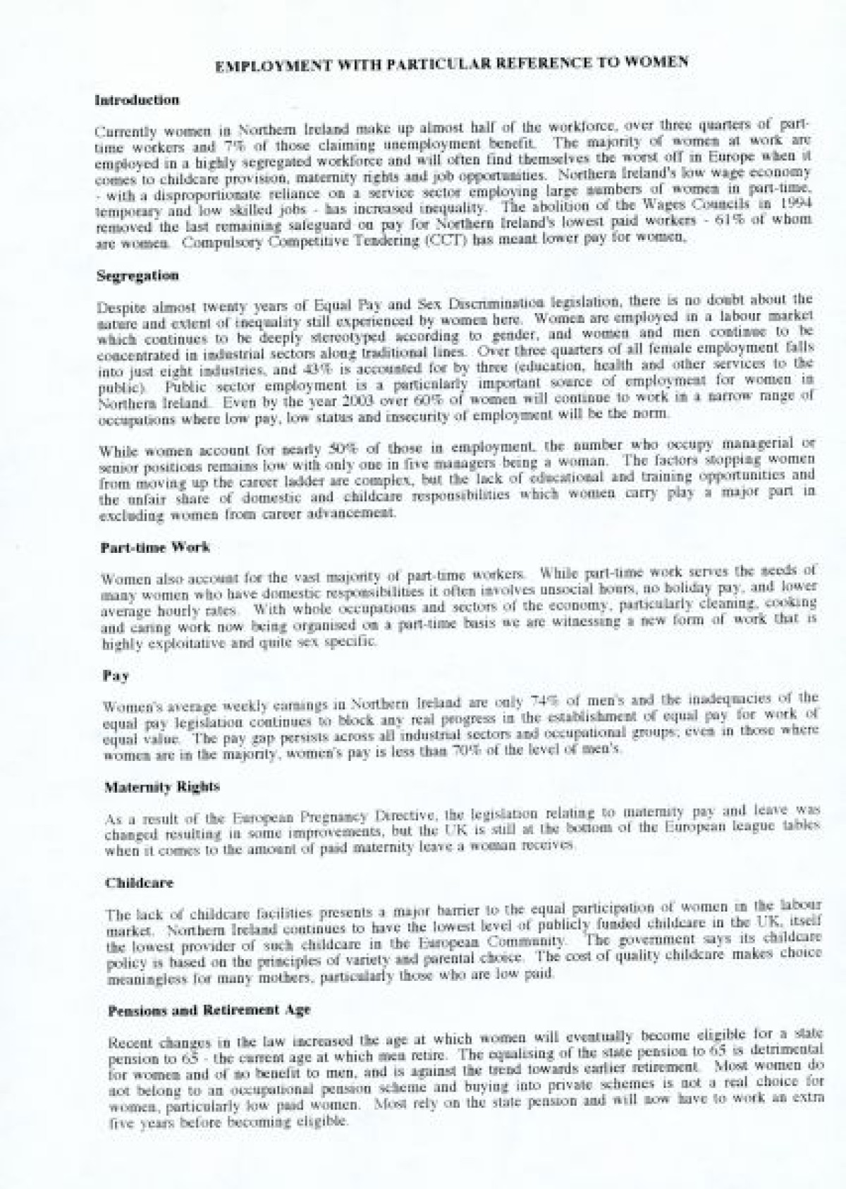 Northern Ireland Women's Coalition. The document tackles the underrepresentation of women in politics and outlines issues affecting women across Northern Ireland including poverty, education, and unequal employment rights. Features a list of recommendations to enable greater equality for women in employment.