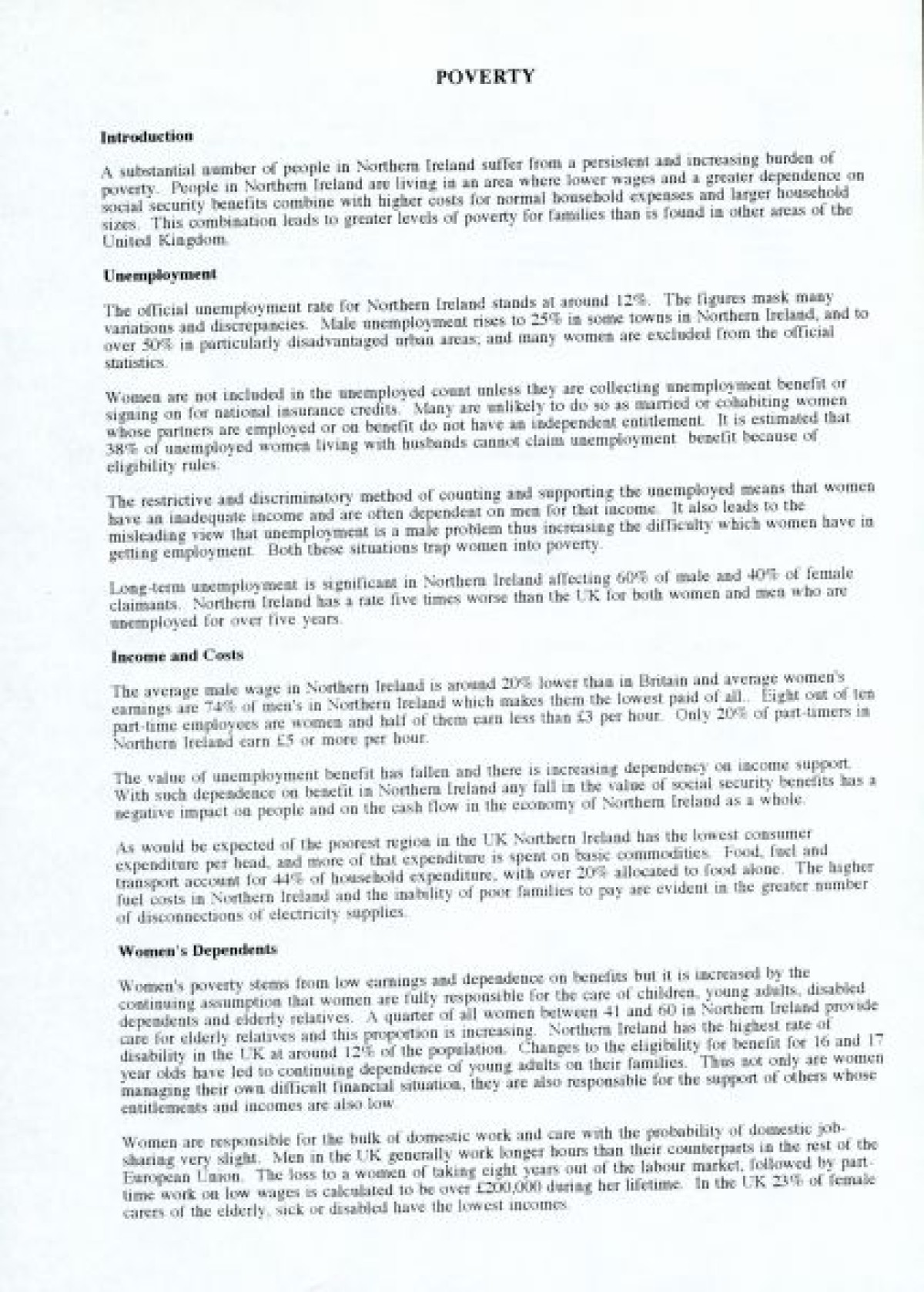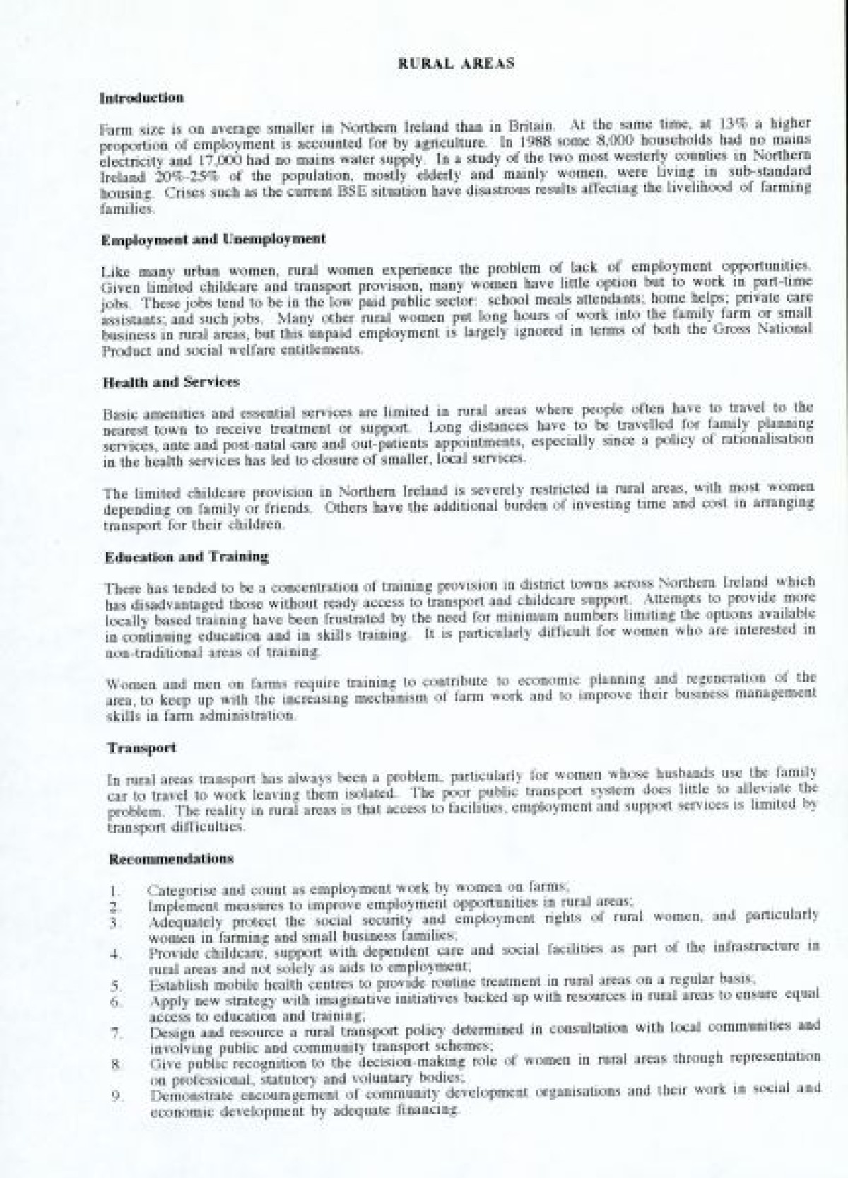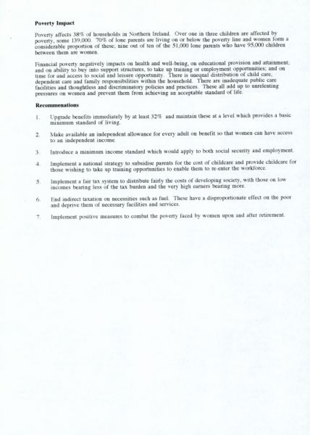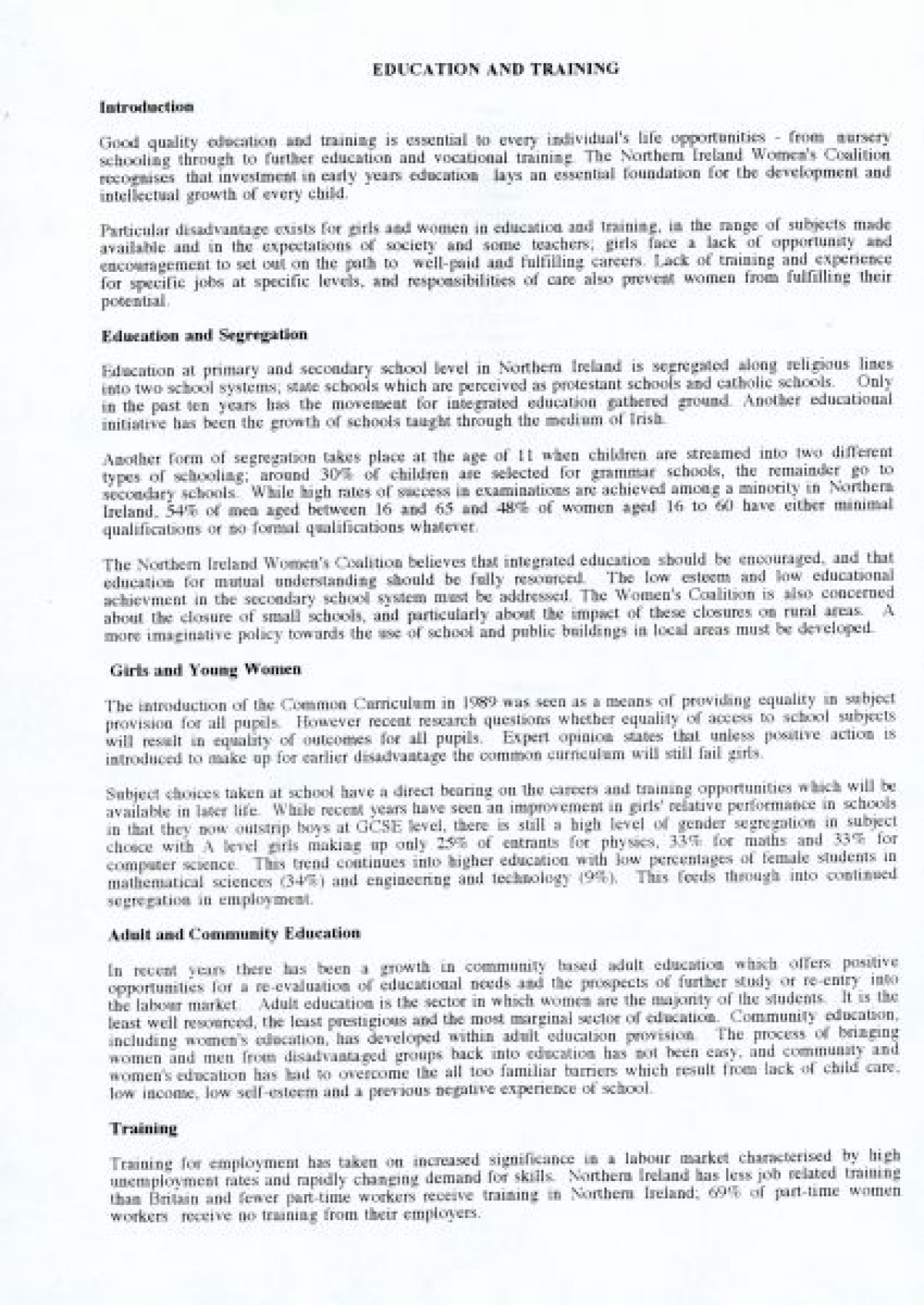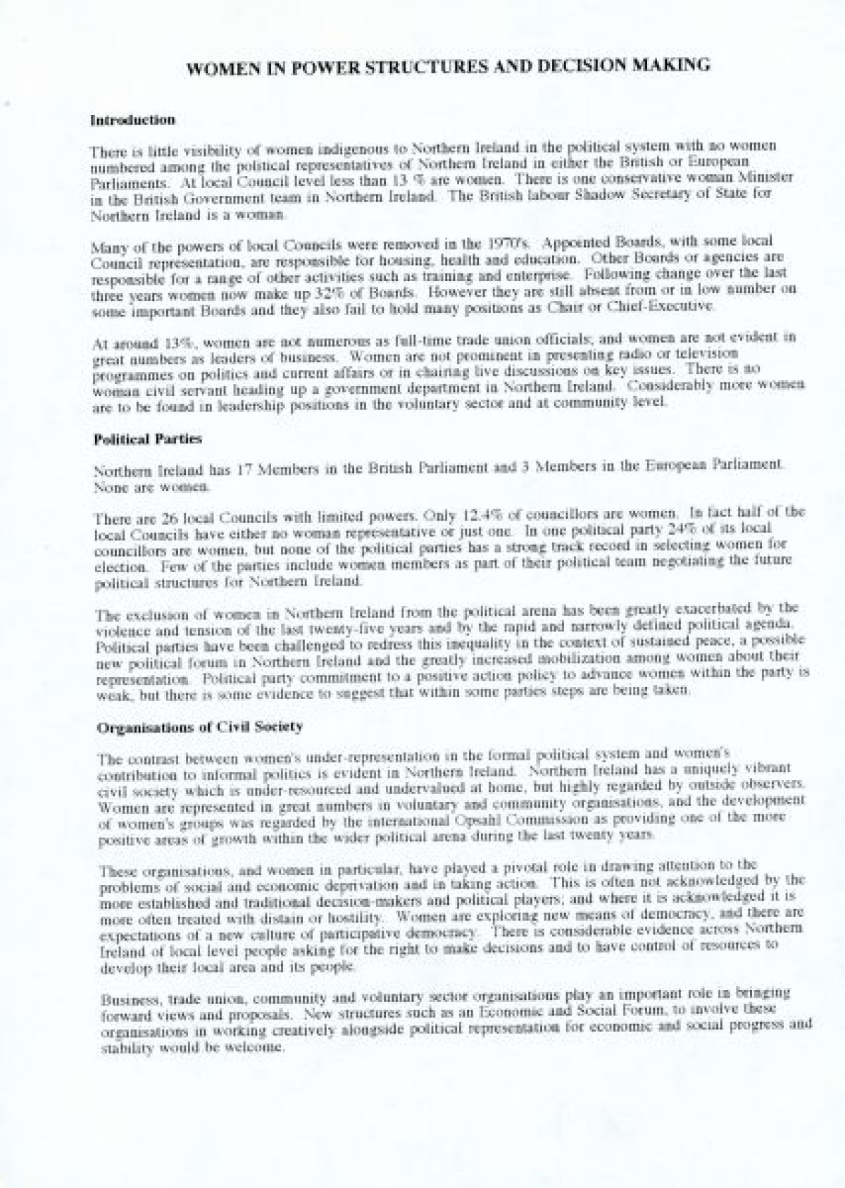 Northern Ireland Women's Coalition. The document tackles the underrepresentation of women in politics and outlines issues affecting women across Northern Ireland including poverty, education, and unequal employment rights. Features a list of recommendations to enable greater equality for women in employment.