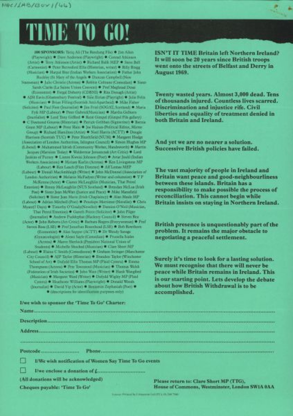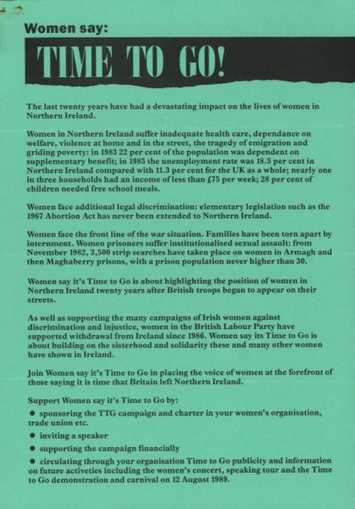 'Time to go!' campaign leaflet promoting British withdrawal from Northern Ireland. Discusses discrimination and injustice faced by women during the 'troubles' in Northern Ireland.