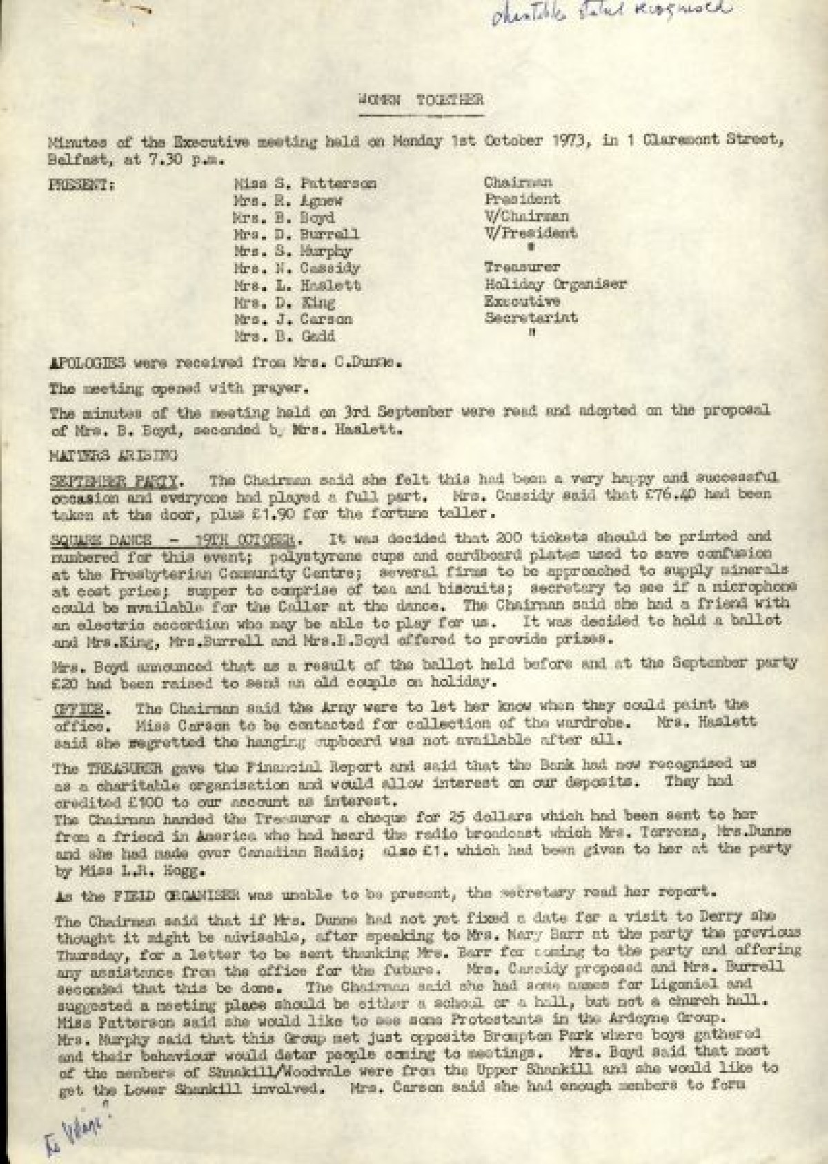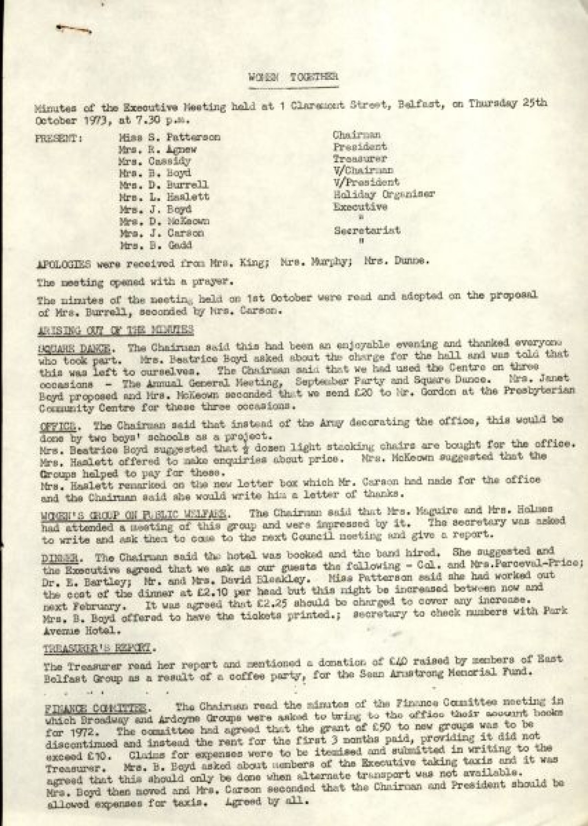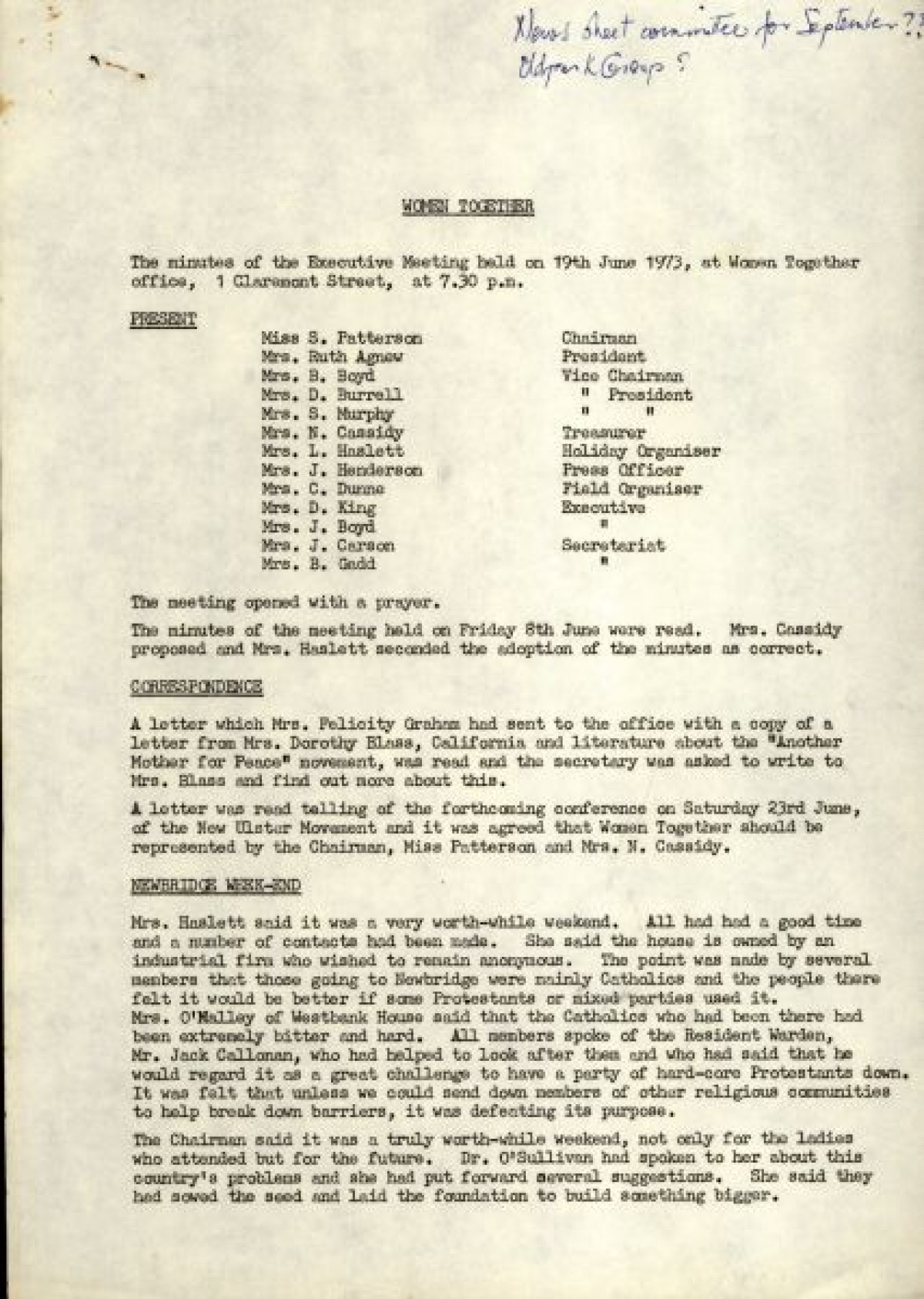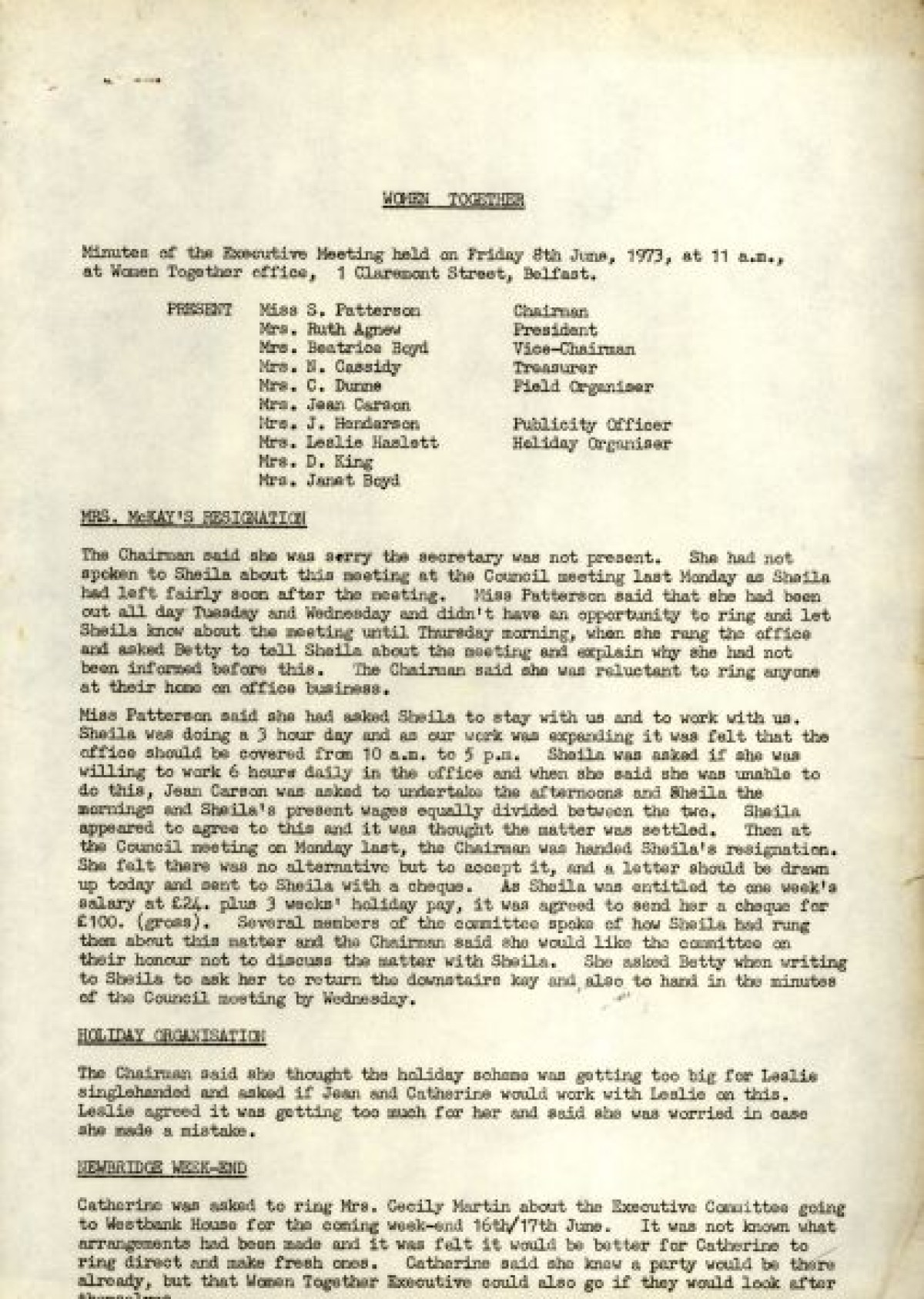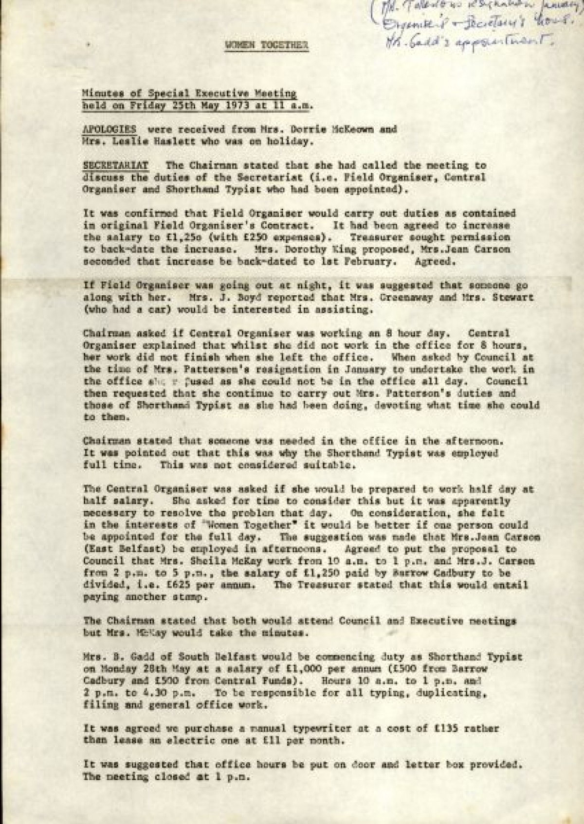 Bundle of typewritten minutes from Women Together meetings, during the year 1973. Includes a Report from Chairman Saidie Patterson, identifying highlights from the year's work, decline in membership, moral support, publicity, a reading group and expressions of gratitude to Betty Gadd, Jean Carson, Nancy Cassidy, and Ruth Agnew. Minutes from meetings include lists of members, activities and progress of Women Together, correspondences, events and visits, and updates on a newsheet, produced by Joy Henderson.