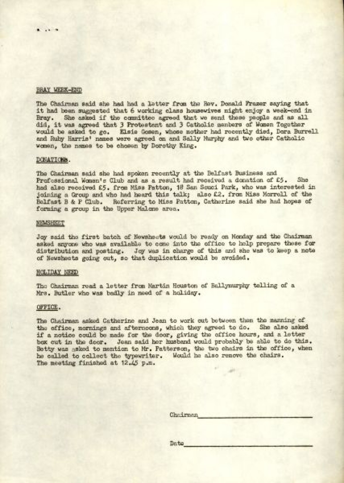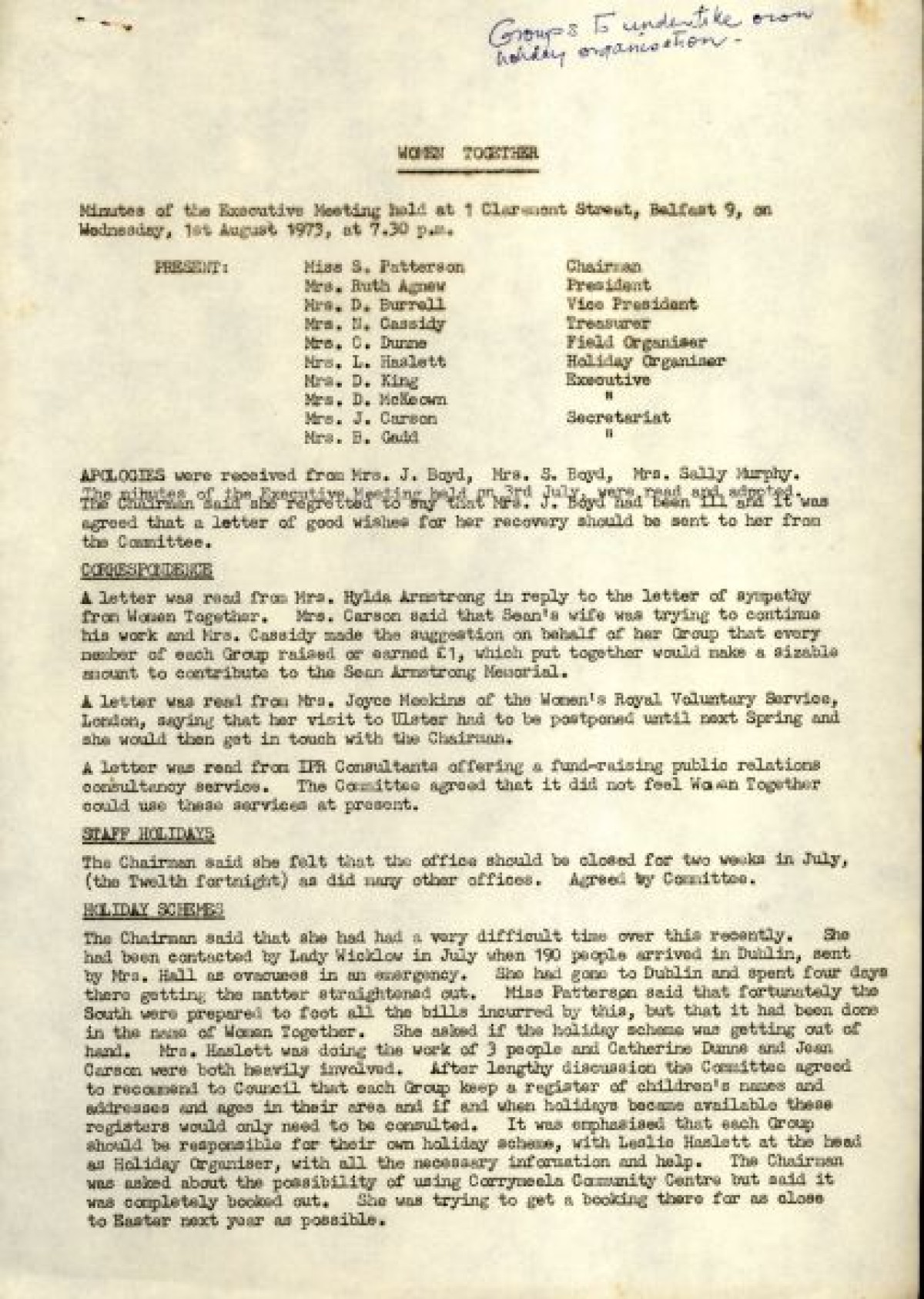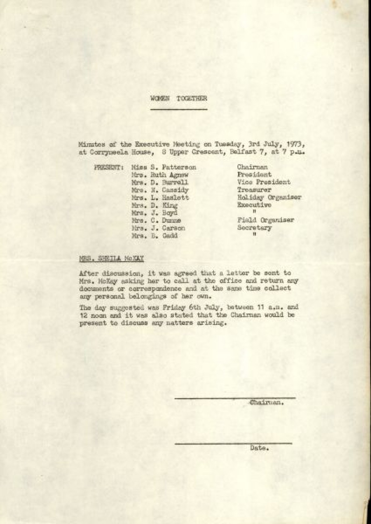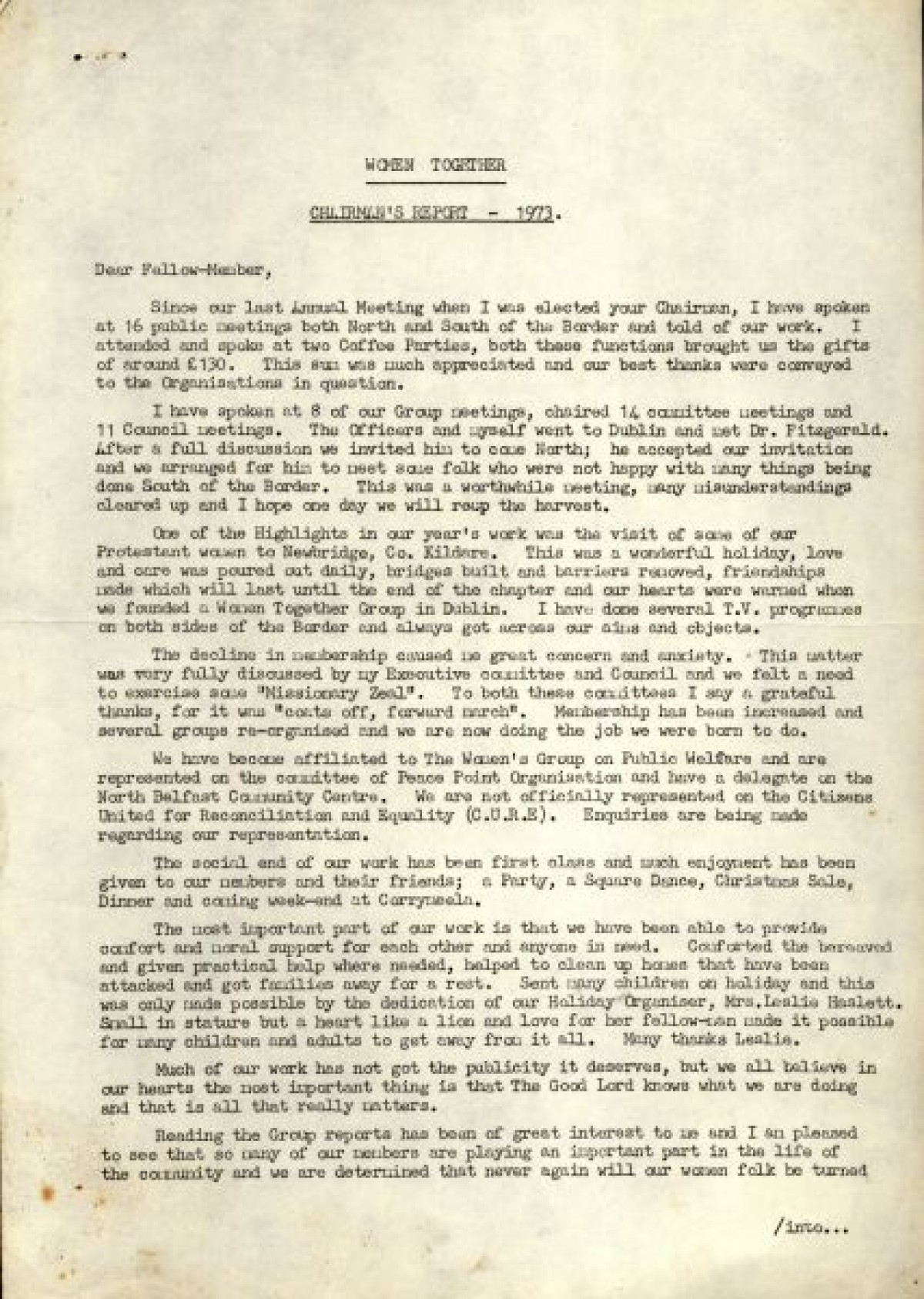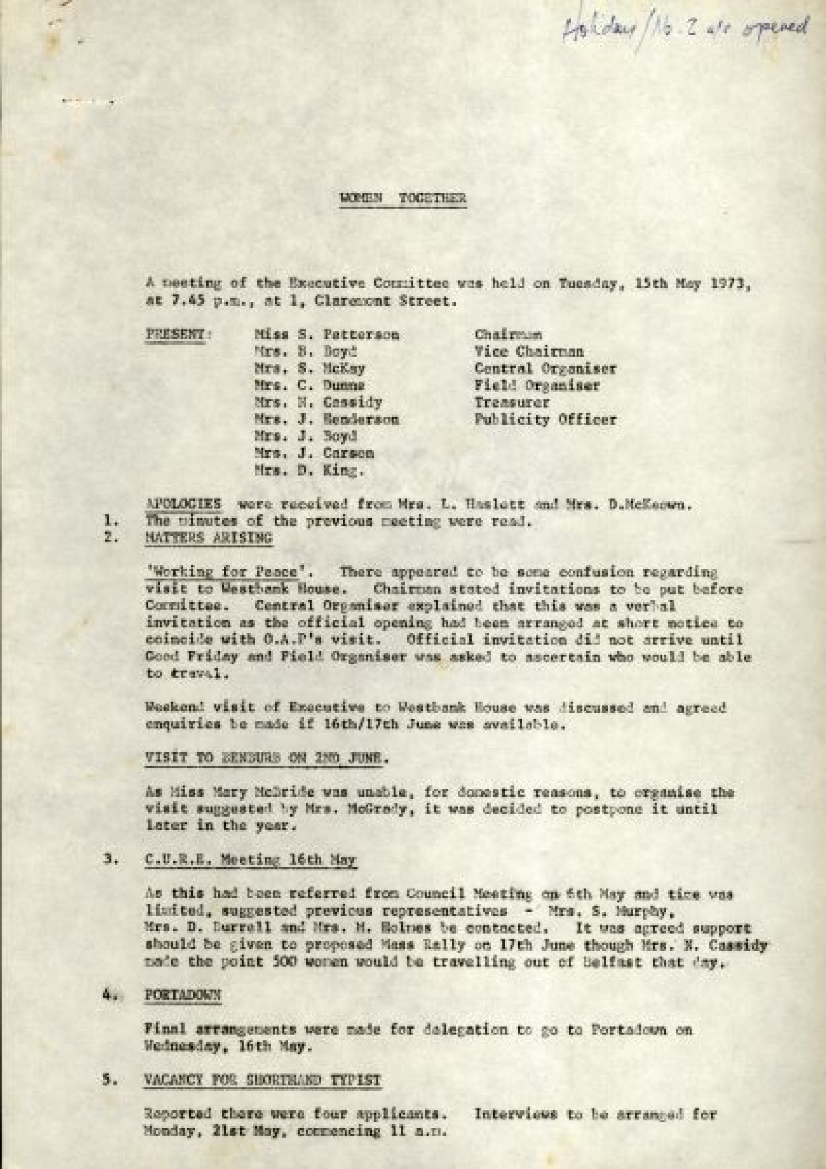 Bundle of typewritten minutes from Women Together meetings, during the year 1973. Includes a Report from Chairman Saidie Patterson, identifying highlights from the year's work, decline in membership, moral support, publicity, a reading group and expressions of gratitude to Betty Gadd, Jean Carson, Nancy Cassidy, and Ruth Agnew. Minutes from meetings include lists of members, activities and progress of Women Together, correspondences, events and visits, and updates on a newsheet, produced by Joy Henderson.