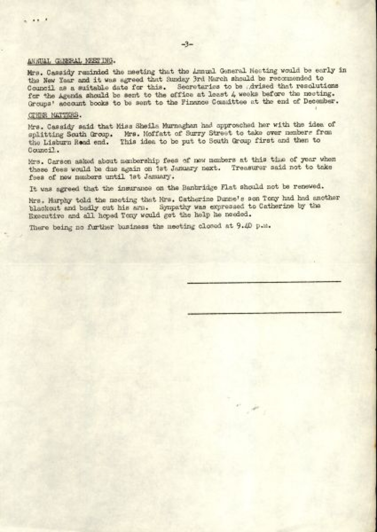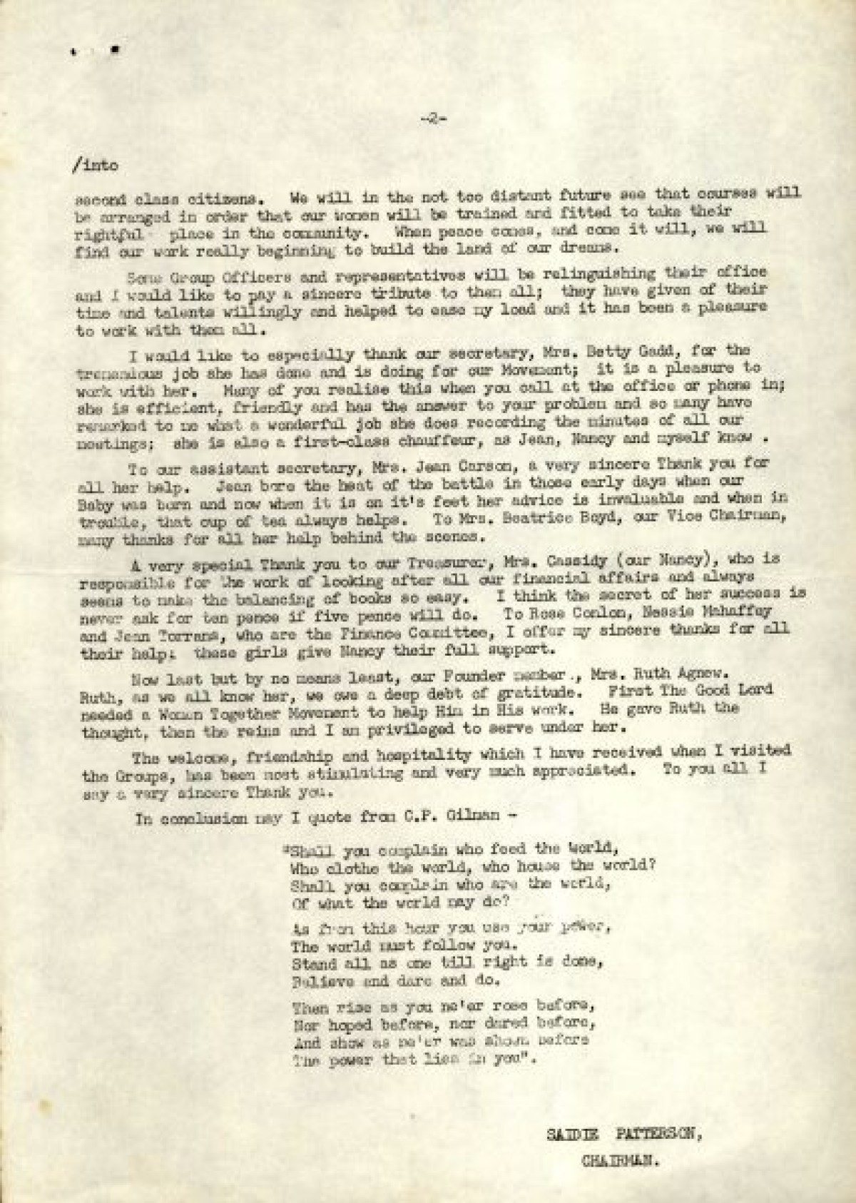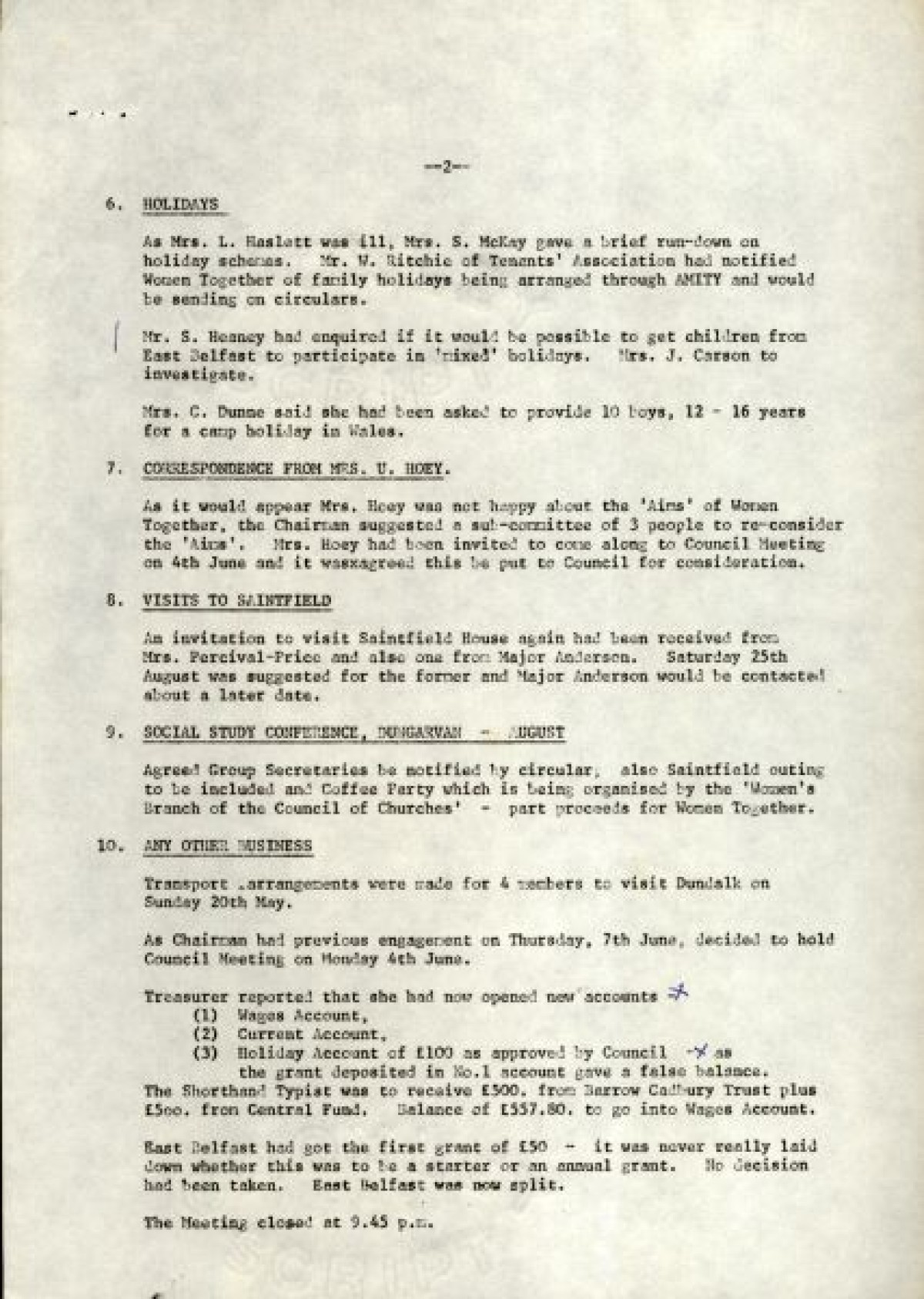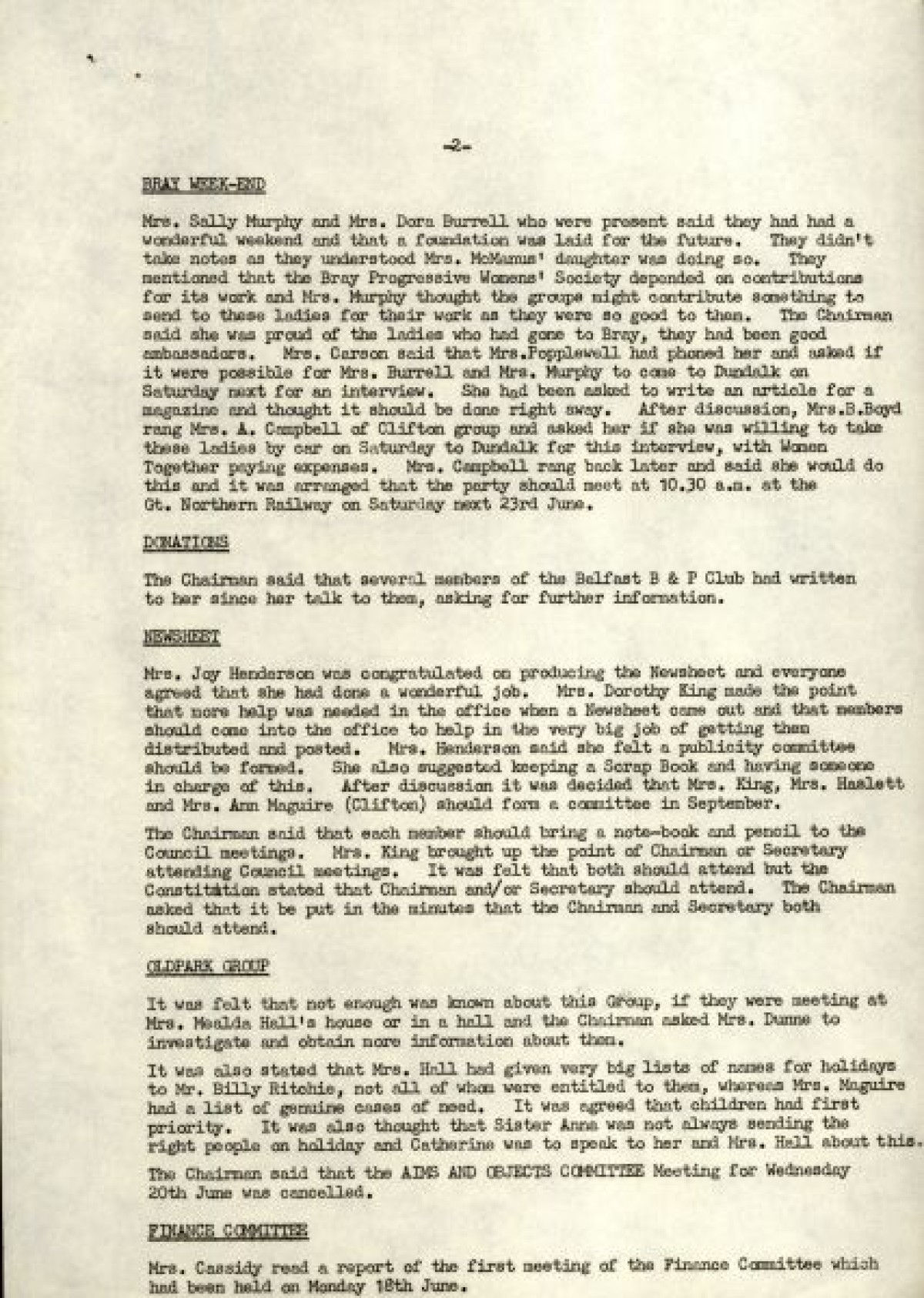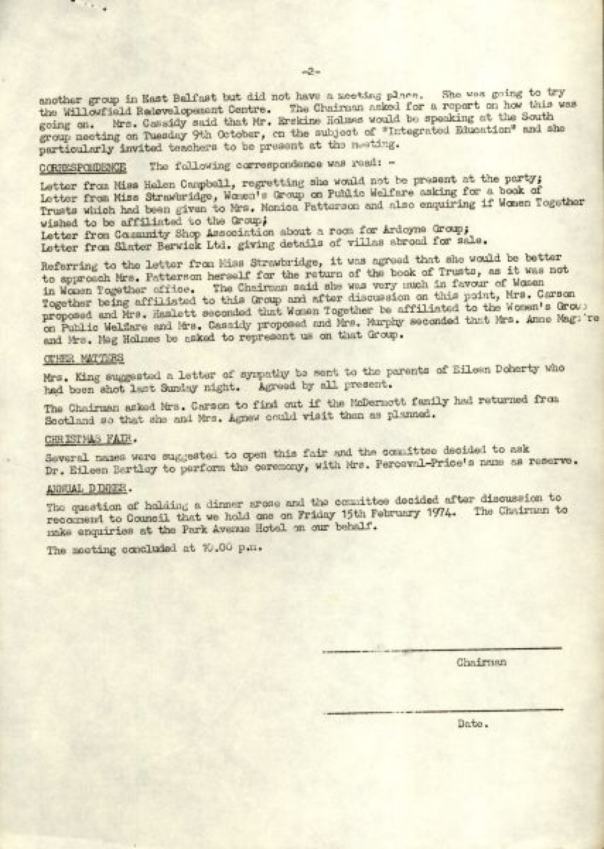 Bundle of typewritten minutes from Women Together meetings, during the year 1973. Includes a Report from Chairman Saidie Patterson, identifying highlights from the year's work, decline in membership, moral support, publicity, a reading group and expressions of gratitude to Betty Gadd, Jean Carson, Nancy Cassidy, and Ruth Agnew. Minutes from meetings include lists of members, activities and progress of Women Together, correspondences, events and visits, and updates on a newsheet, produced by Joy Henderson.