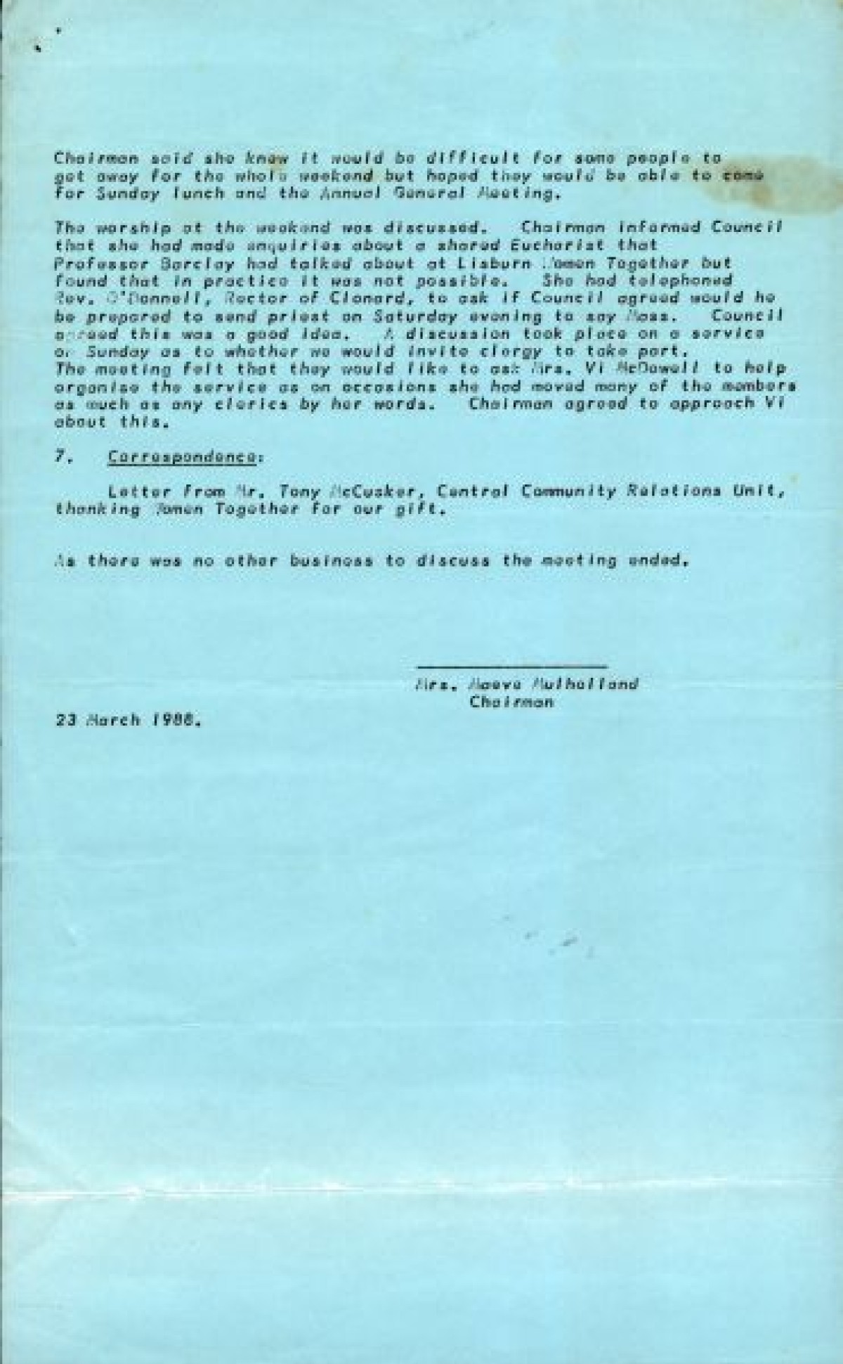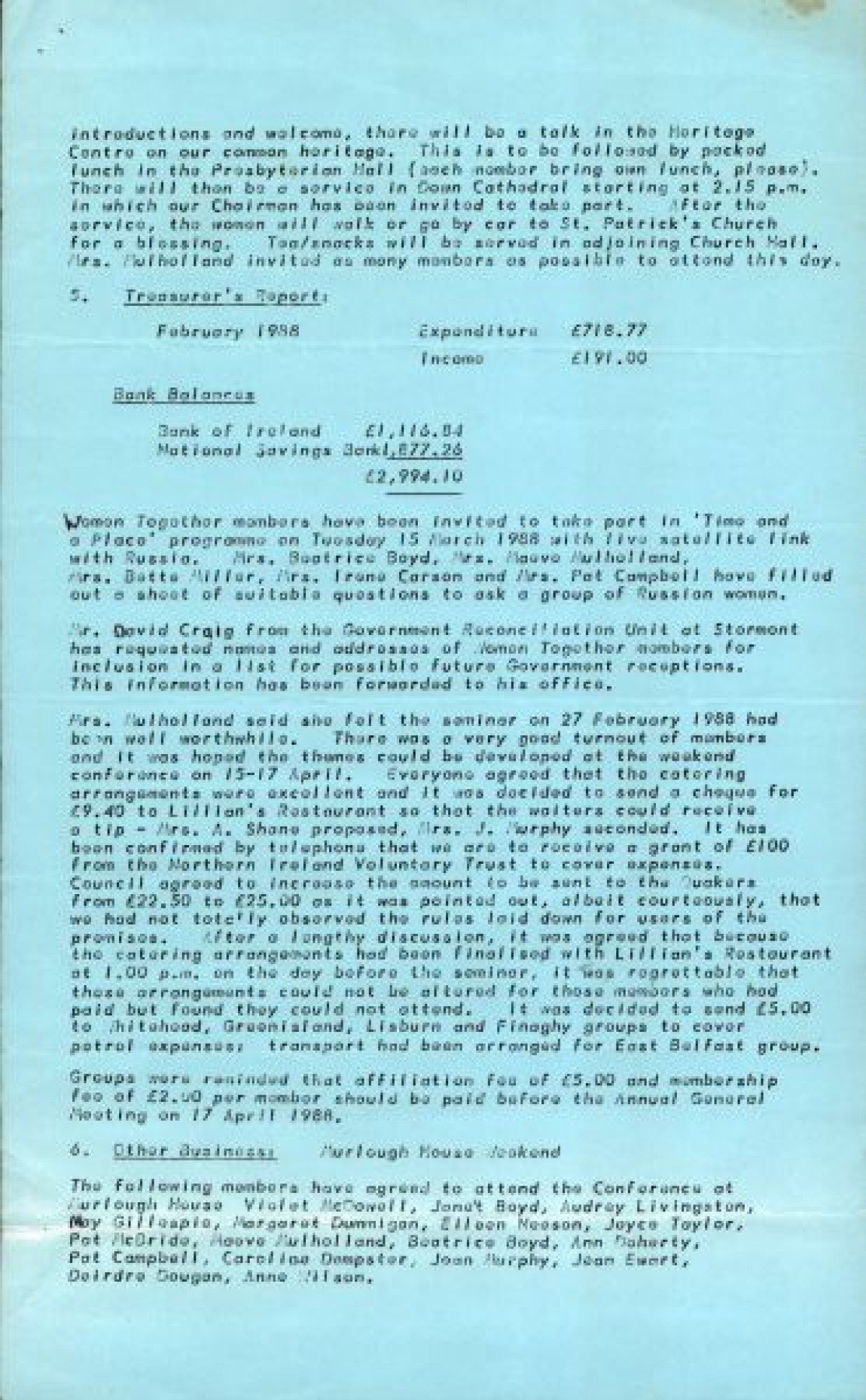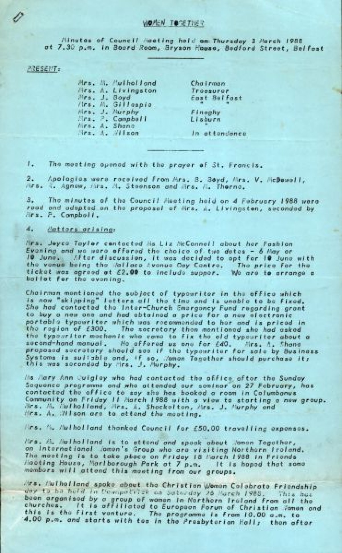 rd March, 1988. Attendees include M. Mulholland, A. Livingston, J. Boyd, M. Gillespie, J. Murphy, P. Campbell, A. Shane, A. Wilson. Matters discussed include a fashion evening and visit of an international women's group. Typed on blue paper.