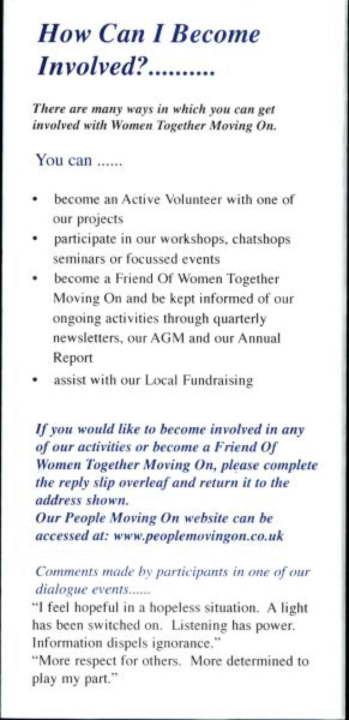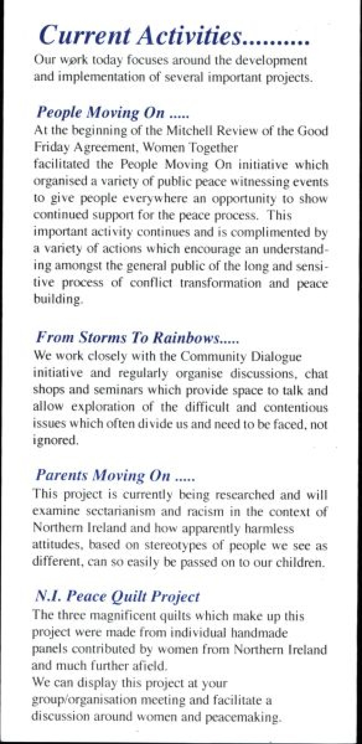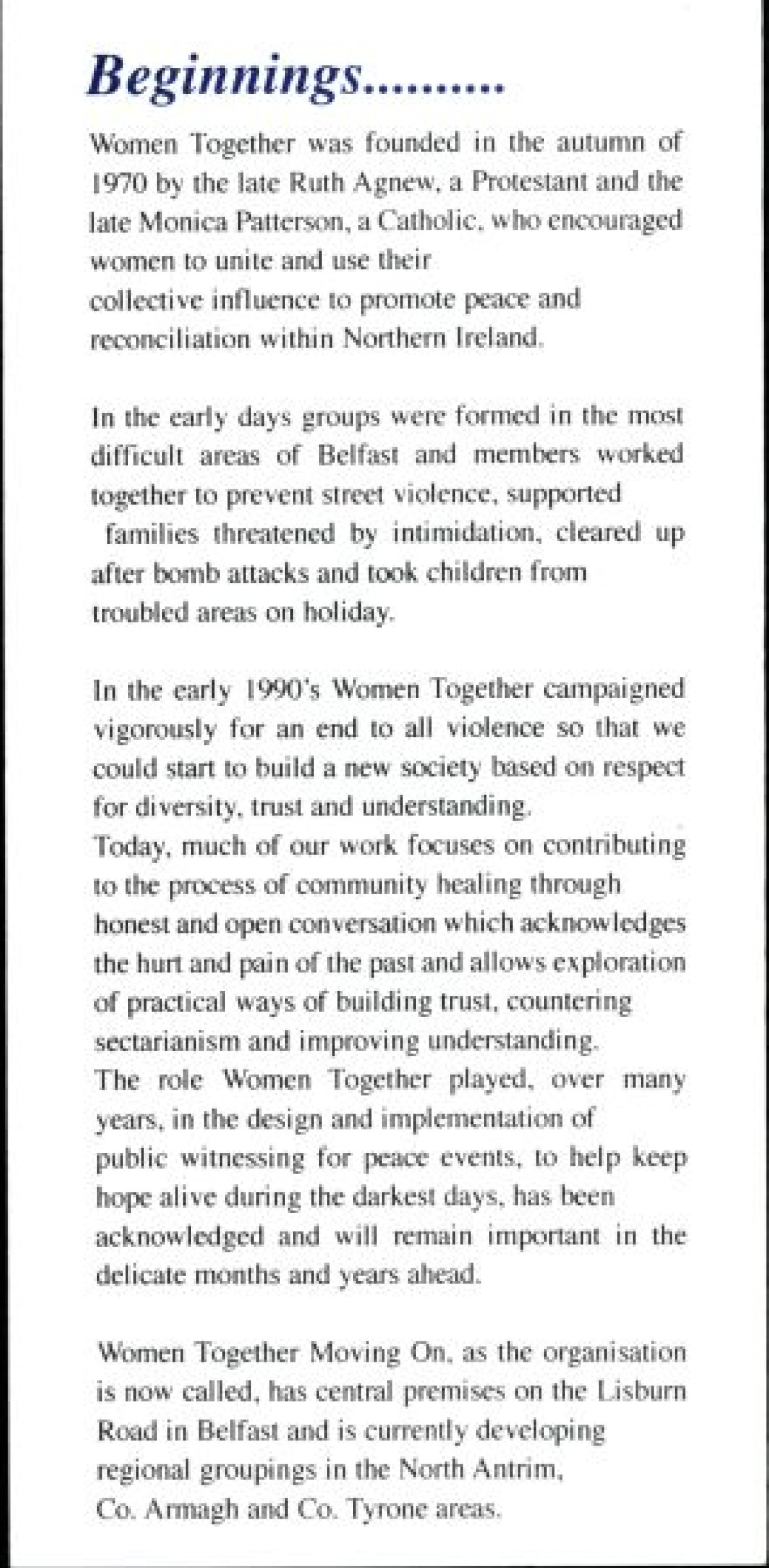 Activism, Communication, Communities, Community, Community Action, Community Care, Community Development, Community Groups, Community Relations, Community Work, Conflict Resolution, Non Violence, Peace, Peace Movement, Reconciliation, Support, Women, Women's Experiences, Women's Groups, Women's Voice