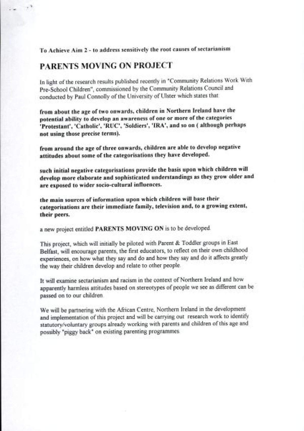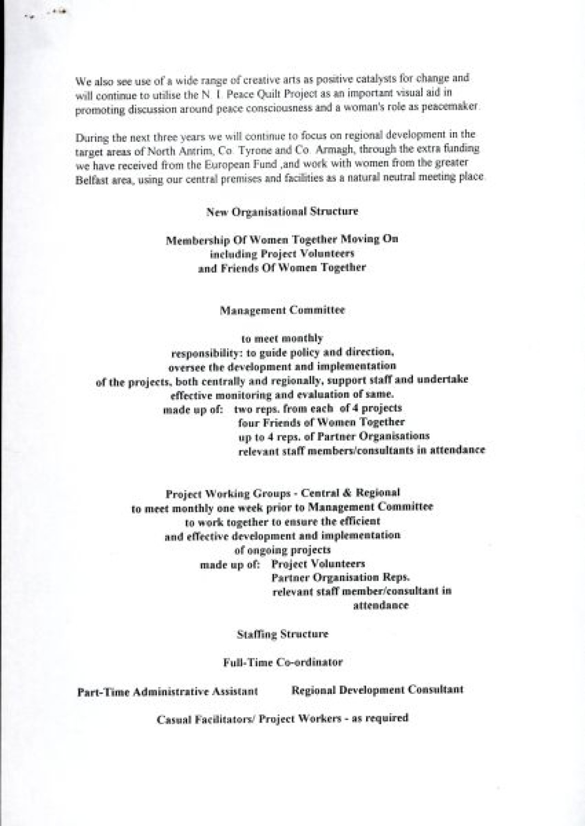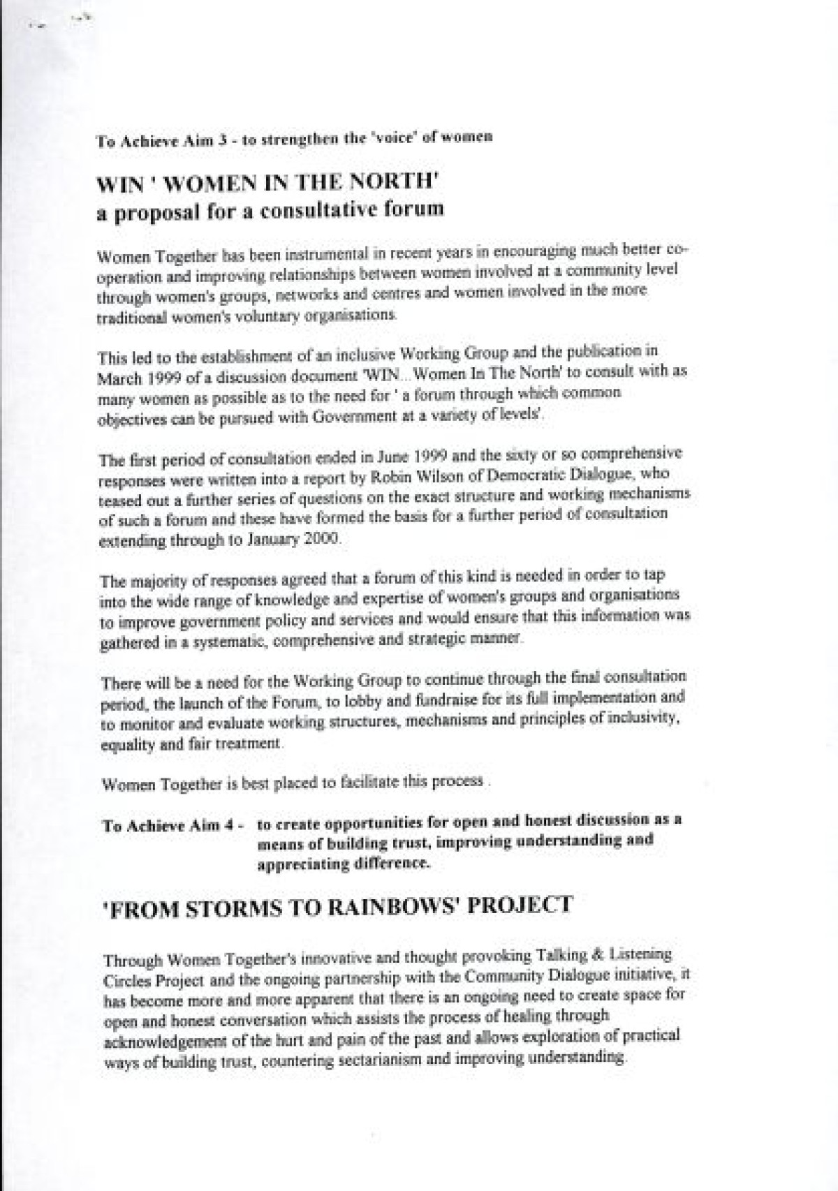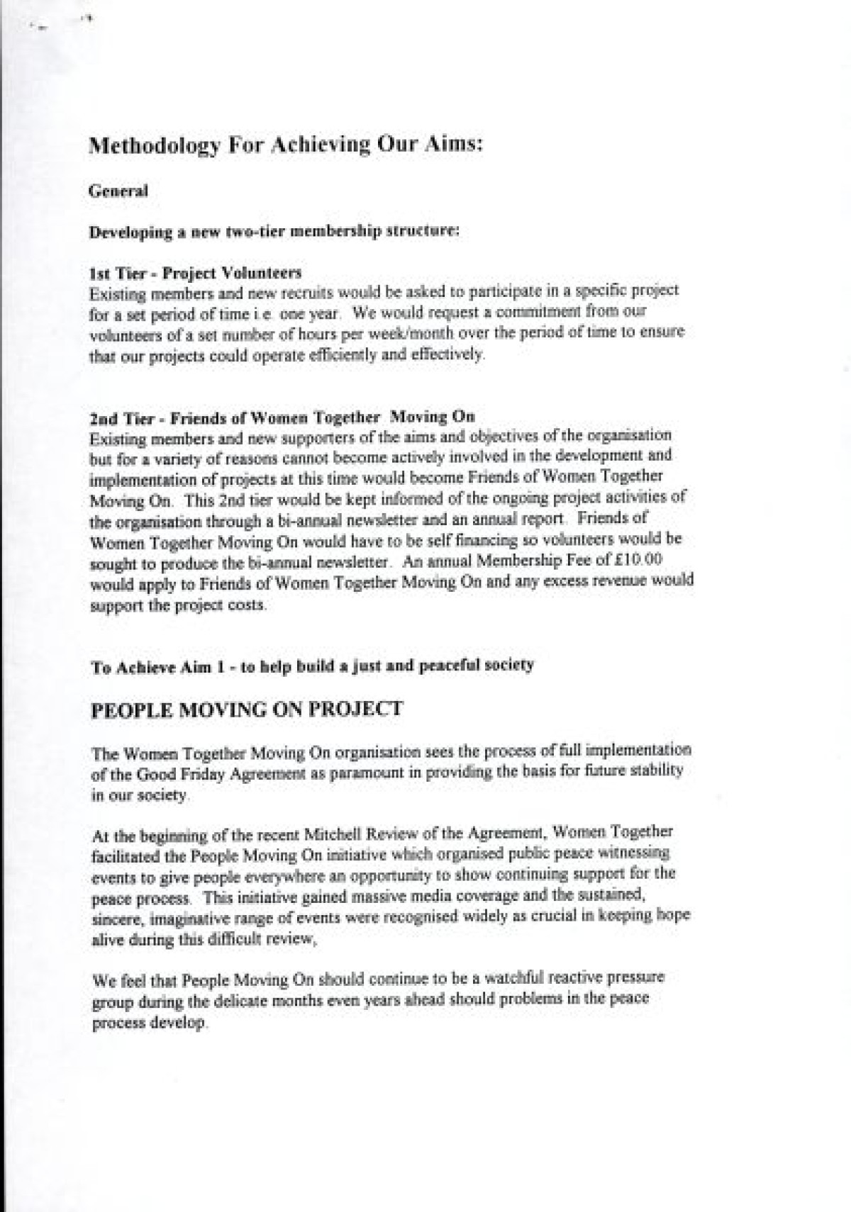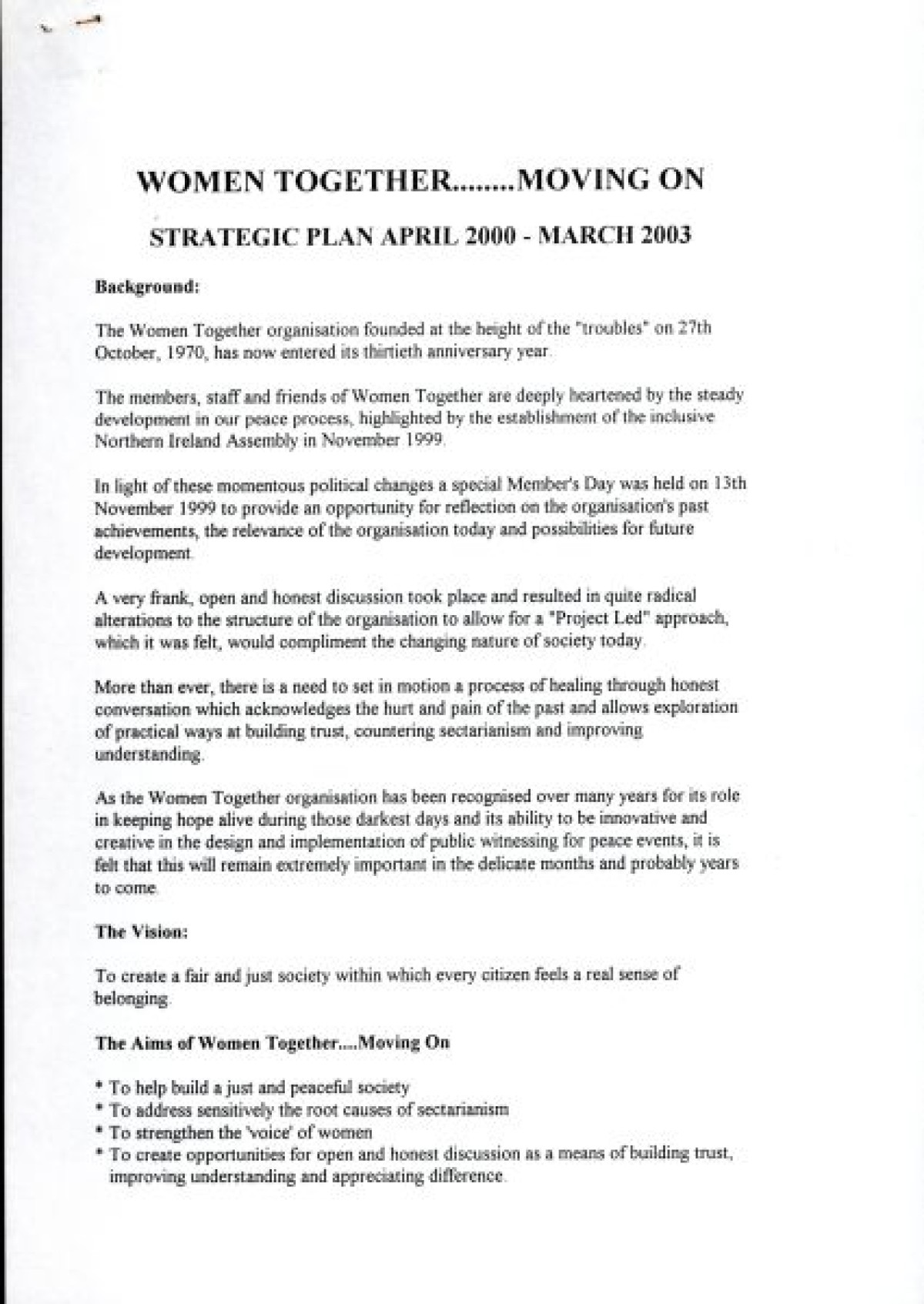 Women Together Moving On which outlines the aims and objectives of the organisation for the period, April 2000 - March 2003. Also included in the plan are proposals for projects such as 'Parents Moving On' and 'From Storms to Rainbows' which aimed to create a space for open and honest conversations surrounding the legacies of the past.