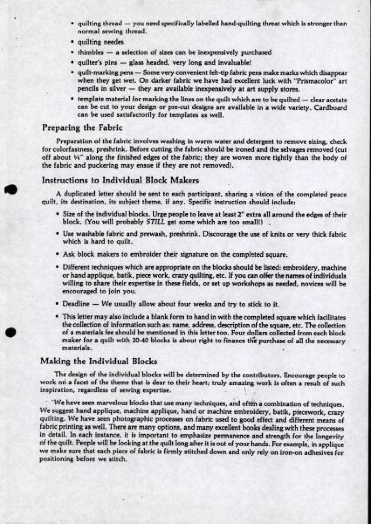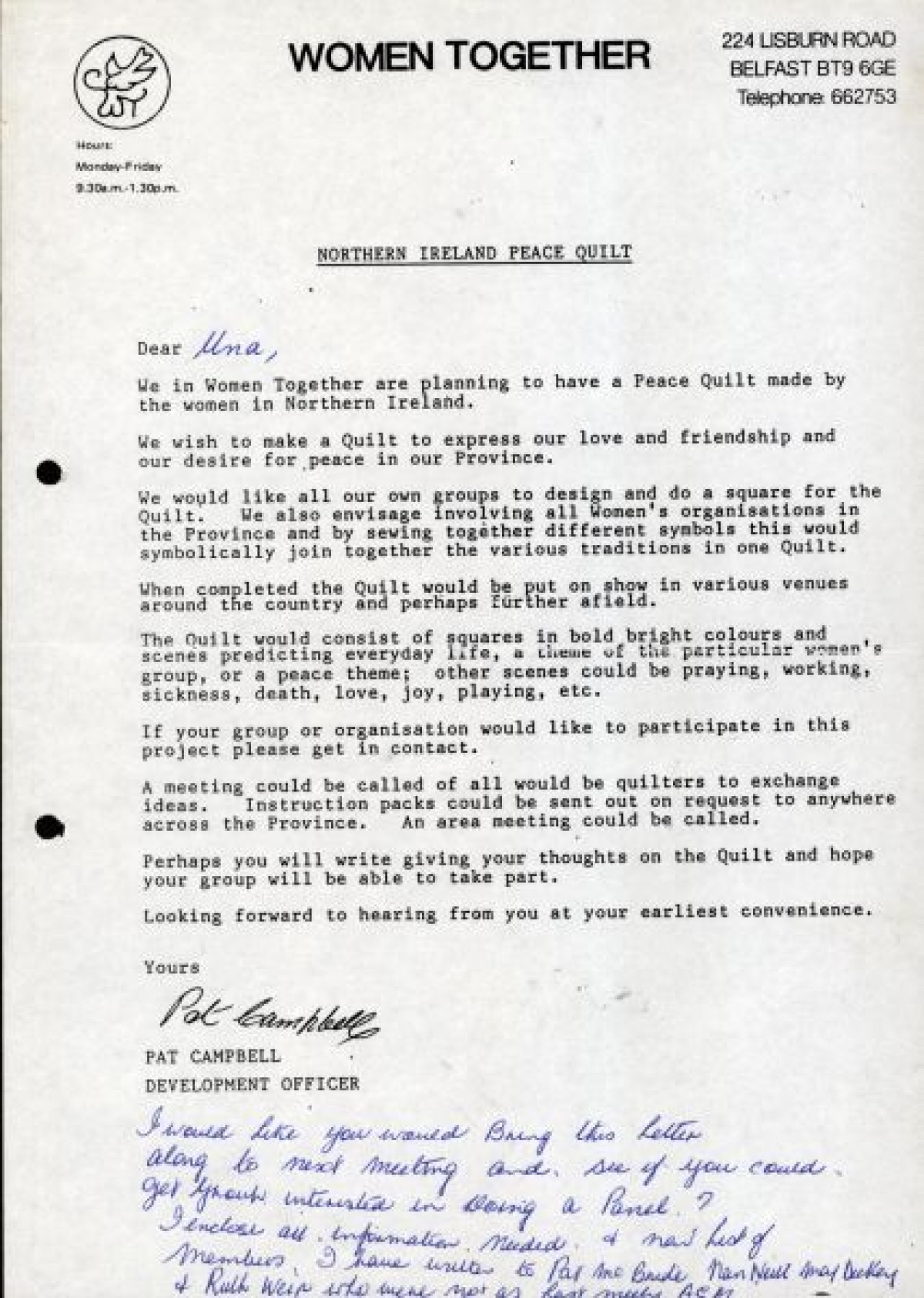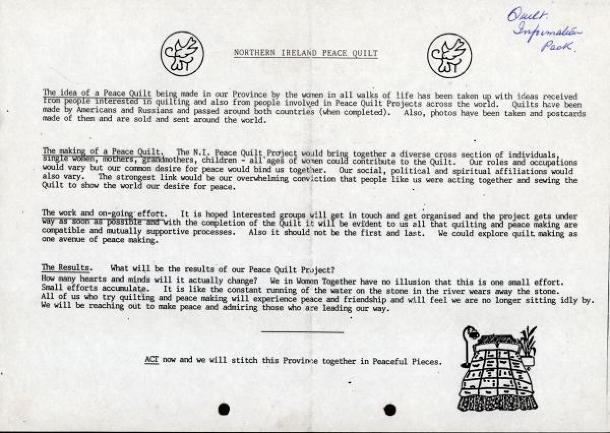 Women Together's 'Northern Ireland Peace Quilt' project. The project involved creating a hand-made quilt sewn by women and women's groups and organisations to 'express love and friendship' and to highlight a 'desire for peace' in the province'. It was envisioned that each square would represent a peace theme or a theme of a particular women's group that would then be symbolically stitched together.
