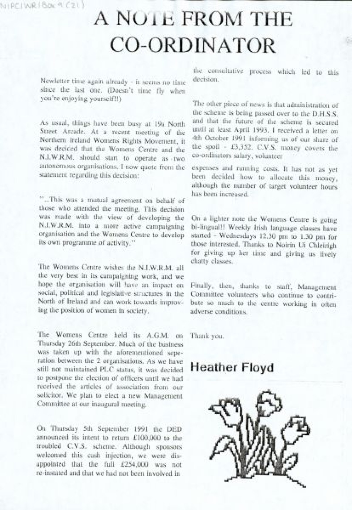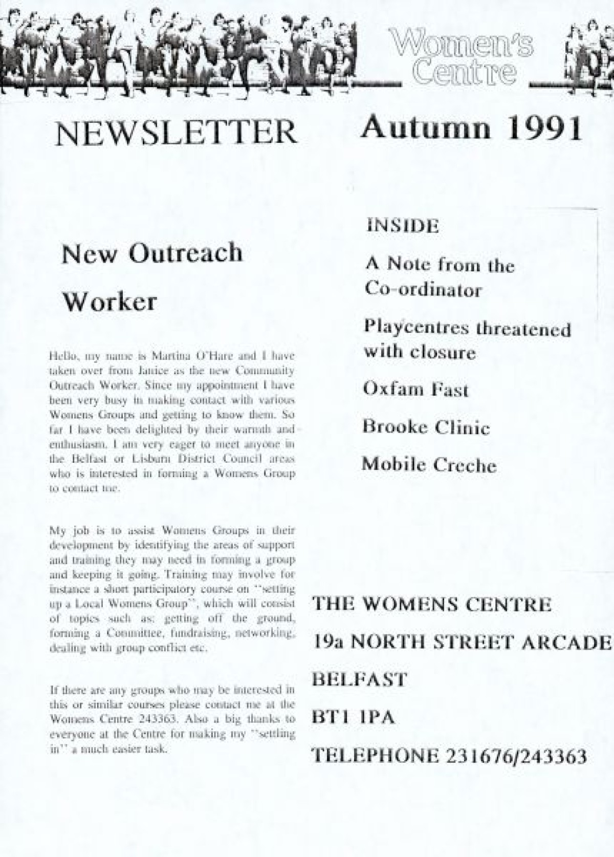 Women's Centre Newsletter, Autumn 1991. Includes an article regarding the appointment of Martina O'Hare as the new outreach worker for the Centre, and the announcement of a mutual agreement reached between the Women's Centre and the