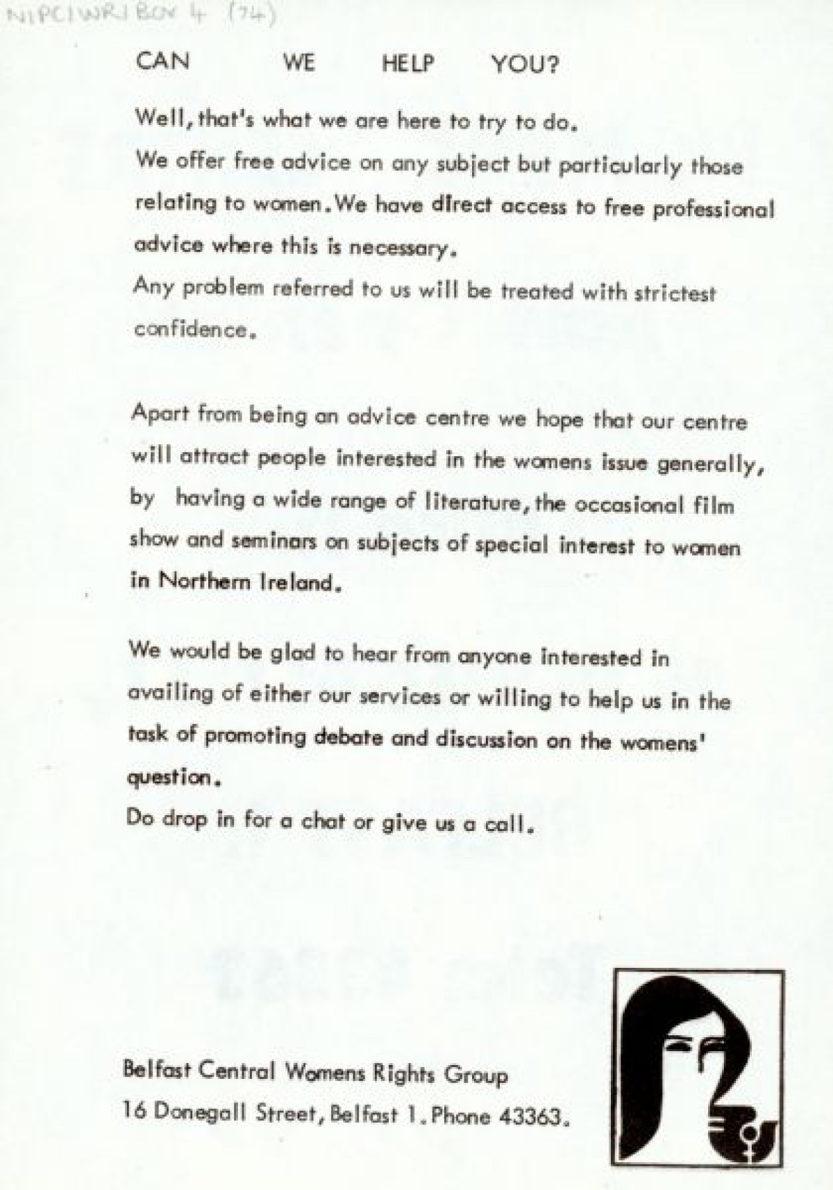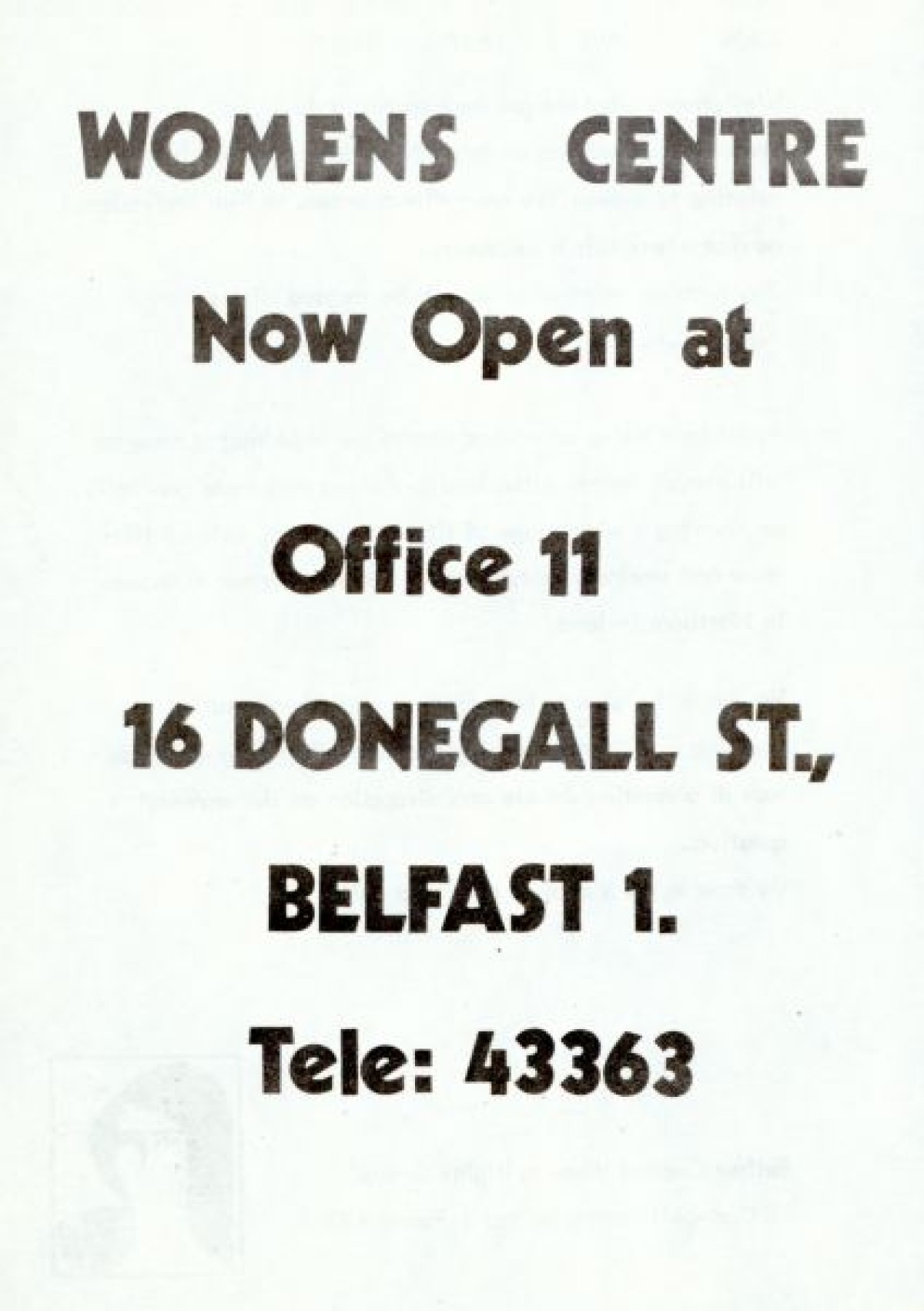 Northern Ireland Women's Rights Movement. The publication outlines the role of the Women's Centre as somewhere for women to seek advice on a variety of issues affecting them, and as somewhere to promote and debate discussion on women's issues.
