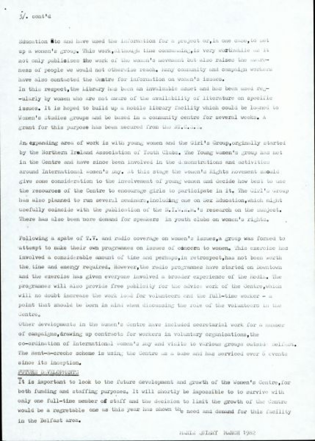 Women's Centre Report by Marie Quiery, March 1982. Features review of different strands of work carried out by the Women's Centre; advice, education, information and resources.
