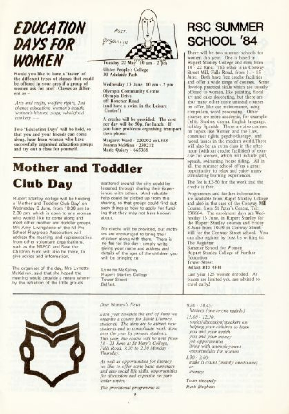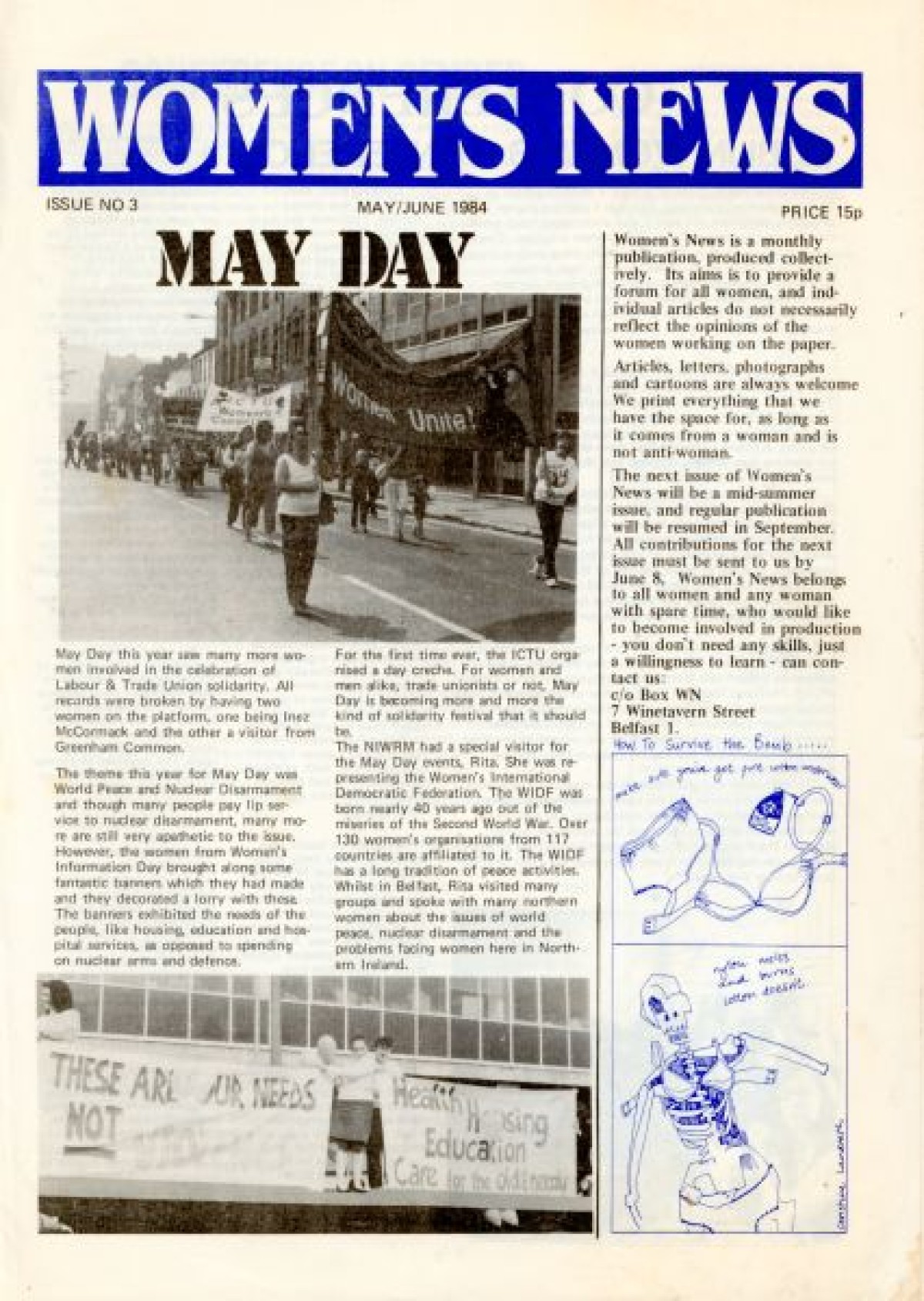 'Women's News' issue No.3, May/June 1984. Publication featuring May Day conferences held internationally, abortion, Ford sex-discrimination case, strip-searches, welfare, health fair, PMT (Pre-Menstrual Tension).