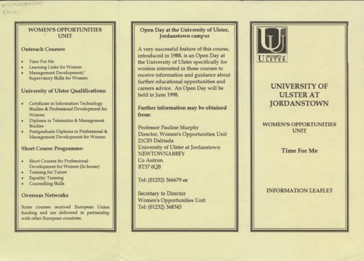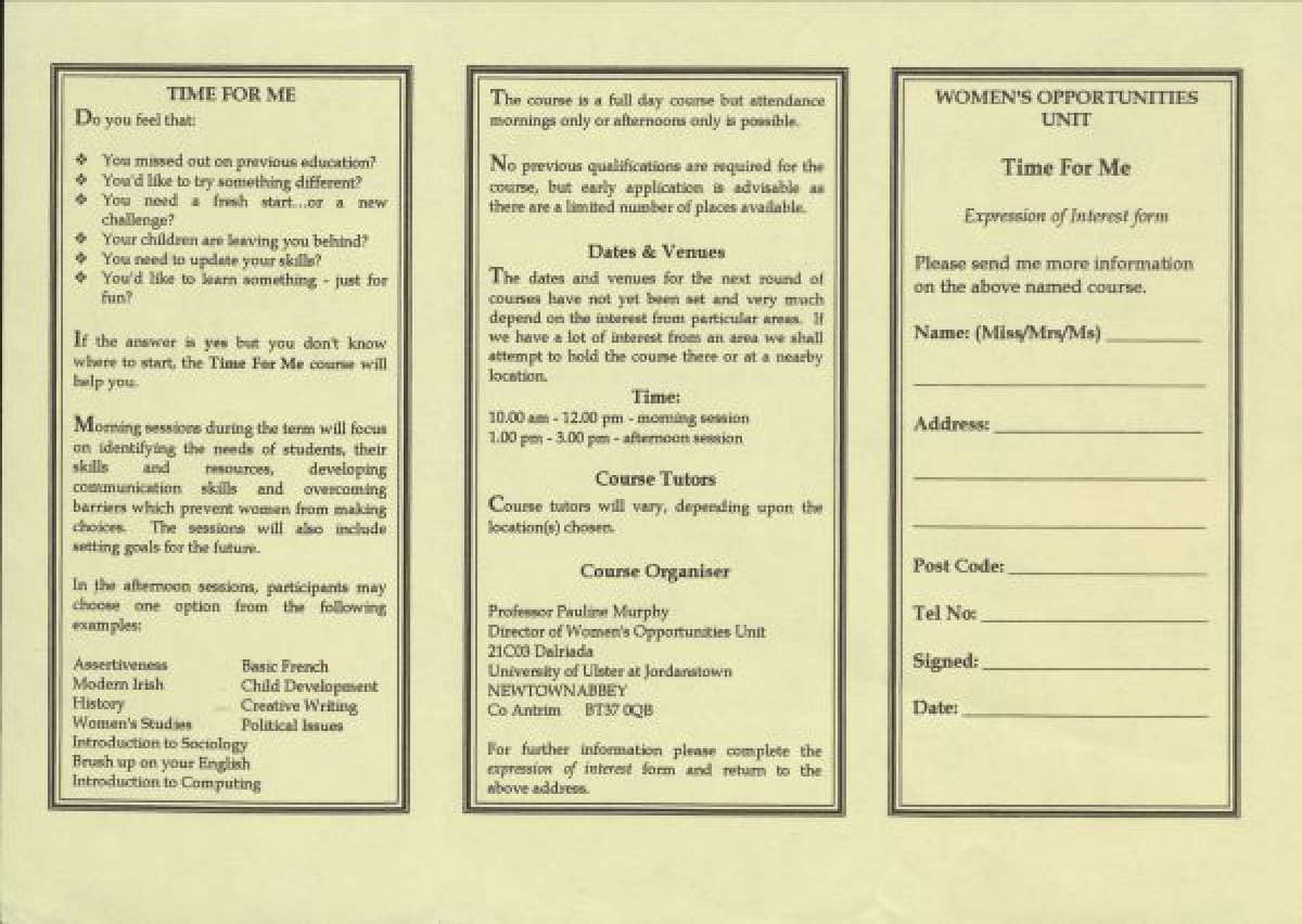Promotional pamphlet for a women's education course, titled "Time for Me," organised by Pauline Murphy at the University of Ulster, Jordanstown. Contains a descriptive outline of morning and afternoon sessions, with details of courses, venues and dates. Includes an application form and information about expanded course choices, including an Introduction to Computing, Political Issues, Child Development, Basic French, Creative Writing, Women's Studies, Modern Irish, English, History, Sociology, and Assertiveness.