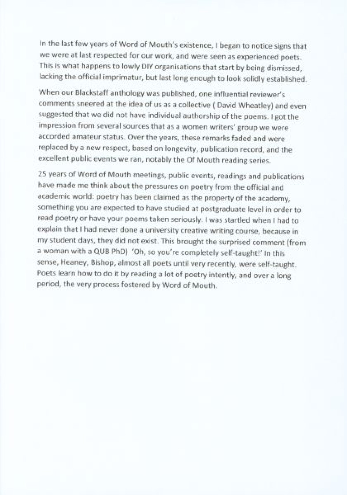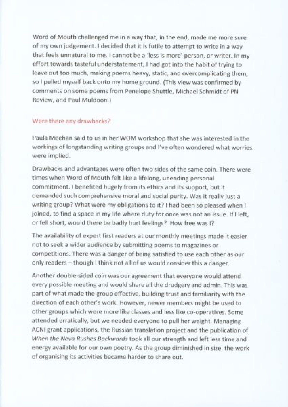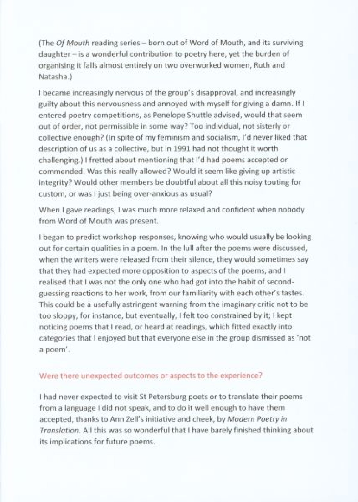 Word of Mouth Poetry Collective on her poetry and confidence in publishing, receiving peer feedback from members, inspiration, drawbacks to the group, and unexpected outcomes, including a visit to St Petersburg.