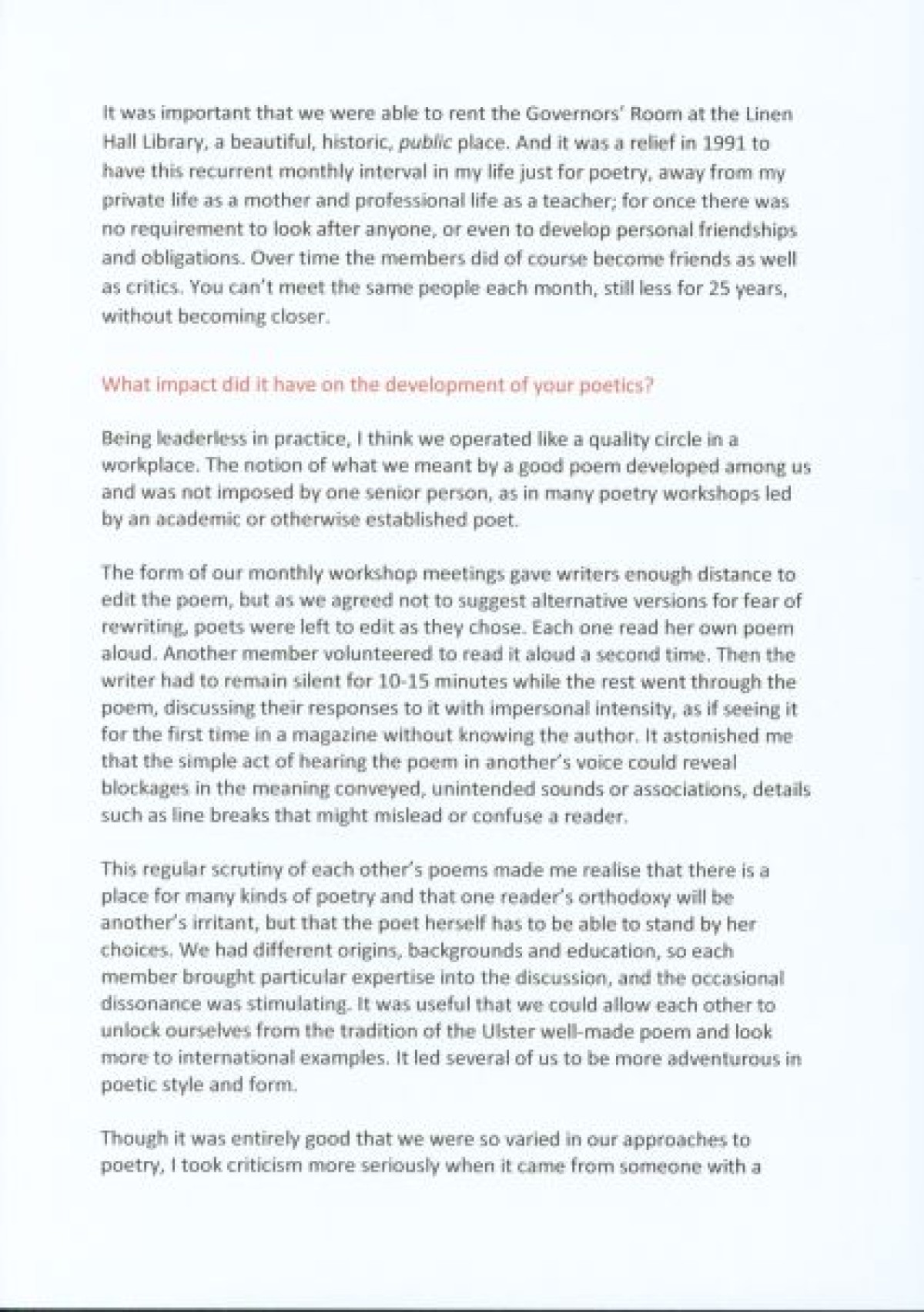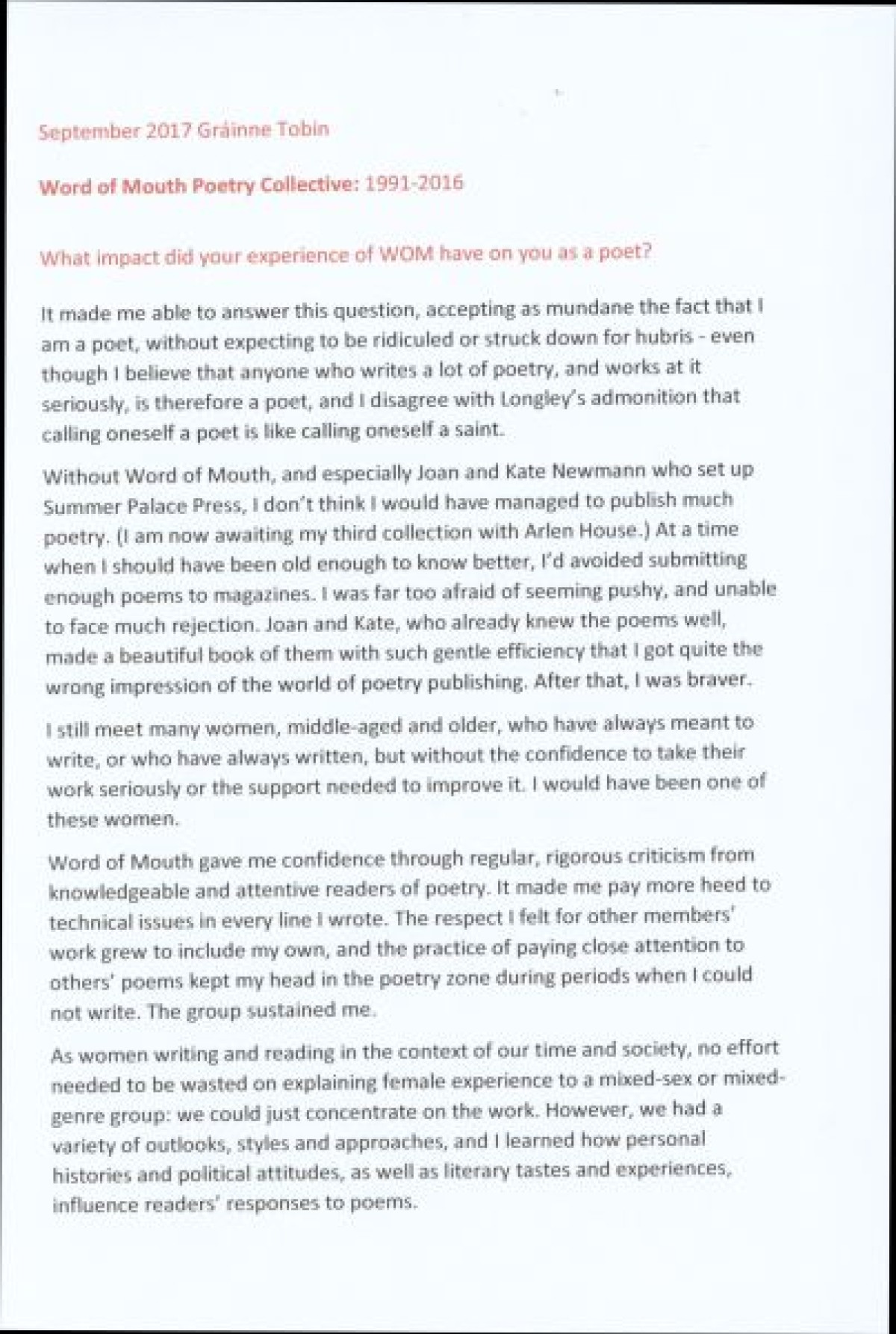 Printed interview with GrĂ¡inne Tobin, discussing the impact of