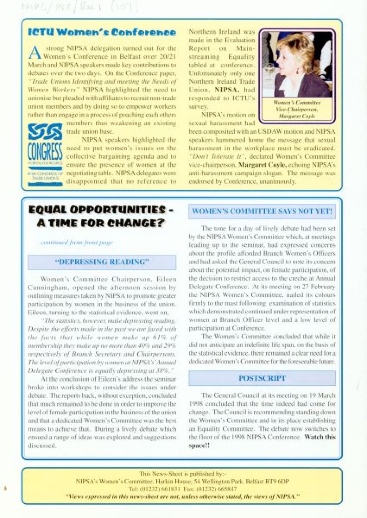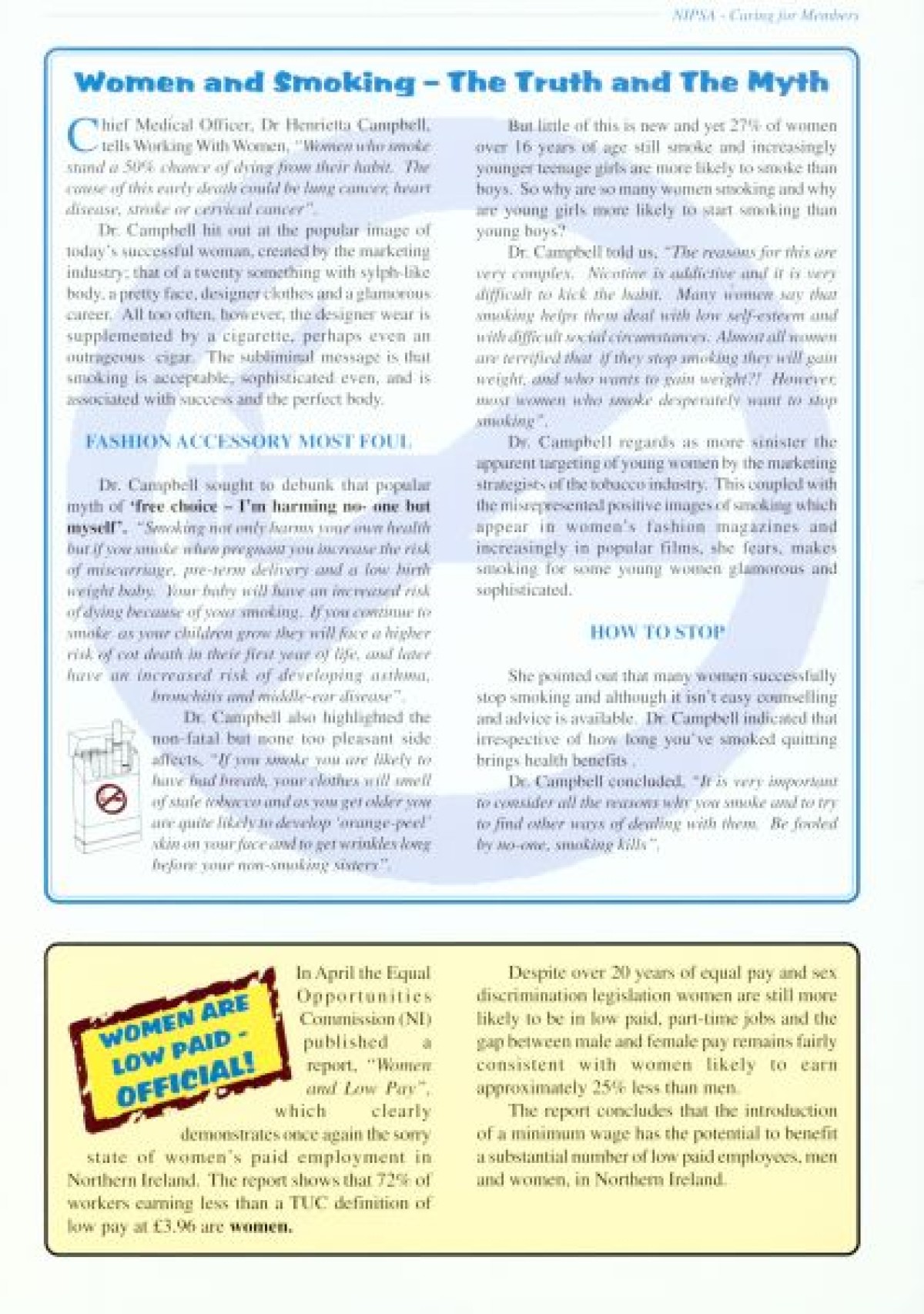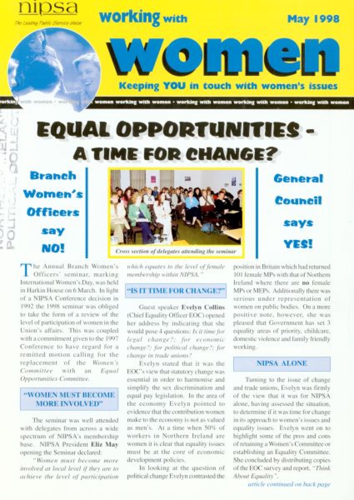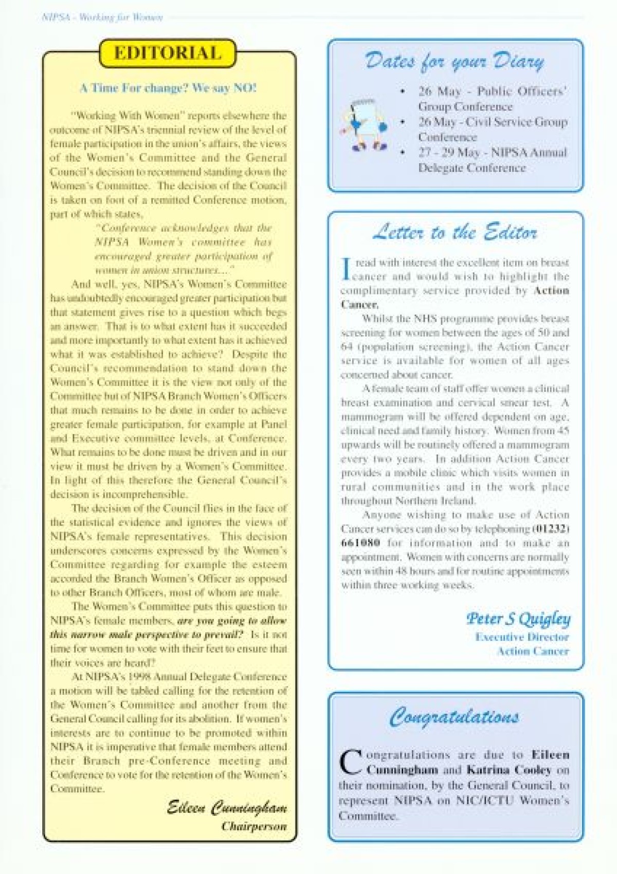 Northern Ireland Public Service Alliance (NIPSA), May 1998. Contains an article about the NIPSA Annual Branch Women's Officer's seminar for International Women's Day, which featured discussion about women's involvement in the organisation, and statutory change to simplify sex discrimination and equal pay acts. Also contains an editorial about retaining the NIPSA Women's Committee, by chairperson Eileen Cunningham; letter to the editor from Action Cancer executive director Peter Quigley; an article about women and smoking; and the Irish Congress of Trade Unions Women's Conference.